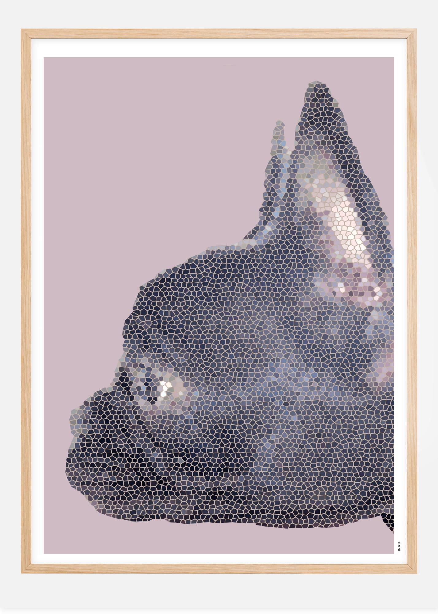 Ένα μωσαϊκό σε ασπρόμαυρο με έναν καρολίνο σκύλο. Στο ροζ φόντο, το φυσικό φως αντανακλάται στο αυτί και το μάτι του σκύλου. Με την ισχυρή του γραμμή σαγονιών και τα μυτερά του αυτιά, ο σκύλος κοιτάζει στα αριστερά της εκτύπωσης σαν να κοιτάζει κάποιον. Μια όμορφη αφίσα που ταιριάζει καλά για τους λάτρεις των ζώων.