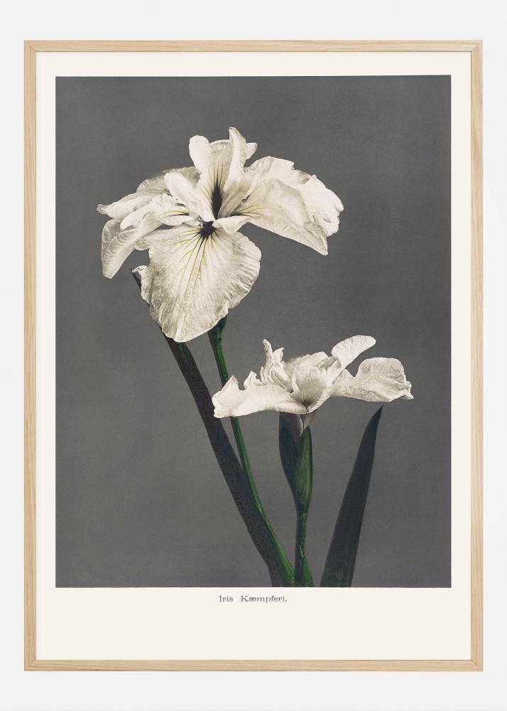 Αυτή η κομψή αφίσα παρουσιάζει την Ίριδα Kaempferi, επίσης γνωστή ως ιαπωνική ίριδα, σε αποχρώσεις του αχνόχρυσου και του λευκού σε μια διακριτική γκρι φόντο που ενισχύει τις γλυπτικές ποιότητες αυτών των μαγευτικών λουλουδιών. Οι λεπτομέρειες της δομής των λουλουδιών είναι όμορφα τονισμένες με σκιές και φως που παίζουν πάνω στα πέταλα, ενώ σκούρες, σχεδόν μαύρες γραμμές στην καρδιά του λουλουδιού προσδίδουν βάθος και διάσταση. Μια αρμονική σύνθεση χρώματος και μορφής που αναδημιουργεί την φυσική ομορφιά αυτών των λουλουδιών.