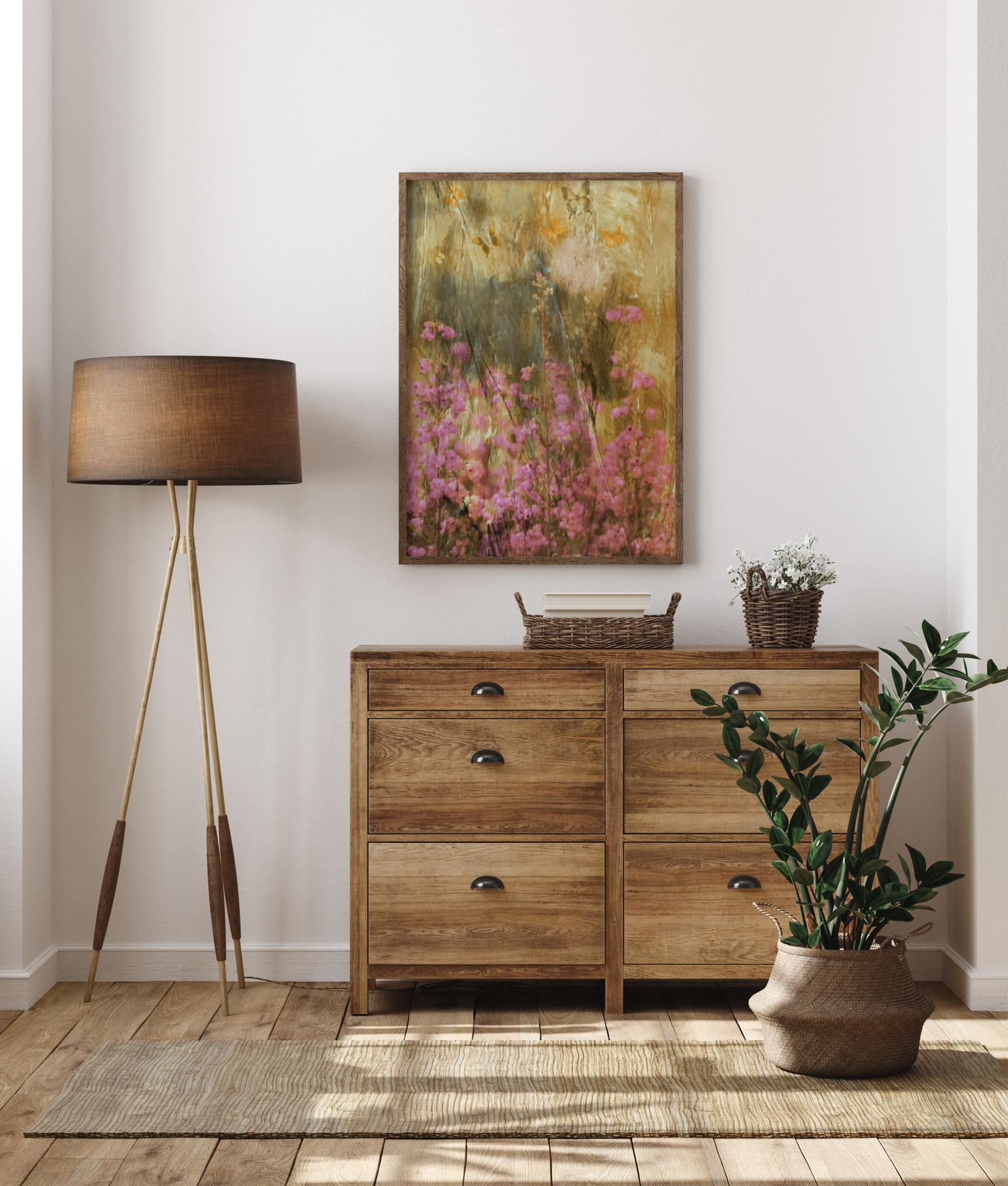 Μια όμορφη αφίσα φύσης που απεικονίζει την άνοιξη με ροζ και καφέ αποξηραμένα χόρτα σε ένα πεδίο. Τα απαλά παστέλ χρώματα δίνουν μια χαλαρωτική και γαλήνια αίσθηση. Τα απαλά, ροζ παστέλ λουλούδια γεμίζουν την εικόνα με τις όμορφες καφέ πεταλούδες που πετούν στο βάθος. Αυτή είναι μια υπέροχη εικόνα για κάθε δωμάτιο στο σπίτι αν εκτιμάτε τη φύση.