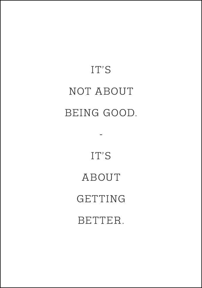 Μια ασπρόμαυρη αφίσα κινήτρων με ένα απλό αλλά εντυπωσιακό μήνυμα. Δεν πρόκειται για το να είσαι καλός, αλλά για το να γίνεσαι καλύτερος. Ένα απλό μήνυμα που ενθαρρύνει τον αναγνώστη να αντιμετωπίσει τη ζωή χαλαρά με στόχο να βελτιωθεί στην καθημερινότητα.