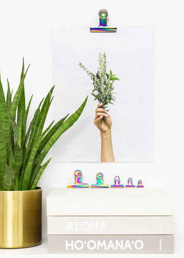 Ένα υπέροχα πολύχρωμο μεταλλικό κλιπ με γυαλιστερό φινίρισμα που προσφέρει στις αφίσες και τις εκτυπώσεις σας μια μοντέρνα και κάπως διαφορετική ανάρτηση. Το ισχυρό, αλλά ευέλικτο, άνοιγμα του κλιπ αφίσας σας επιτρέπει να στερεώσετε το πιο λεπτό χαρτί καθώς και αφίσες με λίγο μεγαλύτερο πάχος. Και αν έχετε μια μεγάλη αφίσα που θέλετε να κρεμάσετε, απλά χρησιμοποιήστε δύο μεταλλικά κλιπ. Ο σχεδιασμός του κλιπ αφίσας είναι κομψός και λιτός, και χάρη στις τρύπες στην στρογγυλή κορυφή μπορείτε εύκολα να το κρεμάσετε στον τοίχο με τη βοήθεια μιας μικρής καρφίτσας ή βίδας.