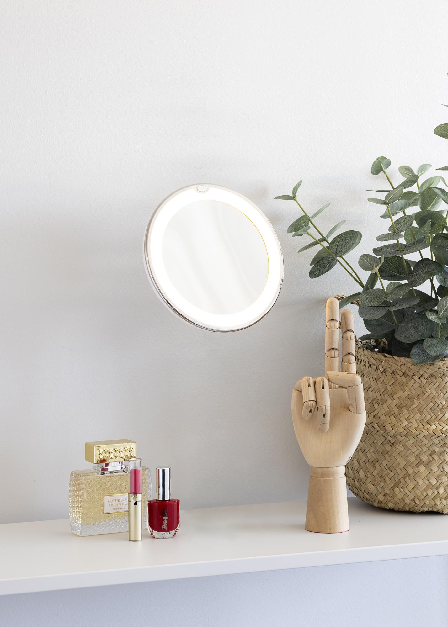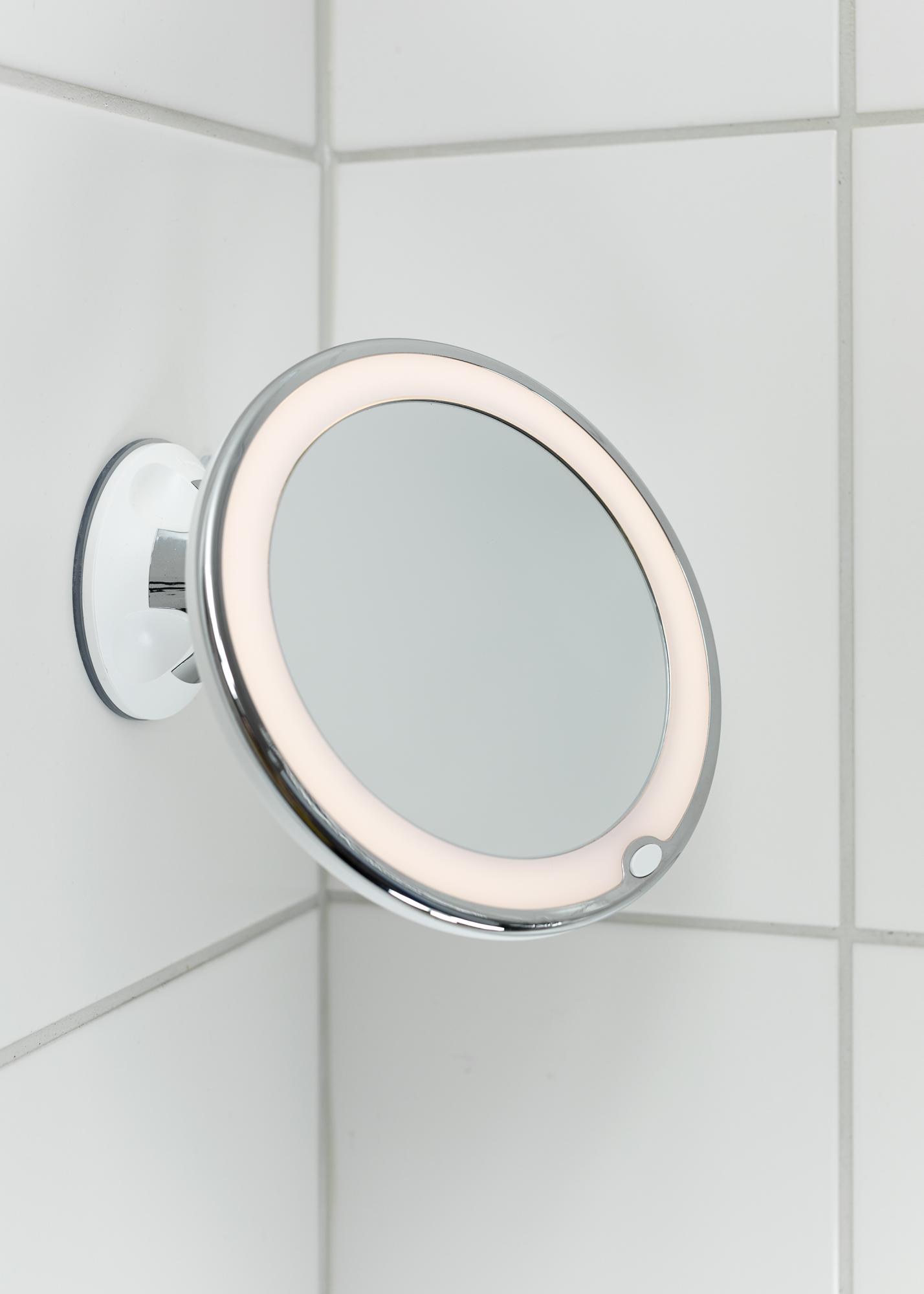 Αυτή είναι μια κλασική καθρέφτης μπάνιου από την KAILA σε μια κομψή σχεδίαση. Ο κομψός καθρέφτης έχει ενσωματωμένο φωτισμό LED που πλαισιώνει το γυαλί του καθρέφτη. Ο καθρέφτης μπάνιου έχει διάμετρο 17 cm και διαθέτει γυαλί με μεγέθυνση 5x. Με άλλα λόγια, αυτός ο καθρέφτης είναι εξαιρετικός για μια καθαρή κοντινή όψη του προσώπου σας! Ο καθρέφτης είναι διακοσμητικός ως στοιχείο εσωτερικής διακόσμησης, αλλά η ευέλικτη σχεδίασή του τον καθιστά εύκολο να αποθηκευτεί όταν δε χρησιμοποιείται. Ο καθρέφτης στερεώνεται με την παρεχόμενη βεντούζα στον τοίχο, το πλακάκι ή το τραπέζι. Η βεντούζα είναι κλειδωμένη και εξασφαλίζει ότι ο καθρέφτης είναι σταθερός. Παραδίδεται ασυναρμολόγητος.