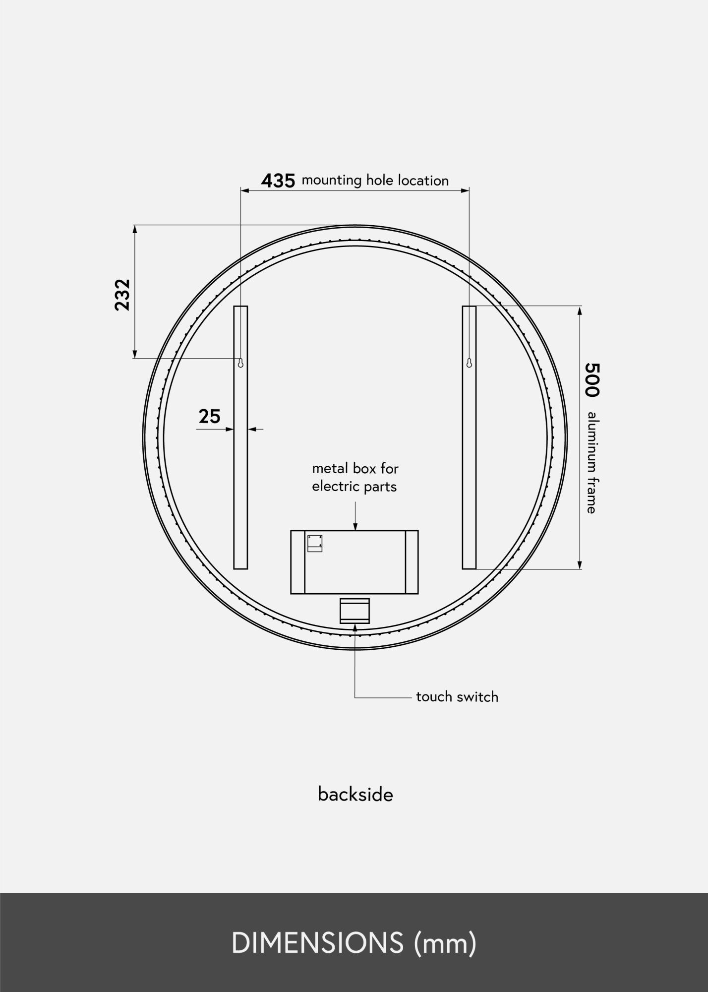 Ο επιτοίχιος καθρέφτης έχει επιφάνεια καθρέφτη με διάμετρο 78,5 εκ. Είναι σχεδιασμένος για μόνιμη εγκατάσταση και συνδέεται με διακόπτη. Για να λειτουργήσει σωστά ο καθρέφτης πρέπει να συνδεθεί με έναν απλό διακόπτη, όχι με διακόπτη ρύθμισης φωτεινότητας.