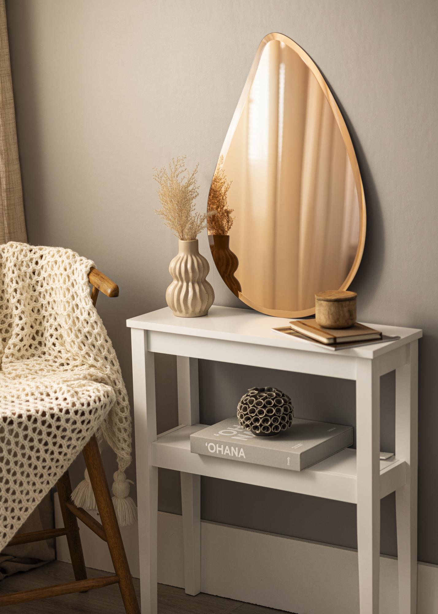Αυτός ο υπέροχος καθρέφτης έχει σχήμα σταγόνας, που του δίνει μια μαλακή και κομψή εμφάνιση. Επιπλέον, ο καθρέφτης είναι εξοπλισμένος με γυαλισμένη άκρη – κάτι που ενισχύει επίσης την αποκλειστική αίσθηση. Αλλά αυτό που ίσως περισσότερο κάνει αυτόν τον καθρέφτη μια πραγματικά μοντέρνα διακοσμητική λεπτομέρεια είναι το εντυπωσιακό και μοντέρνο ροζ χρυσό ανακλαστικό γυαλί!