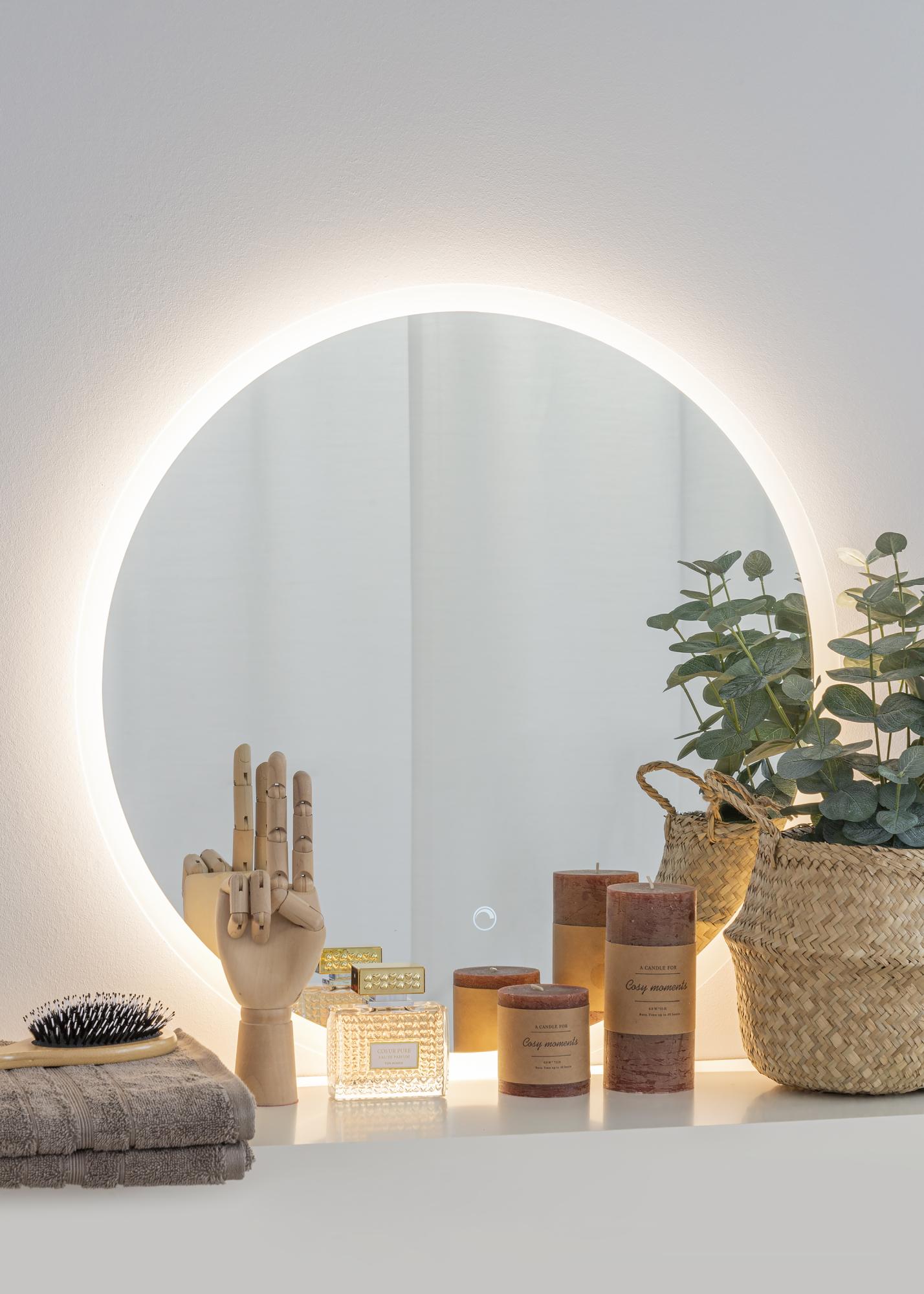 Αυτός είναι ένας κλασικός και κομψός στρογγυλός καθρέφτης μπάνιου. Ο καθρέφτης πλαισιώνεται από έναν παγωμένο περιθώριο με ενσωματωμένο φωτισμό LED. Ο φωτισμός ανάβει πίσω από τον καθρέφτη και εκπέμπει μια ευχάριστη ζεστή λευκή λάμψη μπροστά στα 3000K. Ο φωτισμός είναι ρυθμιζόμενος και μπορείτε εύκολα να προσαρμόσετε την ένταση του φωτισμού κρατώντας πατημένο το κουμπί για μερικά δευτερόλεπτα. Την επόμενη φορά που θα ανάψετε τον φωτισμό, ο καθρέφτης θα θυμάται τη ρύθμιση έντασης που είχε οριστεί. Ο καθρέφτης συνοδεύεται από επιτοίχια στηρίγματα και είναι εγκεκριμένος για χρήση στο μπάνιο. Ο καθρέφτης μπάνιου προορίζεται για μόνιμη εγκατάσταση και συνδέεται με έναν διακόπτη. Για να λειτουργεί σωστά ο καθρέφτης, πρέπει να συνδεθεί με έναν συνηθισμένο διακόπτη, όχι με διακόπτη ρύθμισης έντασης.