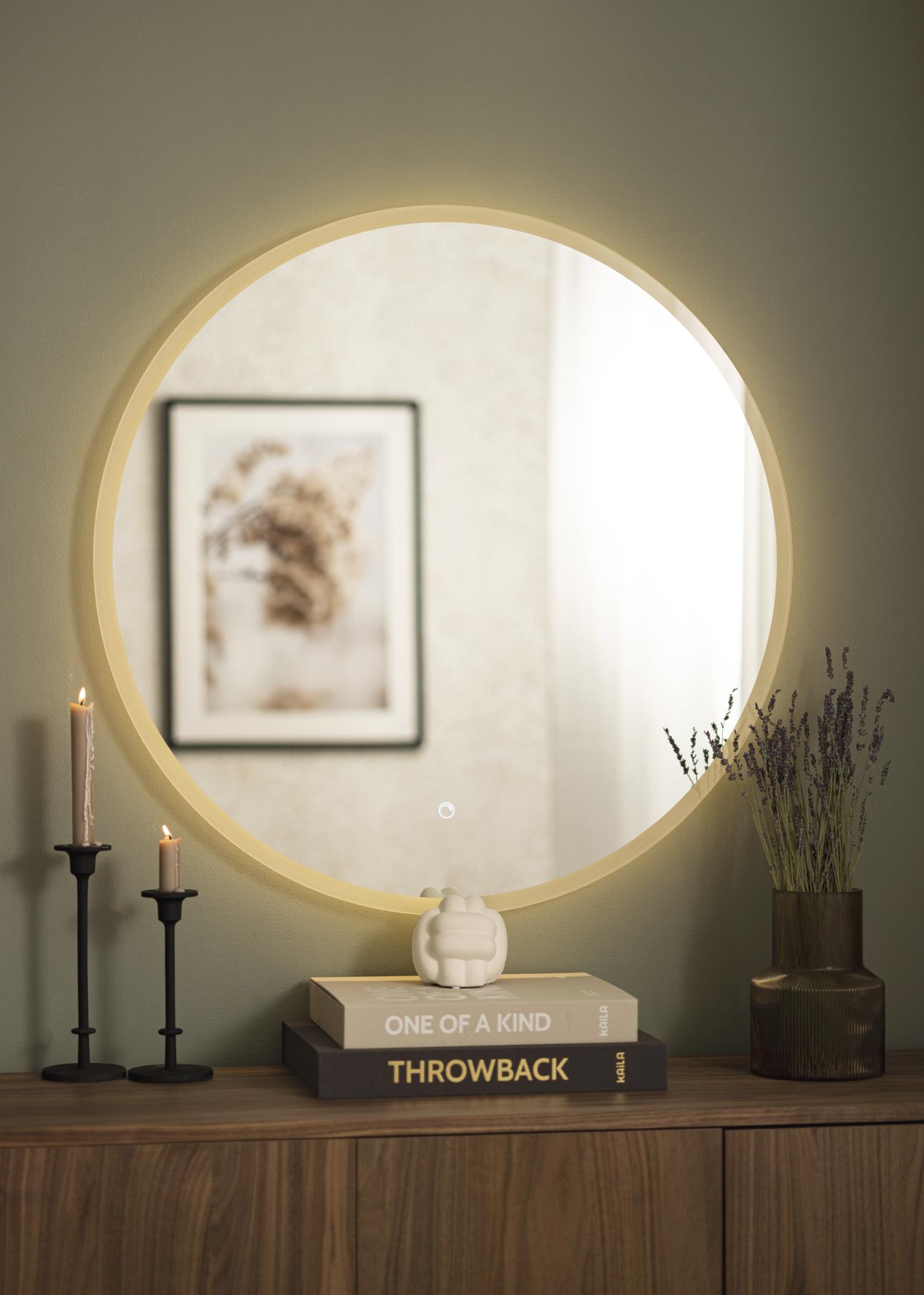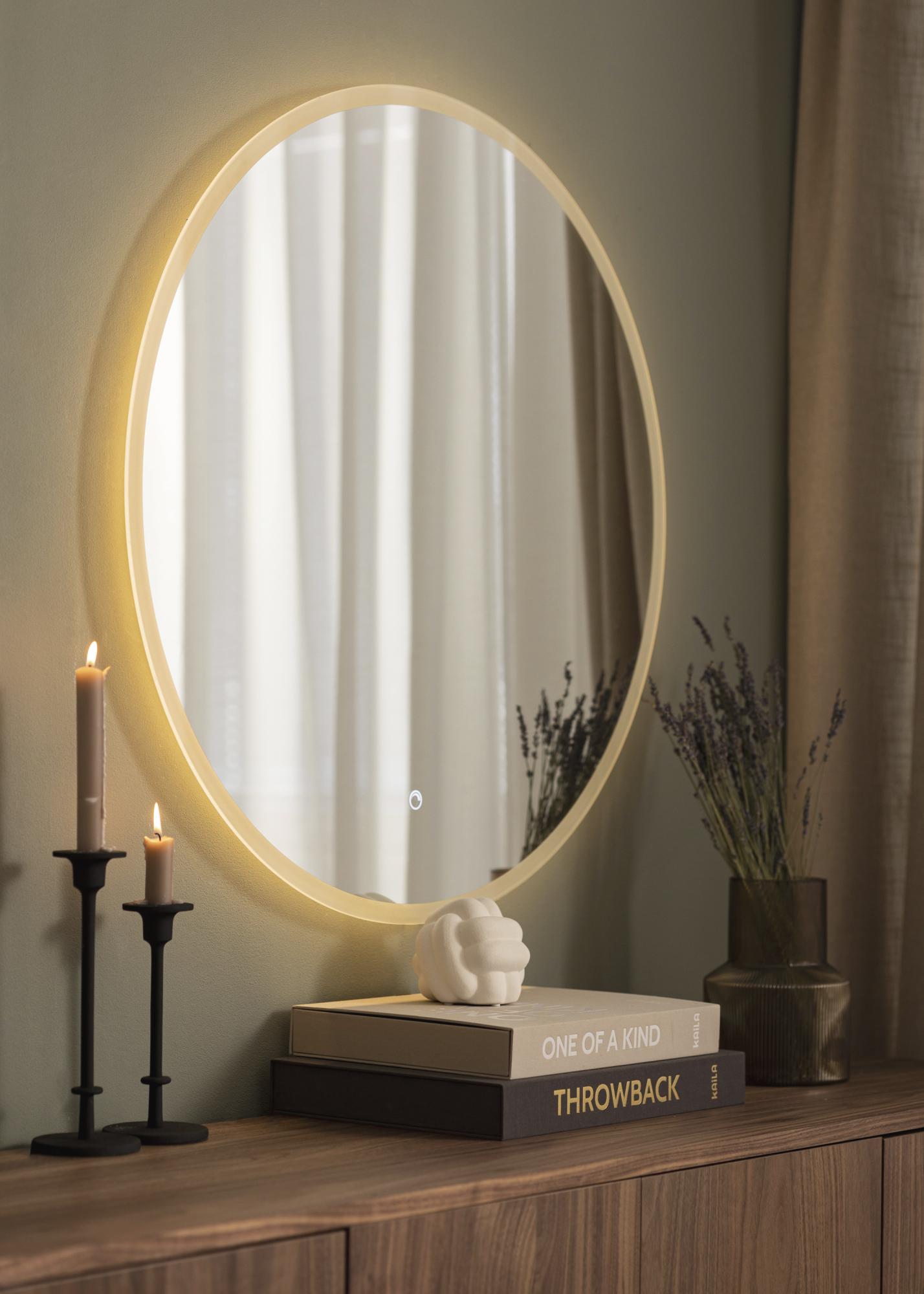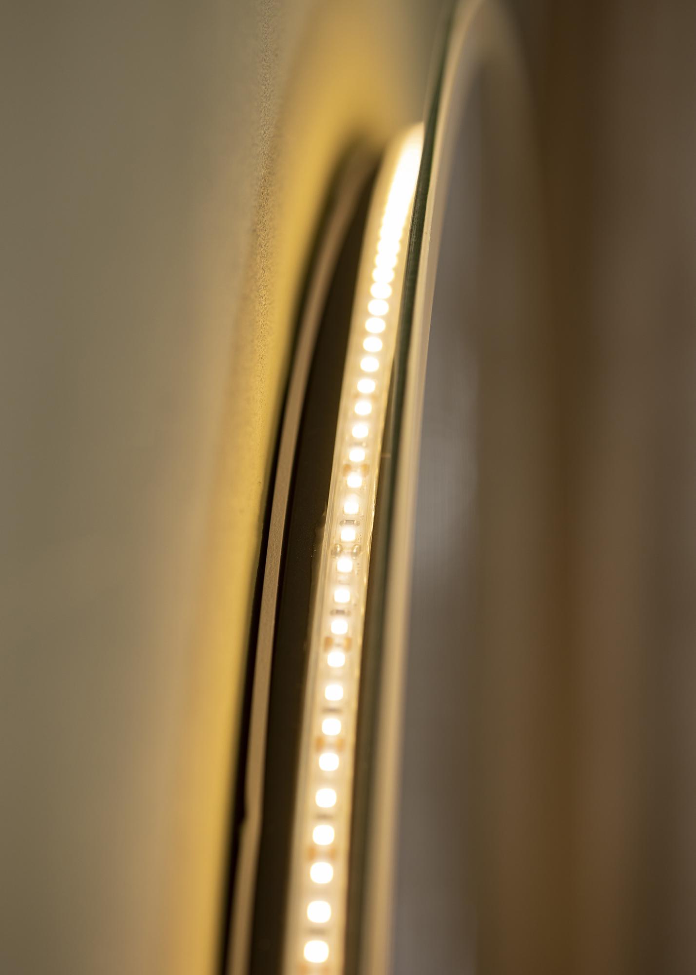 Πρόκειται για έναν κλασικό και κομψό στρογγυλό καθρέφτη μπάνιου. Ο καθρέφτης πλαισιώνεται από ένα παγωμένο περίγραμμα με ενσωματωμένο φωτισμό LED. Ο φωτισμός ανάβει πίσω από τον καθρέφτη και προσφέρει ένα ευχάριστο θερμό λευκό φως προς τα εμπρός στο 3000K. Ο φωτισμός είναι ρυθμιζόμενης έντασης και μπορείτε εύκολα να προσαρμόσετε την ένταση του φωτισμού κρατώντας πατημένο το κουμπί για λίγα δευτερόλεπτα. Την επόμενη φορά που θα ανάψετε τον φωτισμό, ο καθρέφτης θα θυμάται την ένταση φωτός που είχε επιλεχτεί. Ο καθρέφτης διαθέτει τα κατάλληλα στηρίγματα τοίχου και είναι εγκεκριμένος για μπάνιο. Ο καθρέφτης μπάνιου προορίζεται για μόνιμη εγκατάσταση και συνδέεται με έναν διακόπτη. Για να λειτουργήσει σωστά ο καθρέφτης, πρέπει να συνδεθεί σε έναν κανονικό διακόπτη, όχι σε διακόπτη ρύθμισης έντασης.