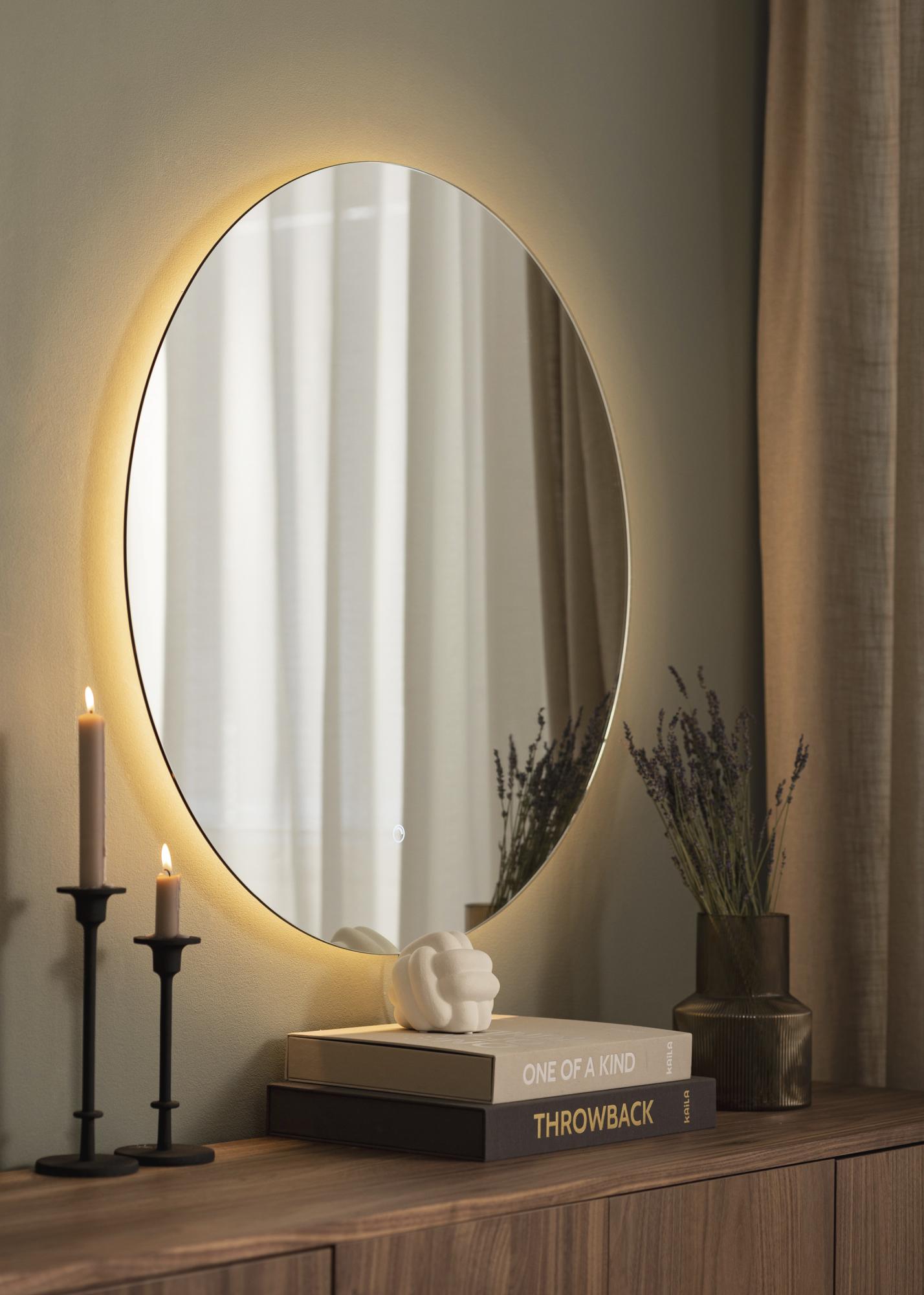 Αυτός είναι ένας κλασικός καθρέφτης μπάνιου σε στρογγυλό σχήμα από τη σουηδική KAILA. Ο καθρέφτης μπάνιου έχει ενσωματωμένο ρυθμιζόμενο φωτισμό LED γύρω από το οποίο φωτίζεται από πίσω και παρέχει ένα ωραίο ζεστό λευκό φως προς τα εμπρός στα 3000K. Ο φωτισμός είναι ρυθμιζόμενος και μπορείτε εύκολα να ρυθμίσετε την ένταση του φωτισμού κρατώντας το κουμπί για λίγα δευτερόλεπτα. Την επόμενη φορά που θα ενεργοποιήσετε το φωτισμό, ο καθρέφτης θυμάται ποια ένταση φωτός ήταν ρυθμισμένη. Το LED είναι μια οικονομική πηγή φωτός που παρέχει ομοιόμορφο και φυσικό φως.