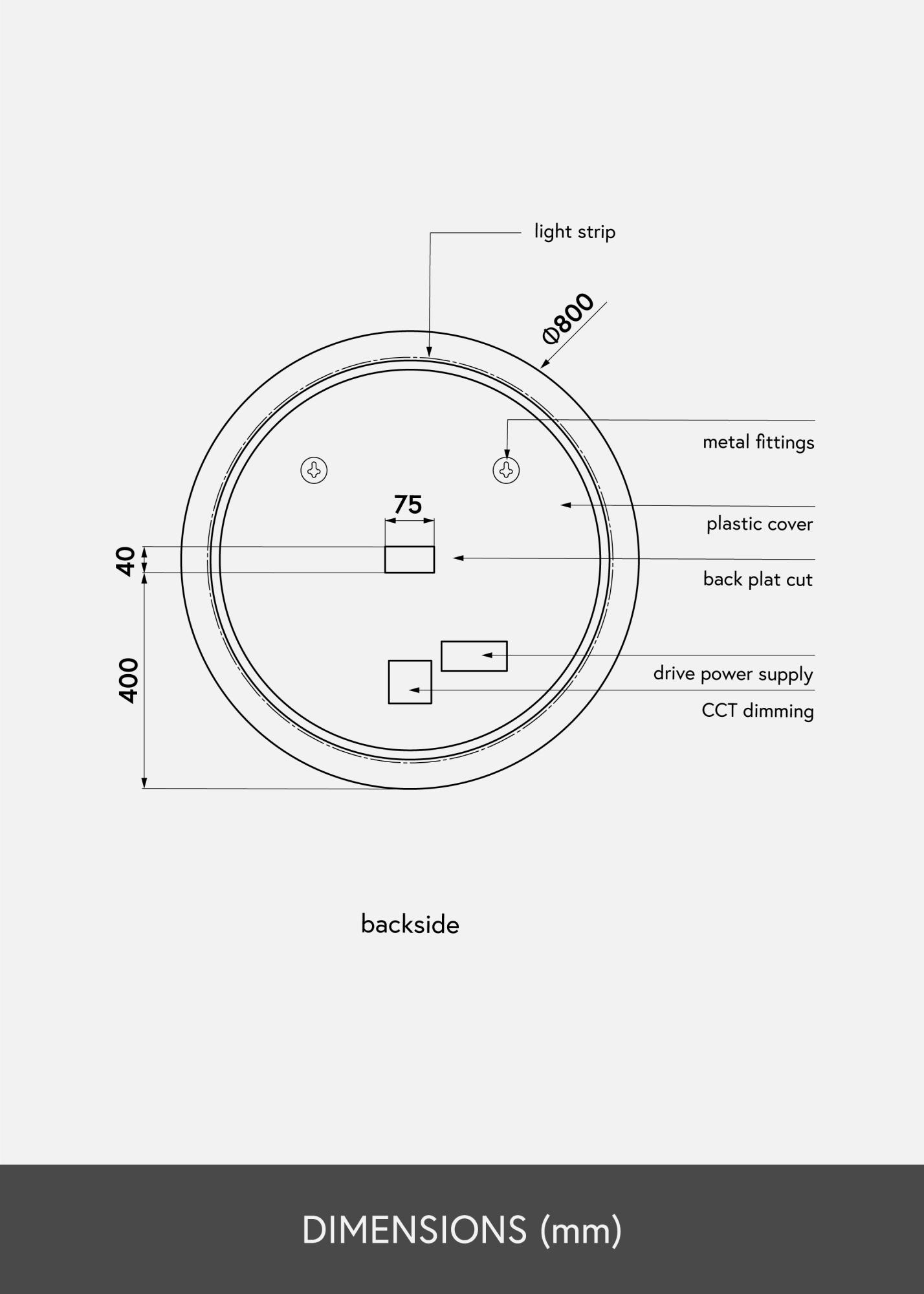 Ο καθρέφτης είναι εγκεκριμένος για μπάνια, αλλά η διαχρονική και κομψή του σχεδίαση ταιριάζει επίσης καλά σε άλλους τοίχους στο σπίτι. Ο καθρέφτης έχει διάμετρο 80 εκ., είναι μόλις 3 εκ. βαθύς και διαθέτει στηρίγματα τοίχου. Ο καθρέφτης προορίζεται για σταθερή εγκατάσταση και συνδέεται με έναν διακόπτη. Για να λειτουργεί σωστά ο καθρέφτης, πρέπει να συνδεθεί σε έναν κανονικό διακόπτη, όχι σε διακόπτη ρύθμισης έντασης φωτισμού.