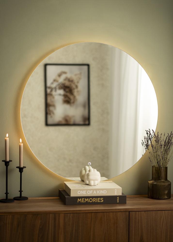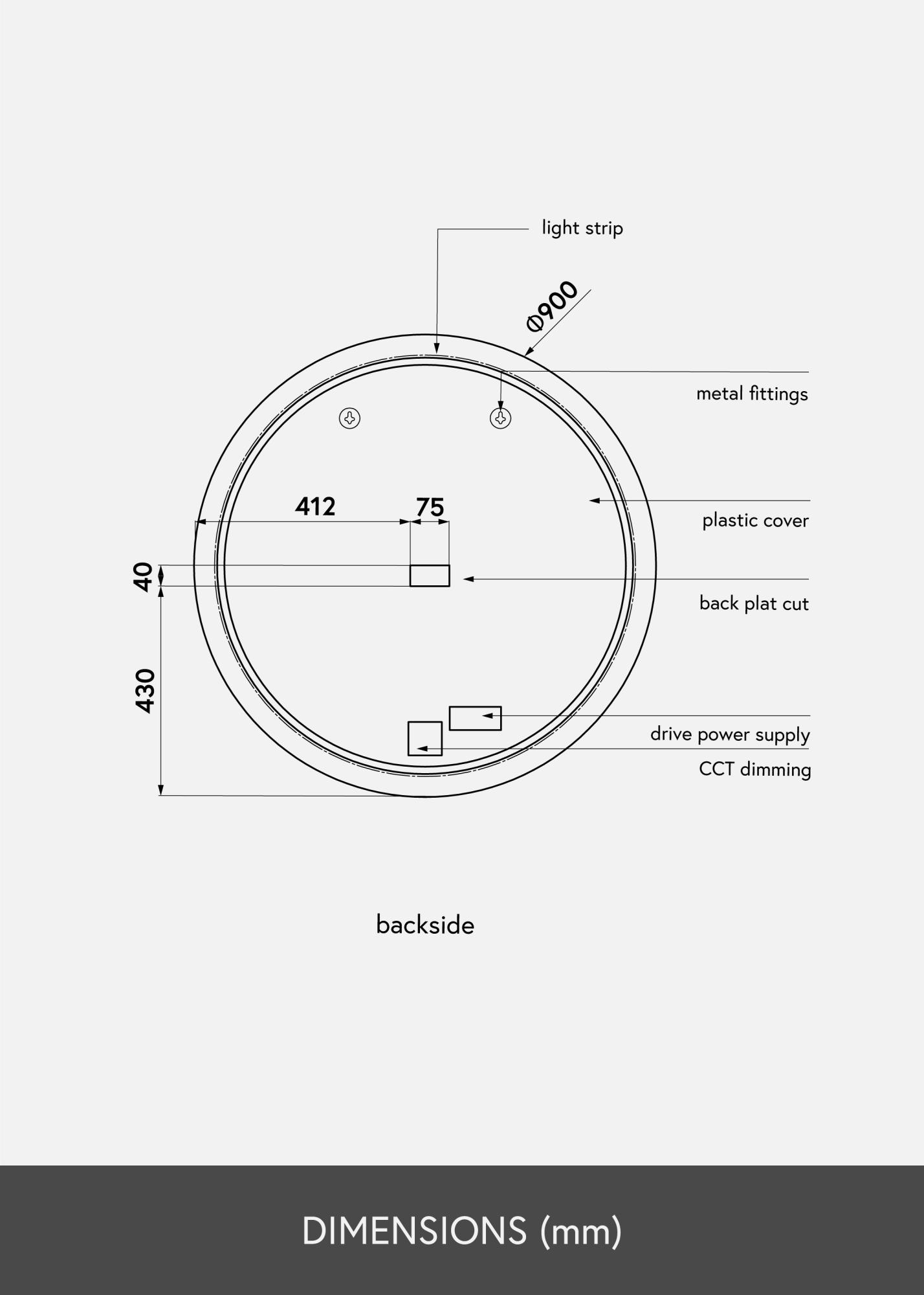 Ο καθρέφτης είναι εγκεκριμένος για το μπάνιο, αλλά η διαχρονική και κομψή σχεδίασή του είναι επίσης ωραία για άλλους τοίχους στο σπίτι. Ο καθρέφτης έχει διάμετρο 90 cm, είναι μόνο 3 cm βάθος και έχει βάσεις τοίχου. Ο καθρέφτης είναι προορισμένος για σταθερή εγκατάσταση και συνδέεται με έναν διακόπτη. Για να λειτουργεί σωστά ο καθρέφτης πρέπει να συνδεθεί με έναν κανονικό διακόπτη, όχι με έναν ρυθμιστικό διακόπτη.