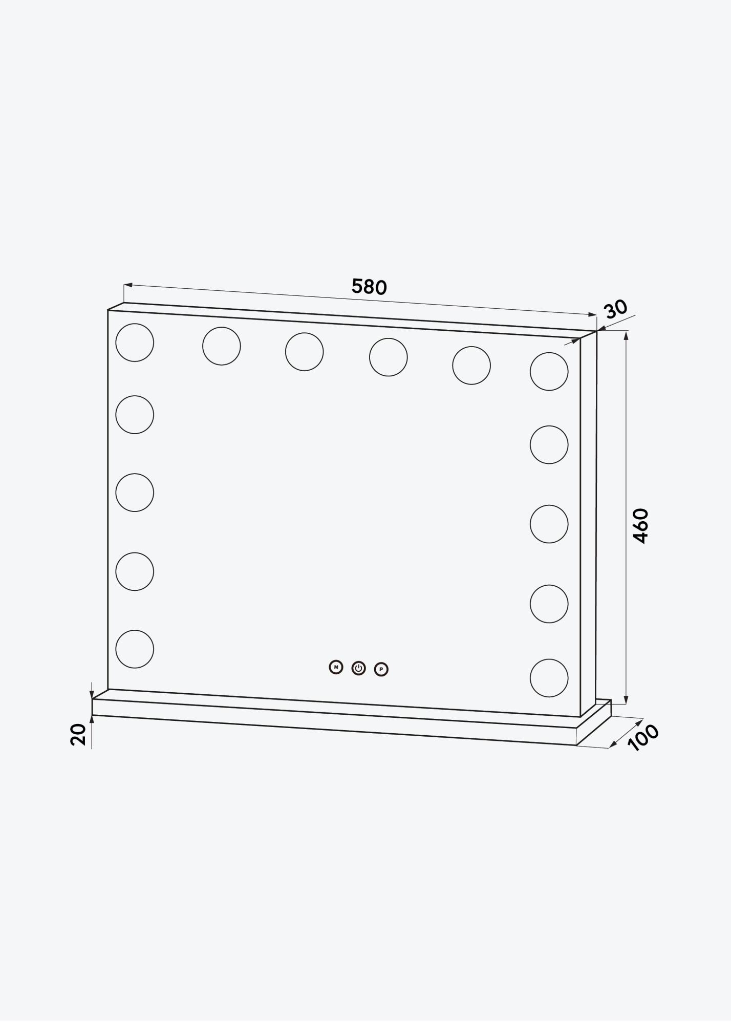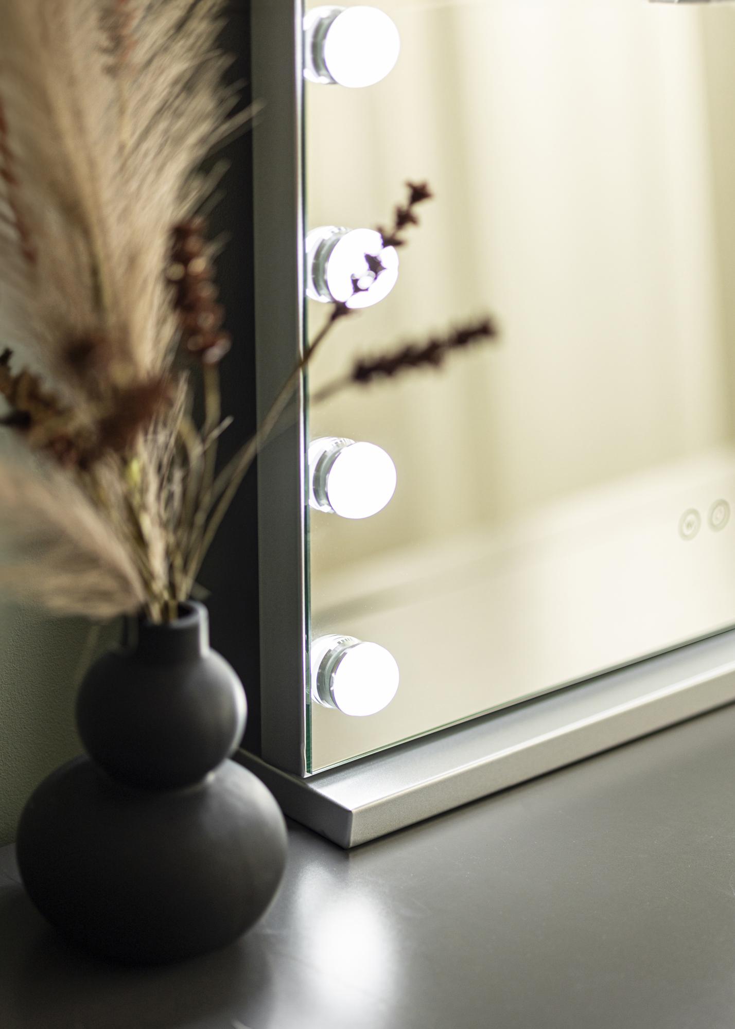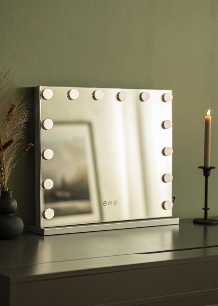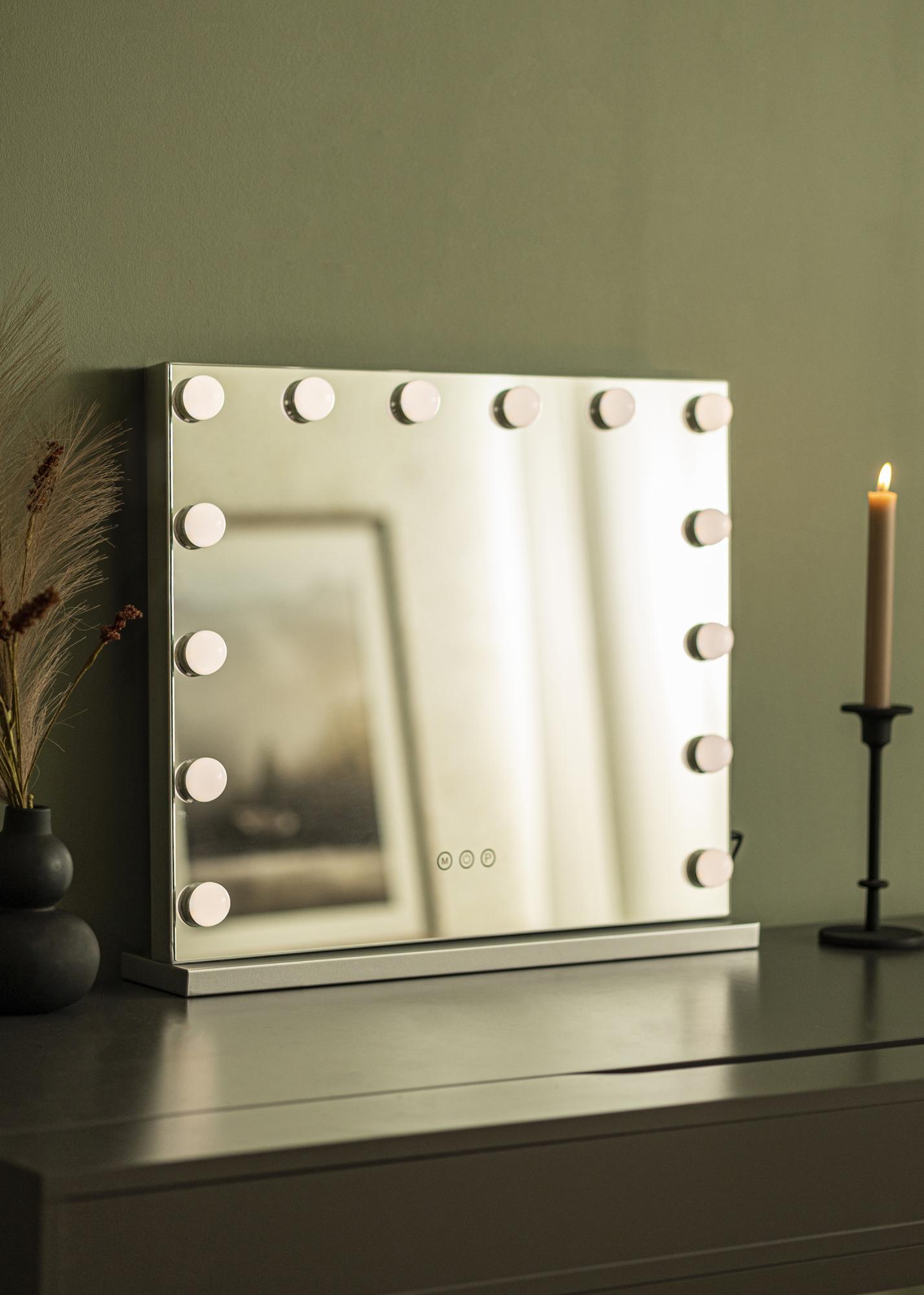 Αυτός ο καθρέφτης μακιγιάζ έχει κομψό σχεδιασμό, με κλασικό ορθογώνιο σχήμα και 14 LED-φώτα που σας παρέχουν καλή φωτισμό όταν εφαρμόζετε το μακιγιάζ σας. Τα φώτα είναι τοποθετημένα σαν κορνίζα γύρω από την επιφάνεια του καθρέφτη, διαστάσεων 56x46 cm. Ο φωτισμός μπορεί να μειωθεί και μπορείτε επίσης να ρυθμίσετε τη θερμοκρασία χρώματος που επιθυμείτε. Για να μειώσετε το φως κρατήστε το κουμπί αφής με την ένδειξη "P" και για να ρυθμίσετε τη θερμοκρασία χρώματος μεταξύ 3000K-6000K κρατήστε το κουμπί με την ένδειξη "M". Ο καθρέφτης διαθέτει επίσης κουμπί αφής για να ενεργοποιείτε και να απενεργοποιείτε τον φωτισμό. Η σύνδεση με ρεύμα γίνεται με πρίζα.