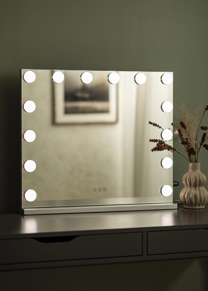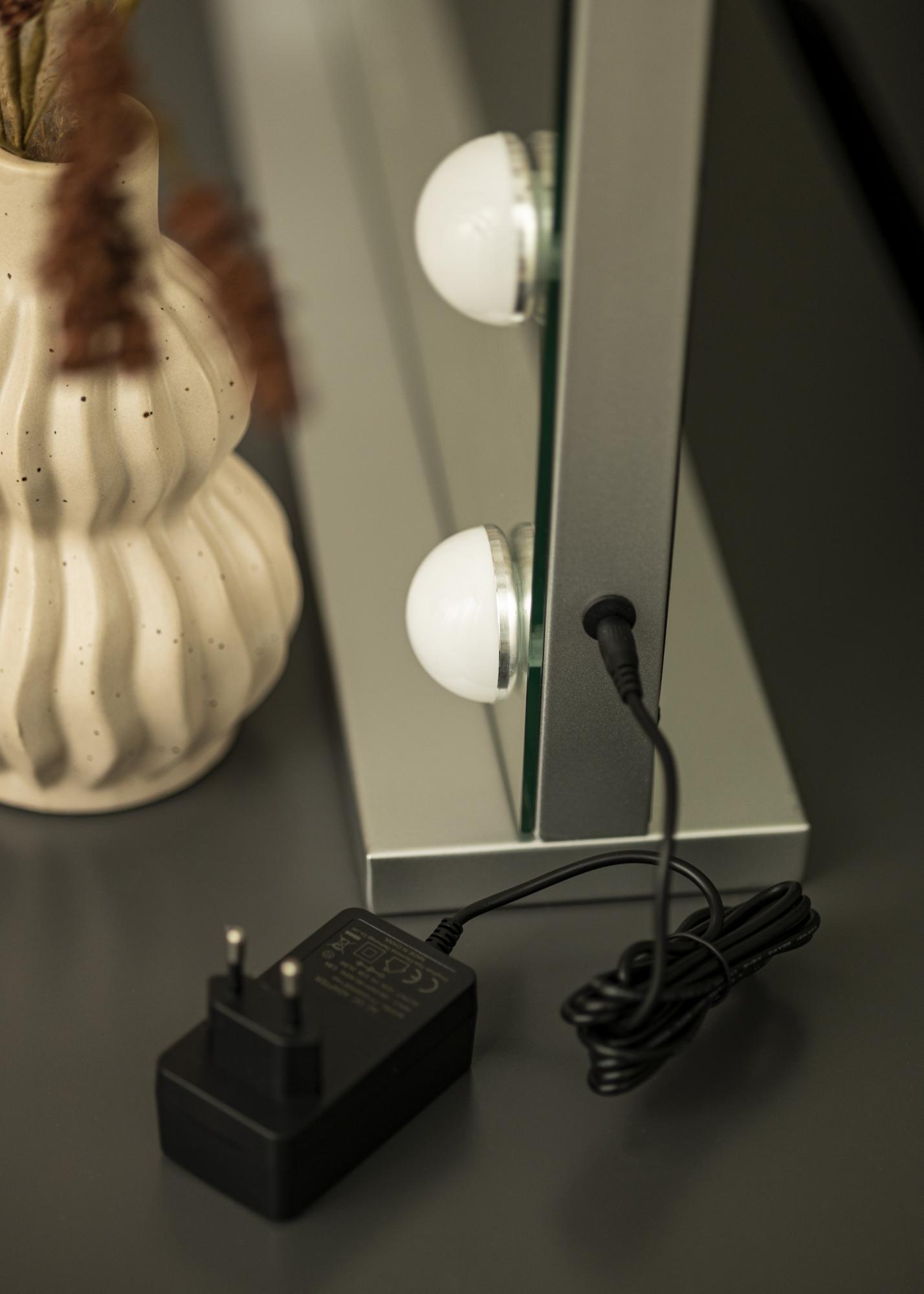 Με αυτόν τον καθρέφτη μακιγιάζ θα προσθέσετε περισσότερη λάμψη στο σπίτι σας, χάρη στον πολυτελή σχεδιασμό με 14 μεγάλες λυχνίες LED που δημιουργούν ένα πλαίσιο γύρω από την επιφάνεια του καθρέφτη. Η ασημένια απόχρωση και το ορθογώνιο σχήμα ενισχύουν ακόμη περισσότερο την κομψή εμφάνιση. Ο καθρέφτης μπορεί είτε να τοποθετηθεί στον τοίχο είτε να τοποθετηθεί ως διακόσμηση σε συρταριέρες και τραπέζια πλαινών. Ο καθρέφτης συνδέεται με βύσμα.