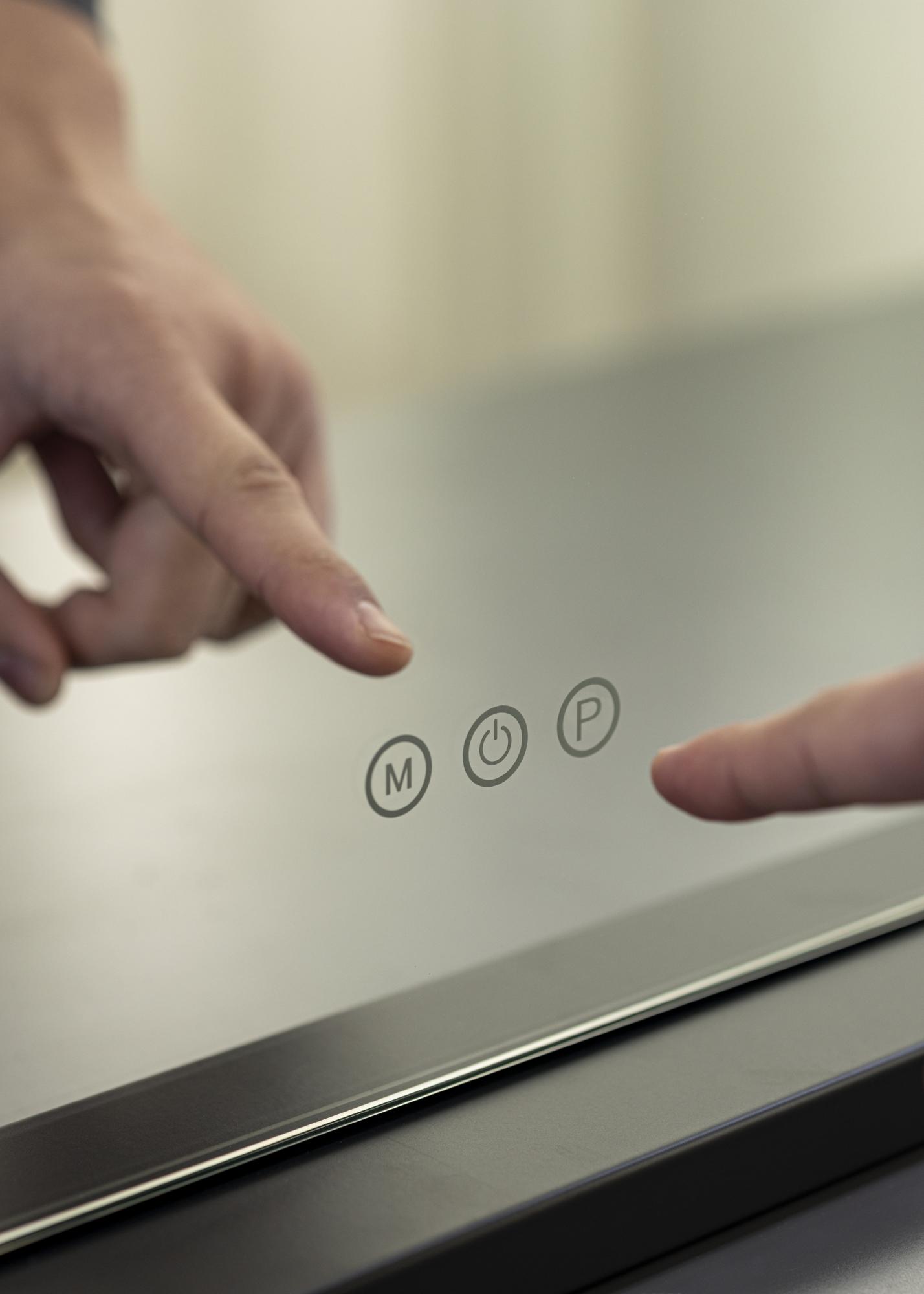 Ο φωτισμός σε αυτόν τον καθρέφτη είναι ρυθμιζόμενος και έχει θερμοκρασία χρώματος 3000K-6000K. Μπορείτε εύκολα να ρυθμίσετε το φωτισμό σύμφωνα με τις προτιμήσεις σας με τη βοήθεια των κουμπιών αφής στην επιφάνεια του καθρέφτη. Κρατώντας πατημένο το κουμπί "P", μπορείτε να ρυθμίσετε την ένταση του φωτός και με τη βοήθεια του κουμπιού "M" μπορείτε να ρυθμίσετε αν θέλετε ζεστό, ψυχρό ή φυσικό φως. Υπάρχει επίσης ένα κουμπί on/off που μπορείτε να χρησιμοποιήσετε για να ενεργοποιήσετε ή να απενεργοποιήσετε το φωτισμό του καθρέφτη.