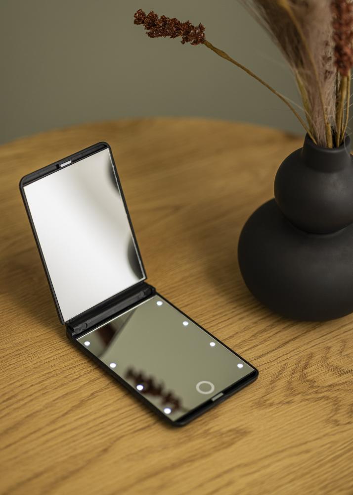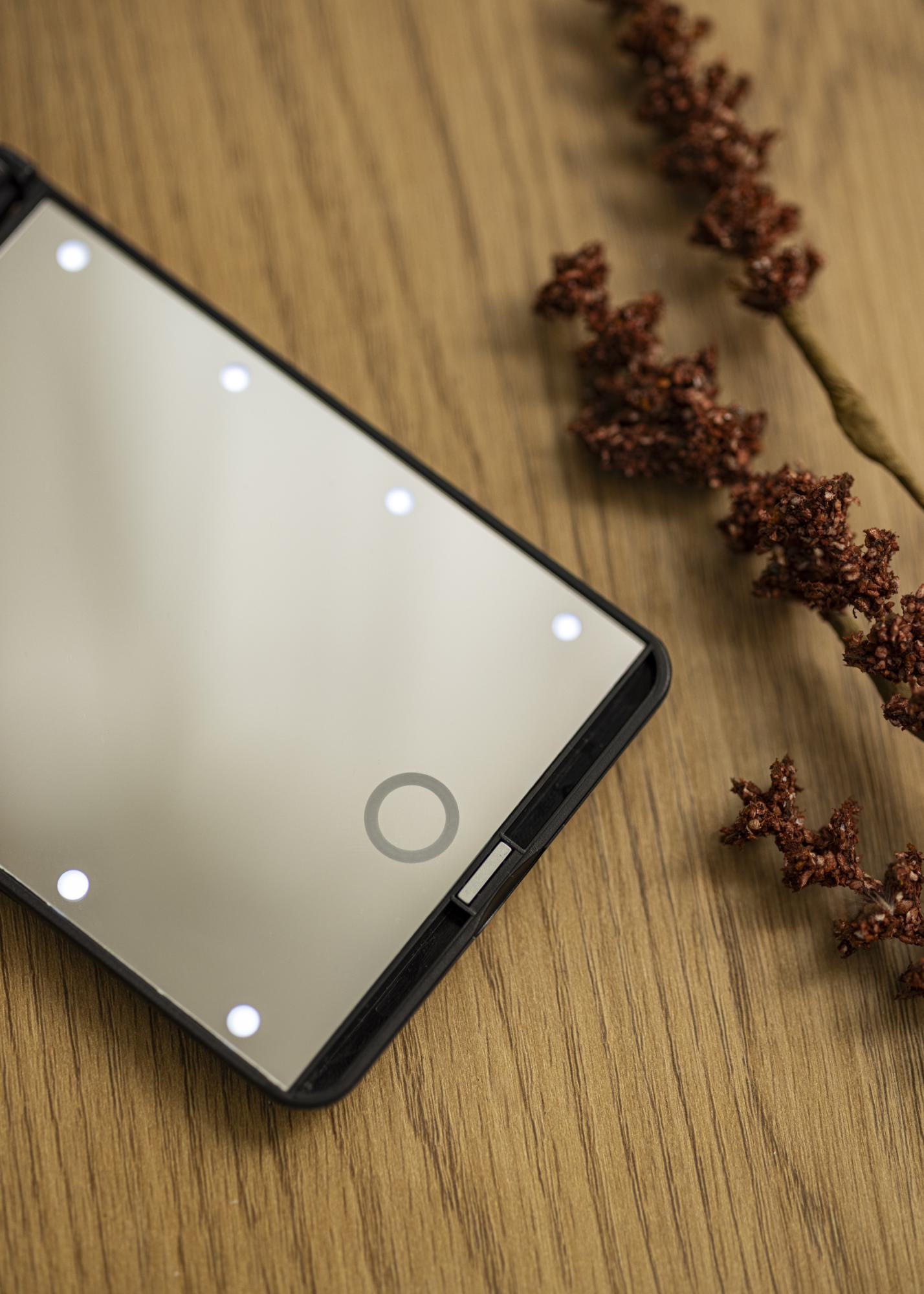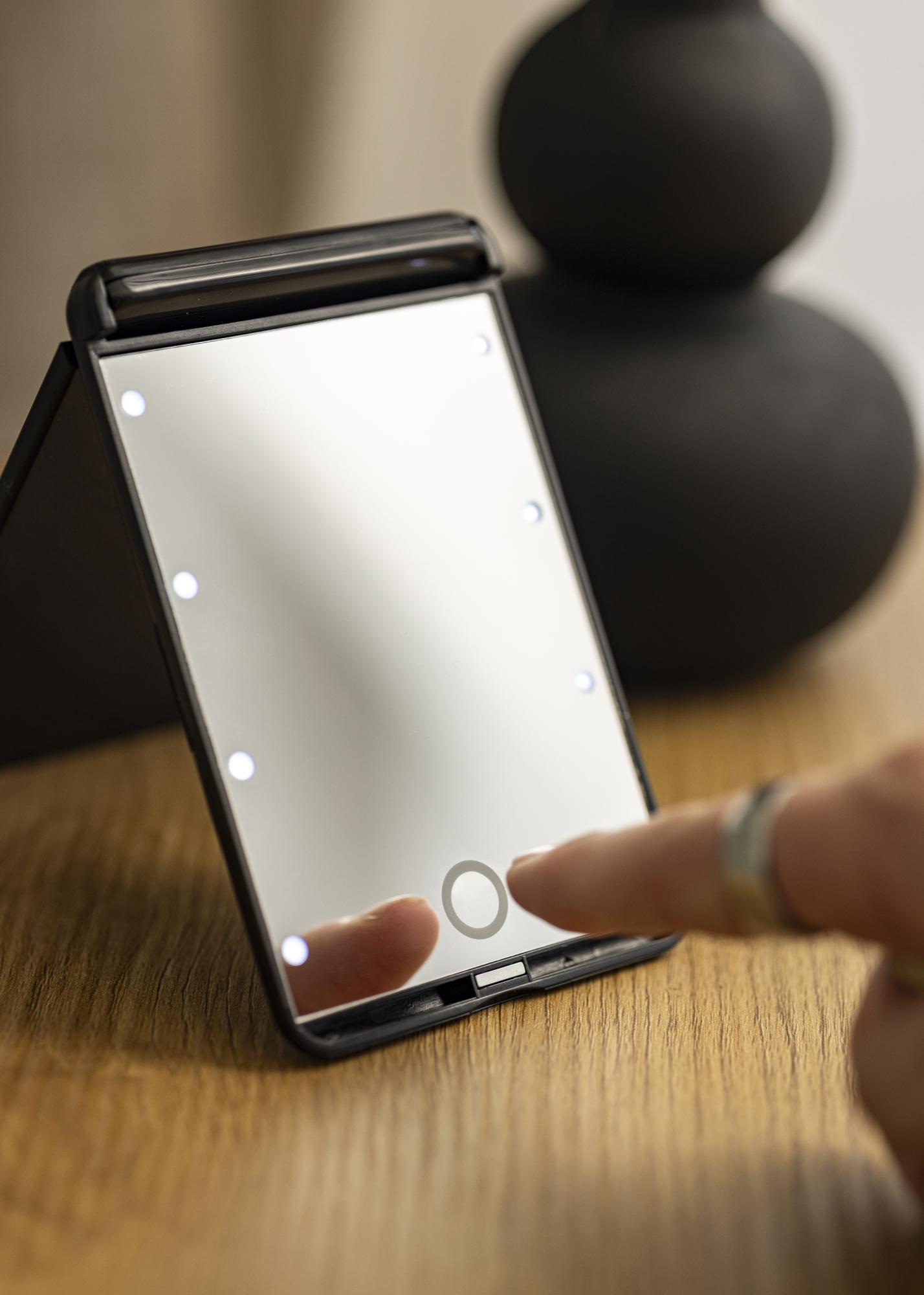 Αυτή είναι μια πτυσσόμενη καθρέφτης μακιγιάζ σε κομψό μαύρο σχεδιασμό που σας επιτρέπει να βλέπετε τον εαυτό σας όπου κι αν βρίσκεστε. Ο καθρέπτης μακιγιάζ έχει ενσωματωμένο φωτισμό γύρω από το κρυστάλλινο καθρέφτη σε μορφή 8 ισχυρών LED φώτων. Ο άνω καθρέφτης διαθέτει μεγεθυντικό γυαλί με ζουμ x2. Ο LED φωτισμός είναι ρυθμιζόμενος και παρέχει ένα ευχάριστο ζεστό λευκό φως στους 3000K, το οποίο ρυθμίζεται εύκολα με την παρατεταμένη πίεση στο κουμπί αφής της οθόνης.