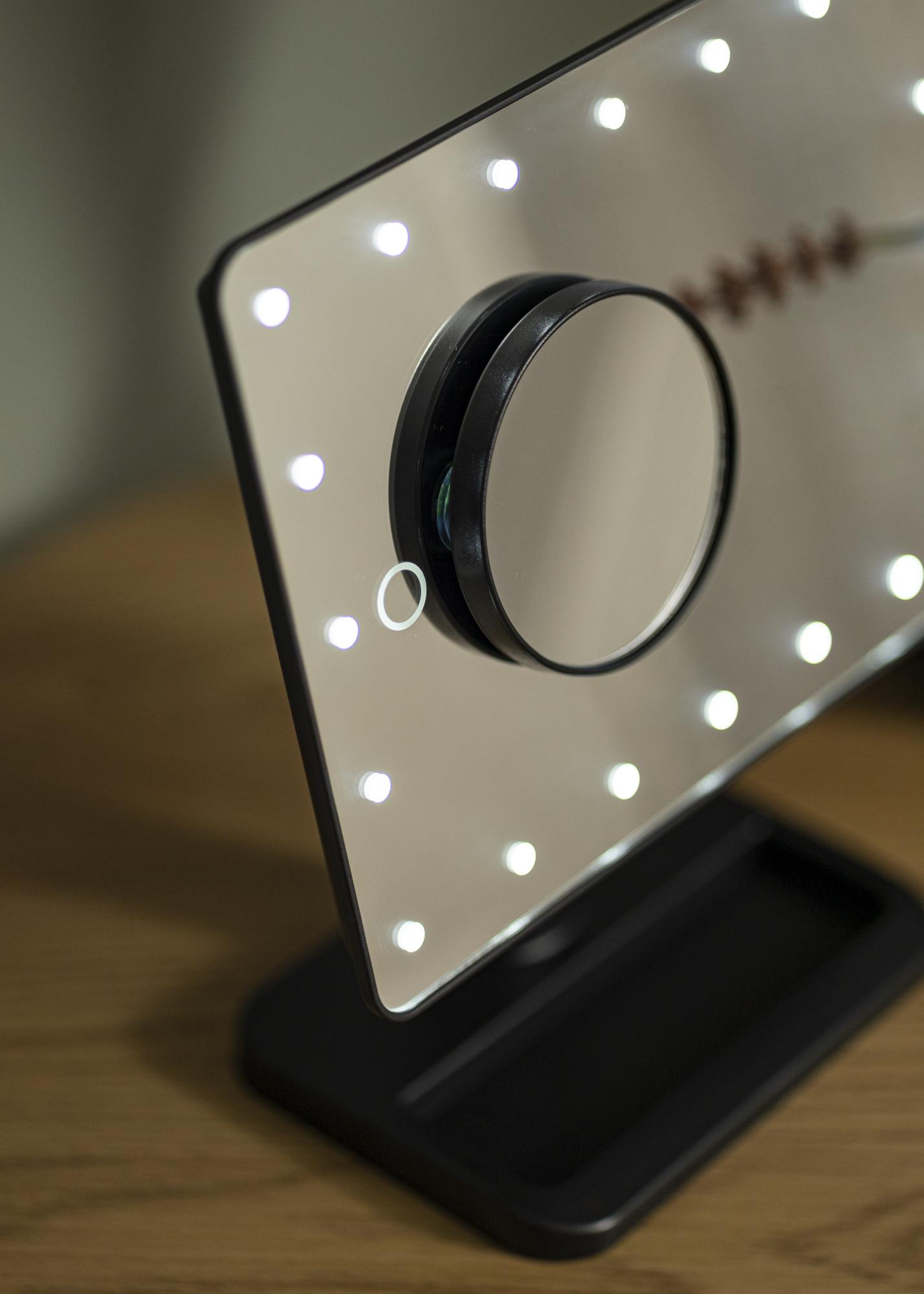 Ο καθρέφτης έχει έναν εύχρηστο σχεδιασμό με επιφάνεια καθρέφτη που μπορεί να γέρνει. Περιλαμβάνει επίσης έναν μικρότερο καθρέφτη με μεγέθυνση 10x, ο οποίος μπορεί να στερεωθεί στην επιφάνεια του καθρέφτη ή να χρησιμοποιηθεί ανεξάρτητα. Ο καθρέφτης λειτουργεί με 4x μπαταρίες AA, οι οποίες πωλούνται ξεχωριστά.