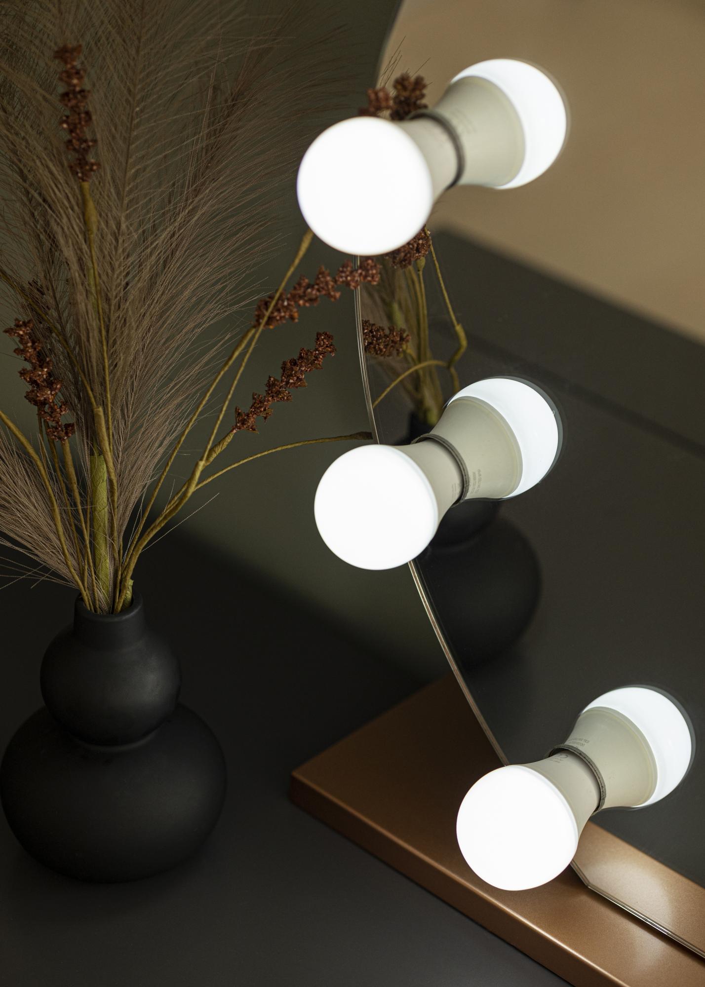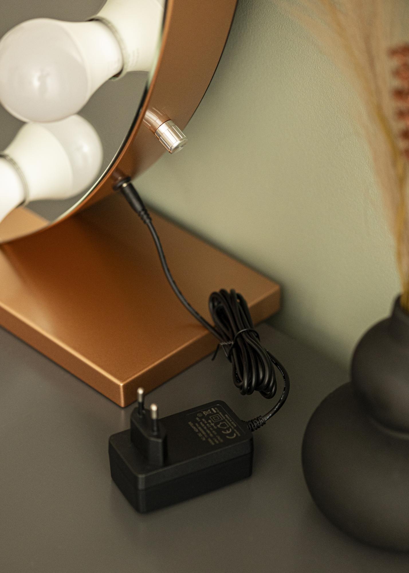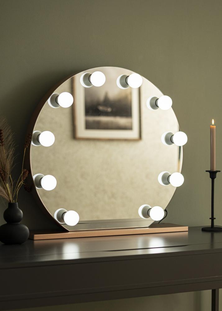 Αφήστε αυτόν τον καθρέφτη μακιγιάζ σε ροζ χρυσό να δώσει μια χρυσή πινελιά στο δωμάτιό σας. Οι 10 λάμπες του καθρέφτη, τοποθετημένες σαν πλαίσιο γύρω από την επιφάνεια του καθρέφτη, παρέχουν ένα λευκό, ψυχρό και ομοιόμορφο φως. Οι λάμπες έχουν υποδοχή E27 και είναι αντικαταστάσιμες. Χάρη στη λειτουργία έξυπνου ρυθμιστή έντασης, μπορείτε να προσαρμόσετε την ένταση του φωτός ανάλογα με τις ανάγκες σας. Το μόνο που χρειάζεται να κάνετε είναι να περιστρέψετε το κουμπί στη μία πλευρά του καθρέφτη.