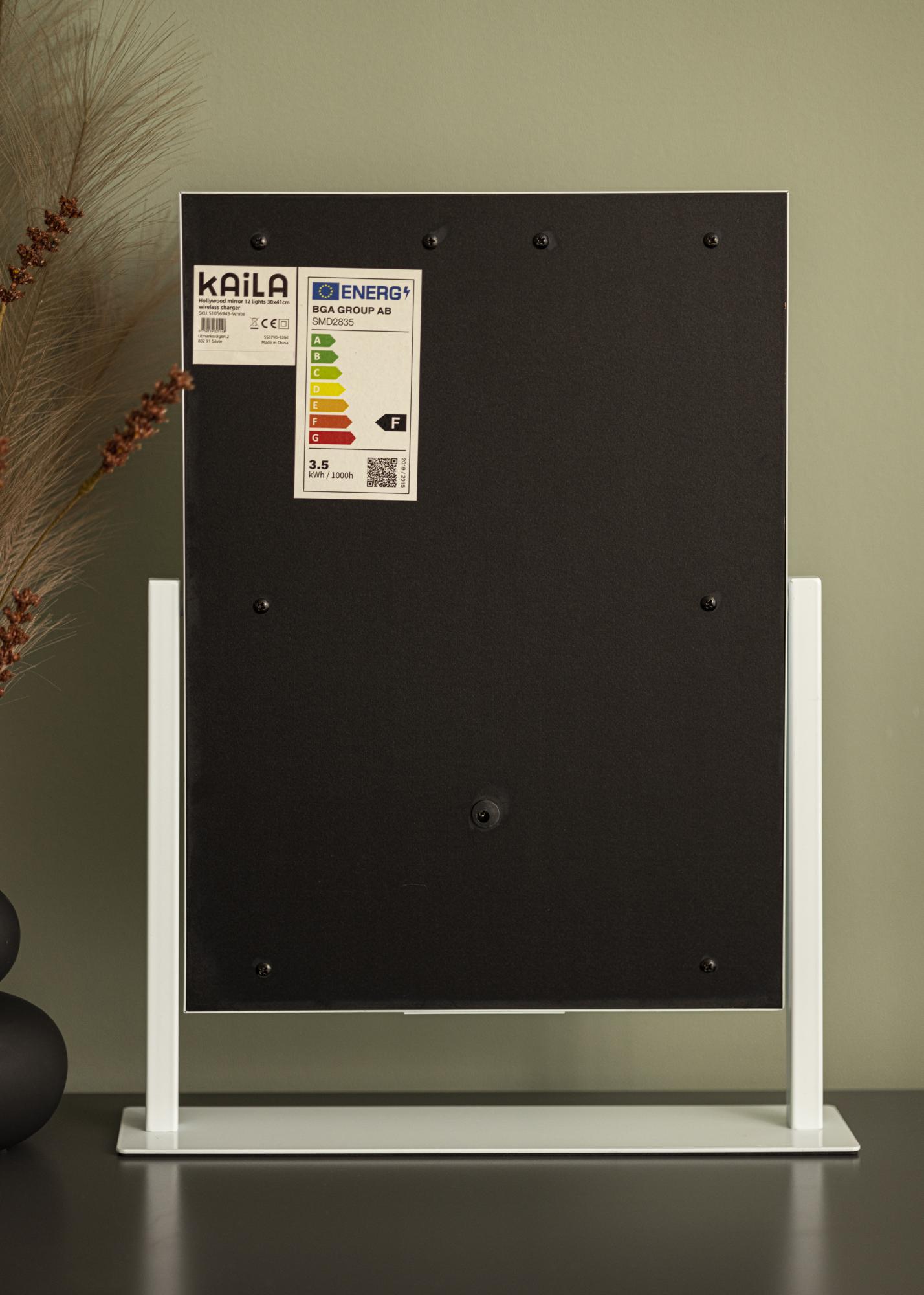 Ο κατακόρυφος σχεδιασμός με κομψή λευκή απόχρωση είναι πολύ στυλάτος ενώ η έξυπνη κατασκευή σας επιτρέπει να γωνιάζετε την επιφάνεια του καθρέφτη. Ο καθρέφτης είναι εφοδιασμένος με φωτισμό LED σε μορφή 12 λαμπτήρων που περιβάλλουν την επιφάνεια καθρέφτη μεγέθους 30x41 εκ. Ο φωτισμός LED είναι μεταβαλλόμενης έντασης και για να ρυθμίσετε τη φωτεινότητα, κρατήστε το κουμπί αφής στον καθρέφτη για λίγα δευτερόλεπτα. Η σύνδεση με το ρεύμα γίνεται με φις.