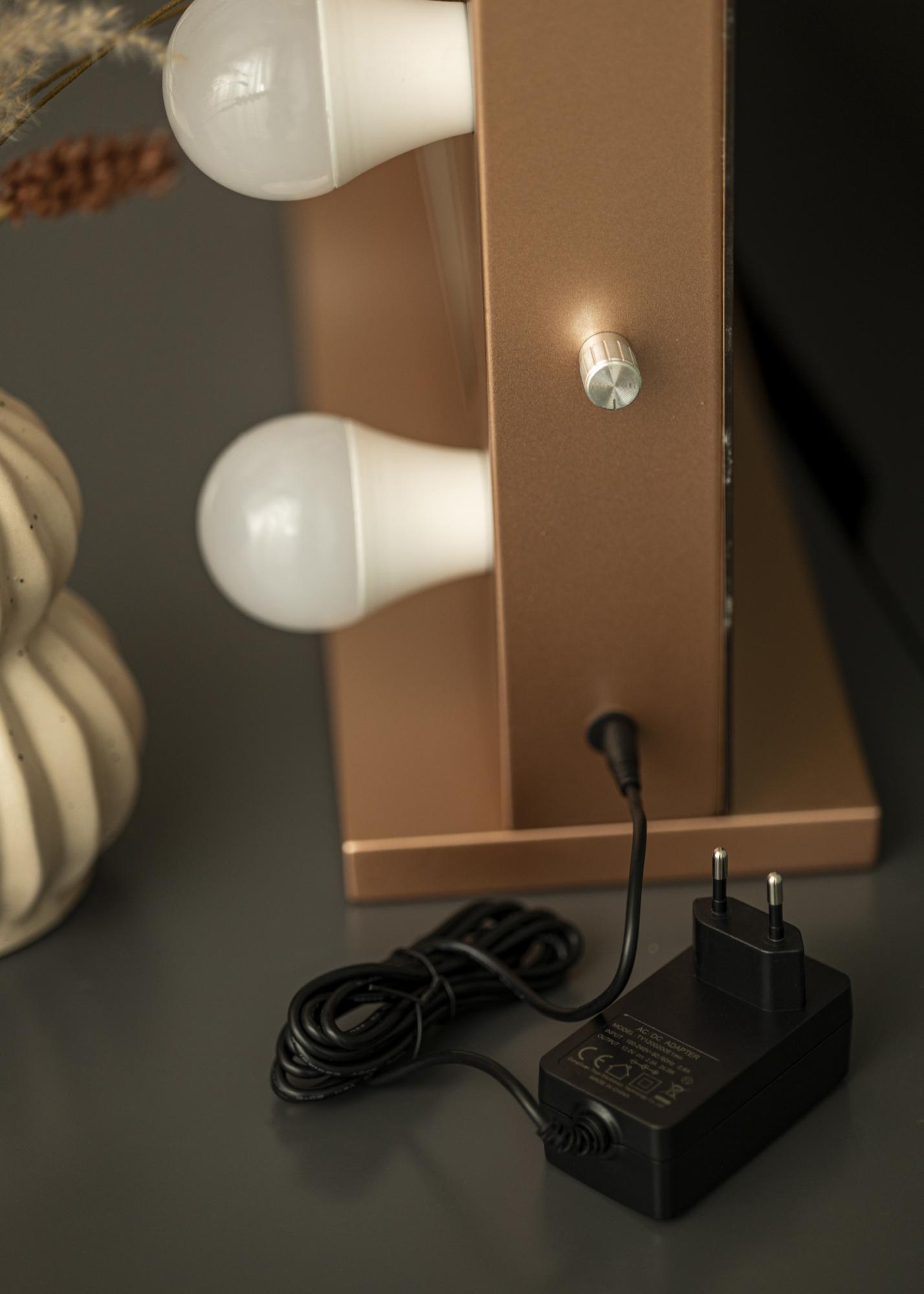 Το πλαίσιο σε ροζ χρυσό ταιριάζει με μια βάση στην ίδια στυλάτη απόχρωση, κάνοντας αυτόν τον καθρέφτη μια τέλεια λεπτομέρεια διακόσμησης τόσο σε τραπέζια όσο και σε συρταριέρες. Αν προτιμάτε να κρεμάσετε τον καθρέφτη στον τοίχο με τη βοήθεια των επιτοίχιων στηριγμάτων στο πίσω μέρος, μπορείτε να αποσυναρμολογήσετε τη βάση. Η σύνδεση ρεύματος γίνεται με βύσμα.