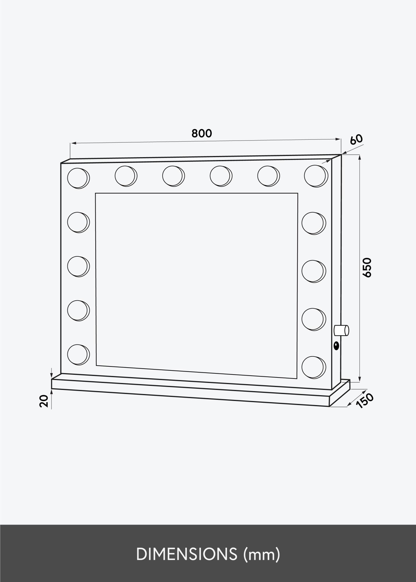 Αυτός είναι ένας καθρέφτης μακιγιάζ με υψηλή κομψότητα, χάρη στον σχεδιασμό εμπνευσμένο από το Χόλιγουντ με ένα πλατύ πλαίσιο σε απόχρωση ροζ χρυσού, διακοσμημένο με 14 μεγάλες LED λάμπες. Οι LED λαμπτήρες έχουν υποδοχή E27 και μπορούν εύκολα να αντικατασταθούν όταν είναι απαραίτητο. Το LED ως πηγή φωτός είναι επιπλέον μια βιώσιμη και ενεργειακά αποδοτική επιλογή. Ο καθρέφτης εκπέμπει ένα ψυχρό λευκό φως που μπορεί να προσαρμοστεί με τη βοήθεια ενός μικρού κουμπιού στη μία πλευρά του καθρέφτη.