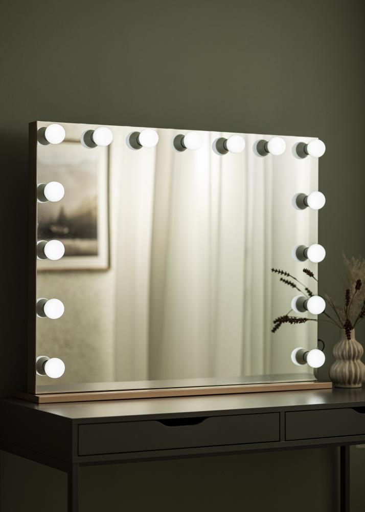 Αποκτήστε μια αίσθηση του Χόλιγουντ στο σπίτι σας με αυτόν τον μοντέρνο καθρέφτη μακιγιάζ. Η μεγάλη διάστασή του, με επιφάνεια καθρέφτη 100x80 cm, θα δώσει στη γωνιά του μακιγιάζ σας ένα πραγματικό WOW-παράγοντα. Η βάση και οι πλευρές του καθρέφτη έχουν μια απόχρωση ροζ χρυσού, που ενισχύει ακόμη περισσότερο την κομψότητα του καθρέφτη. Μπορείτε να επιλέξετε να εγκαταστήσετε τον καθρέφτη στον τοίχο ή να τον τοποθετήσετε όρθιο. Αυτός ο καθρέφτης διαθέτει μια βάση που προσαρμόζεται εύκολα στον καθρέφτη.