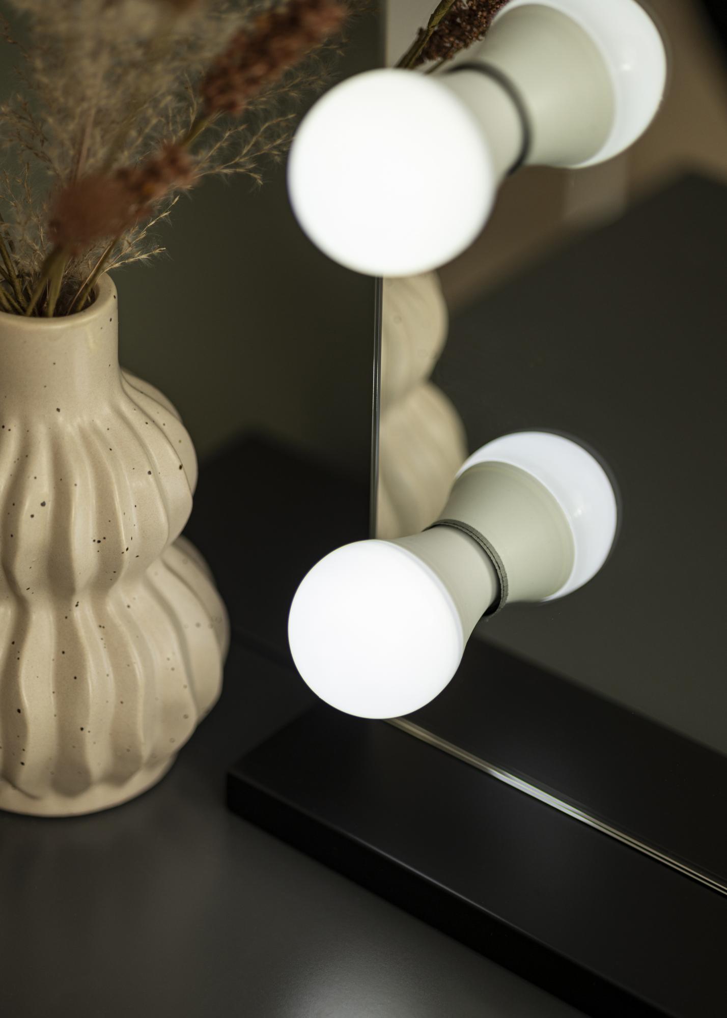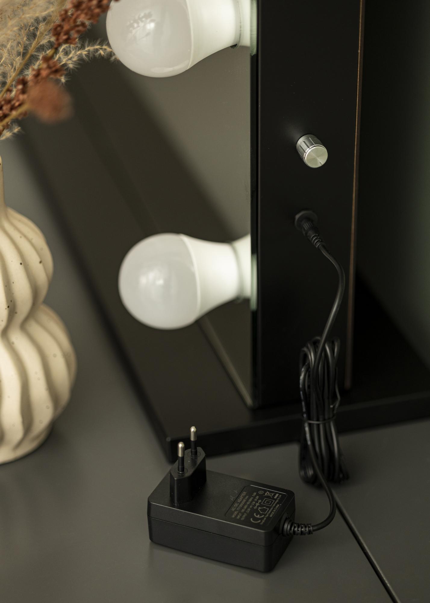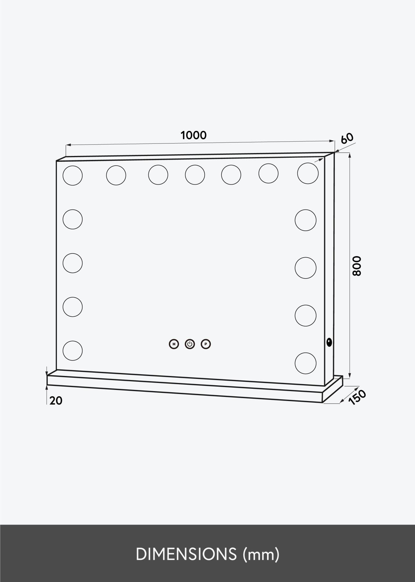 Με έναν καθρέφτη μακιγιάζ σε μεγαλύτερη μορφή, μπορείτε να προσθέσετε τόσο στυλ όσο και λειτουργικότητα στο υπνοδωμάτιο ή στο σαλόνι. Αυτός ο καθρέφτης διαθέτει επιφάνεια καθρέφτη που μετρά ολόκληρα 100x80 cm, η οποία ομορφαίνεται από 15 λάμπες με υποδοχή σε μοντέλο Ε27. Ο κομψός σχεδιασμός, με κλασικό ορθογώνιο σχήμα και λάμπες κατά μήκος των πλευρών του καθρέφτη, φέρνει στο νου το λαμπερό Χόλιγουντ. Οι λάμπες εκπέμπουν ψυχρό λευκό φως. Ο φωτισμός μπορεί εύκολα να προσαρμοστεί στην επιθυμητή φωτεινότητα με τη βοήθεια του περιστροφικού κουμπιού στη μία πλευρά του καθρέφτη.