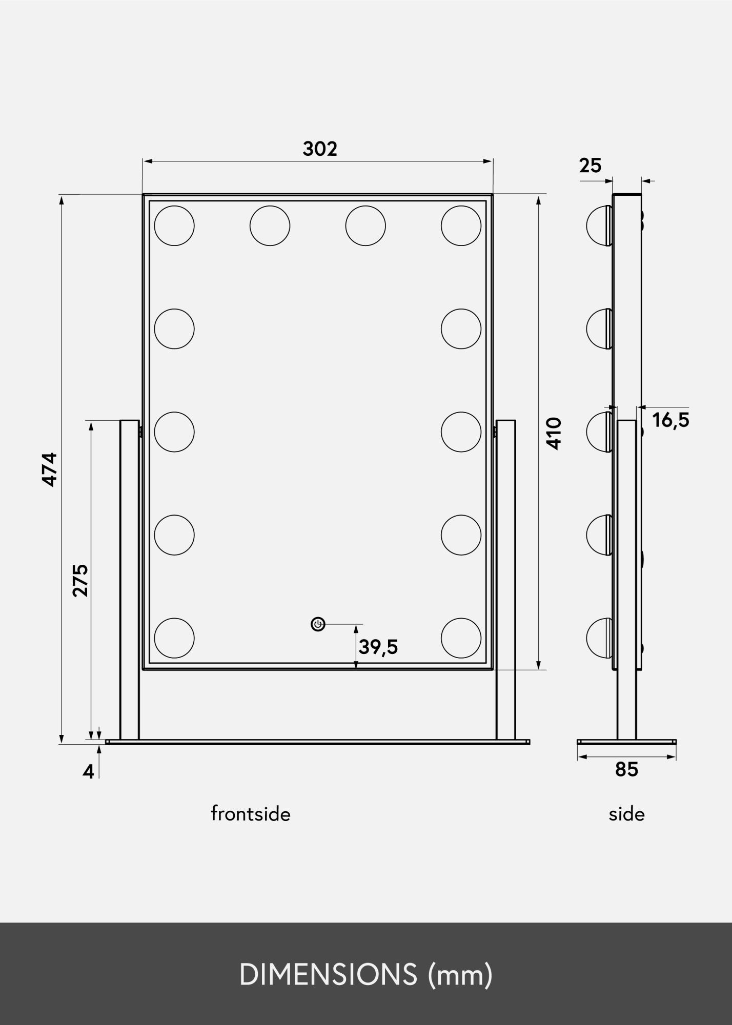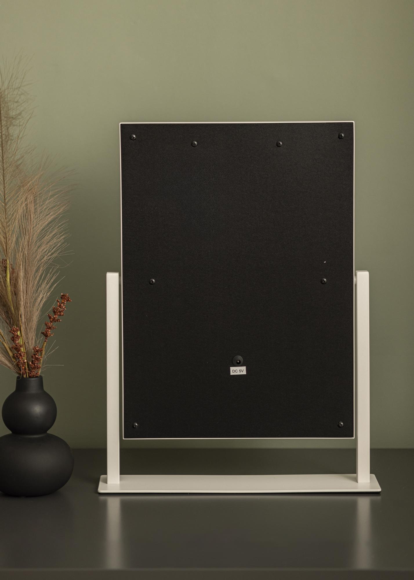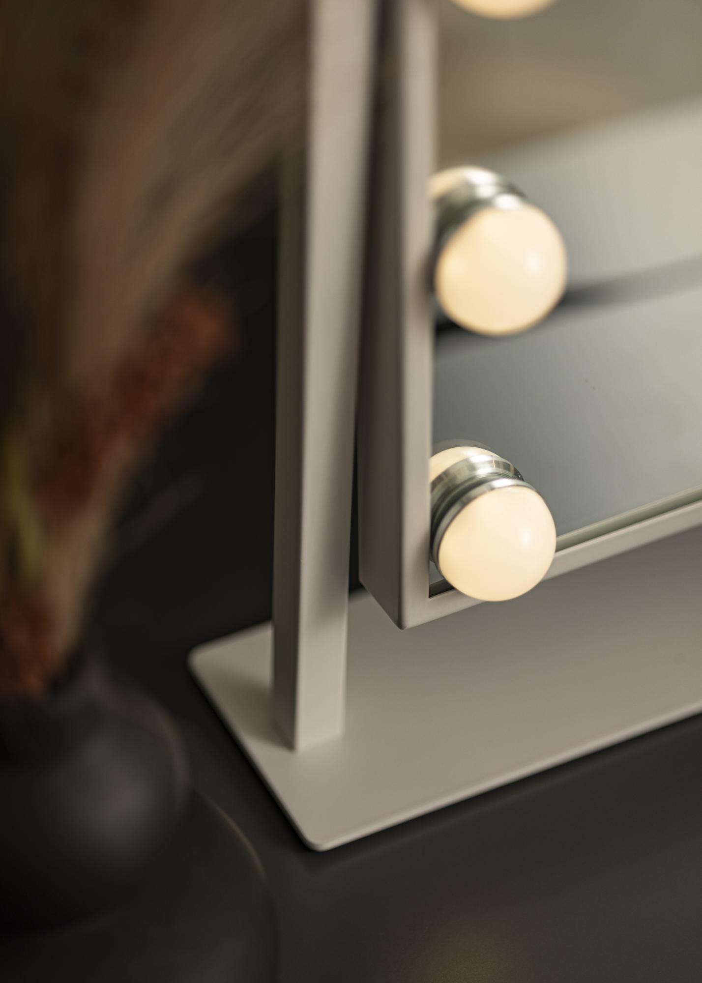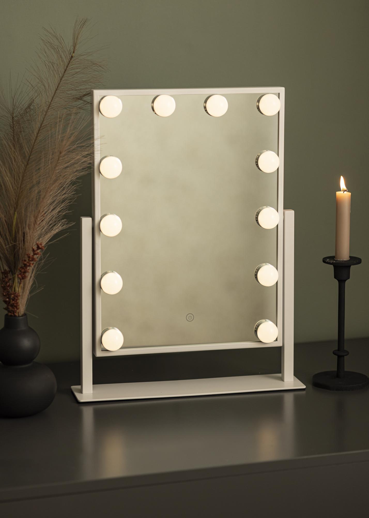 Αυτός είναι ένας καθρέφτης μακιγιάζ σε πολυτελή σχεδίαση με 12 διακοσμητικές LED λάμπες σε κομψή λευκή απόχρωση. Οι λάμπες πλαισιώνουν με στυλ την γενναιόδωρη επιφάνεια καθρέφτη που μετράει 30x40 cm και παρέχουν ζεστό λευκό φως 3000K. Ο φωτισμός ανάβει με το πάτημα του κουμπιού αφής στην οθόνη και διαθέτει λειτουργία εξασθένισης που μπορείτε εύκολα να ρυθμίσετε κρατώντας πατημένο το κουμπί για λίγα δευτερόλεπτα. Ο καθρέφτης μπορεί να κλίνει κάθετα ώστε να μπορείτε εύκολα να βαφτείτε από τη γωνία που σας ταιριάζει καλύτερα. Εκτός από τις πολλές λειτουργίες του, αυτός ο καθρέφτης μακιγιάζ γίνεται μια κομψή λεπτομέρεια και δημιουργεί μια αυθεντική αίσθηση Χόλιγουντ στο σπίτι σας!