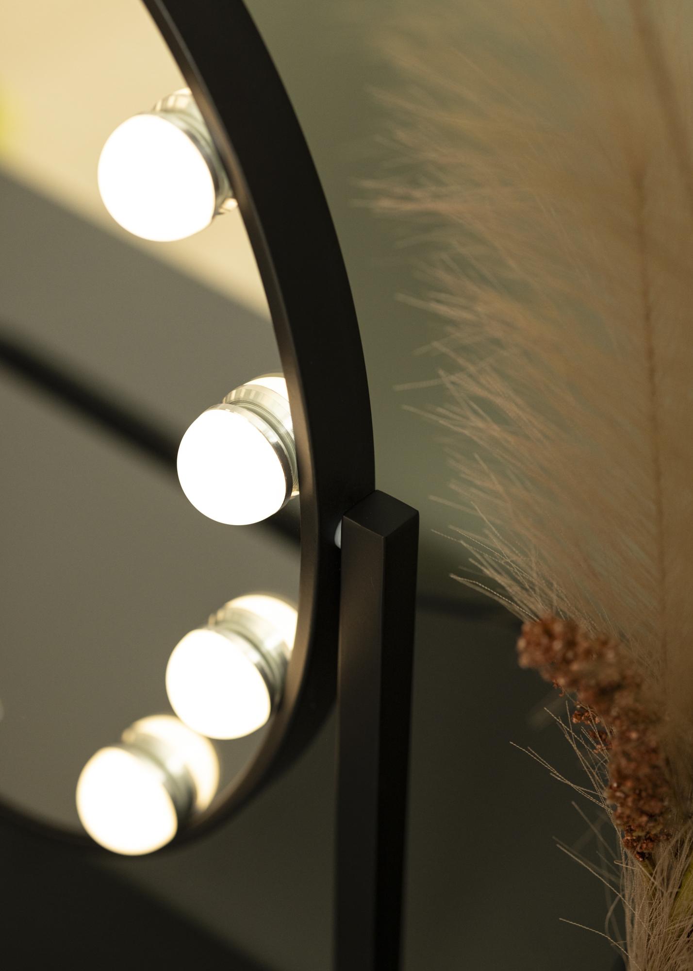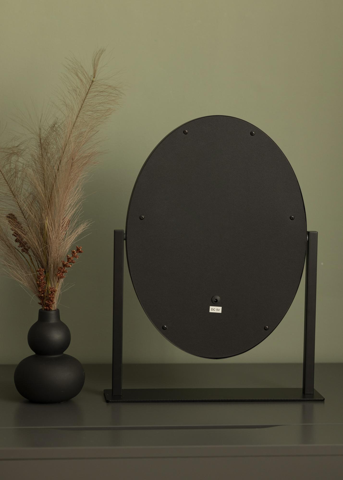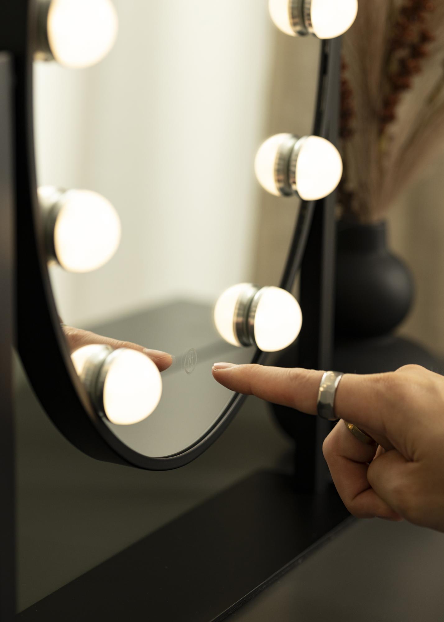 Αυτός είναι ένας καθρέφτης μακιγιάζ σε κομψό οβάλ σχήμα από τη σουηδική μάρκα KAILA. Ο καθρέφτης μακιγιάζ διαθέτει κομψό σχέδιο σε μαύρο χρώμα και έχει ενσωματωμένο ρυθμιζόμενο LED φωτισμό. Ο φωτισμός LED με τη μορφή 10 λαμπτήρων προσφέρει έναν ομοιόμορφο και ζεστό λευκό τόνο στις 3000K. Ο φωτισμός ενεργοποιείται πιέζοντας το πλήκτρο αφής και η ισχύς του ρυθμίζεται εύκολα κρατώντας πατημένο το κουμπί για λίγα δευτερόλεπτα. Το LED είναι μια ενεργειακά αποδοτική πηγή φωτός με φυσικό φως που είναι ιδανικό για την εφαρμογή μακιγιάζ. Ο καθρέφτης μακιγιάζ έχει διαστάσεις 34x47 cm και μπορεί να περιστραφεί κατά 360° κατακόρυφα, επιτρέποντάς σας να καθρεφτιστείτε εύκολα από διάφορες γωνίες. Ο διαχρονικός και λαμπερός σχεδιασμός δημιουργεί μια αίσθηση του Χόλιγουντ στο σπίτι σας!