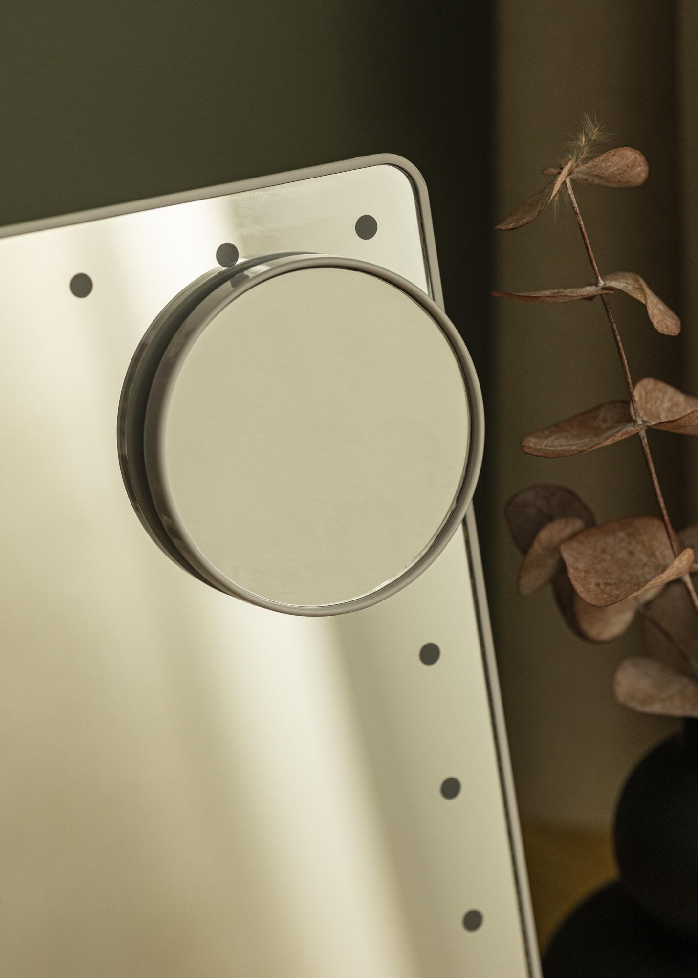 Ο καθρέφτης έχει μικρό μέγεθος με επιφάνεια καθρέφτη 16,5x25 εκ., που τον καθιστά εύκολο να μετακινηθεί. Η επιφάνεια του καθρέφτη μπορεί να περιστραφεί και να γείρει ώστε να μπορείς να ρυθμίσεις μια γωνία που σου ταιριάζει. Περιλαμβάνεται ένας μικρότερος καθρέφτης με ζουμ 2x και 3x, που μπορεί να χρησιμοποιηθεί μόνος του ή να στερεωθεί πάνω στο γυαλί του μεγαλύτερου καθρέφτη. Αυτός ο καθρέφτης μακιγιάζ διαθέτει επίσης ενσωματωμένο φωτισμό LED που παρέχει ψυχρό λευκό φως στο πρόσωπό σου όταν κοιτάζεσαι. Ο φωτισμός μπορεί να ανάψει και να σβήσει μέσω ενός κουμπιού on/off στο πίσω μέρος του καθρέφτη και έχεις επίσης τη δυνατότητα να μειώσεις την ένταση του φωτός. Ο καθρέφτης λειτουργεί με ενσωματωμένη μπαταρία που φορτίζεται μέσω σύνδεσης USB. Περιλαμβάνεται καλώδιο φόρτισης.