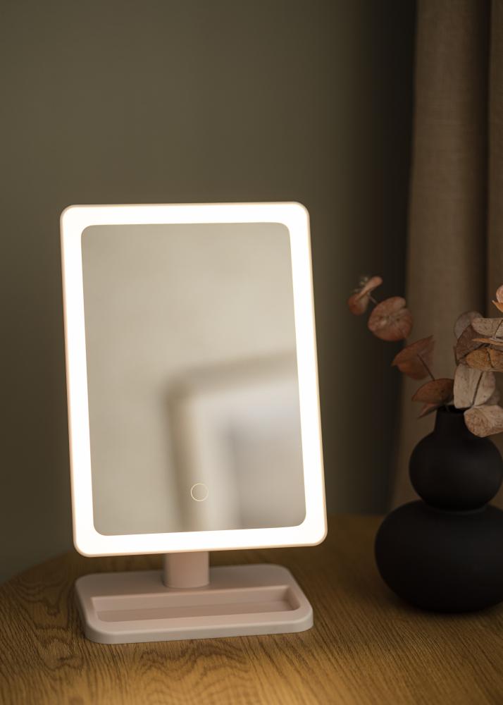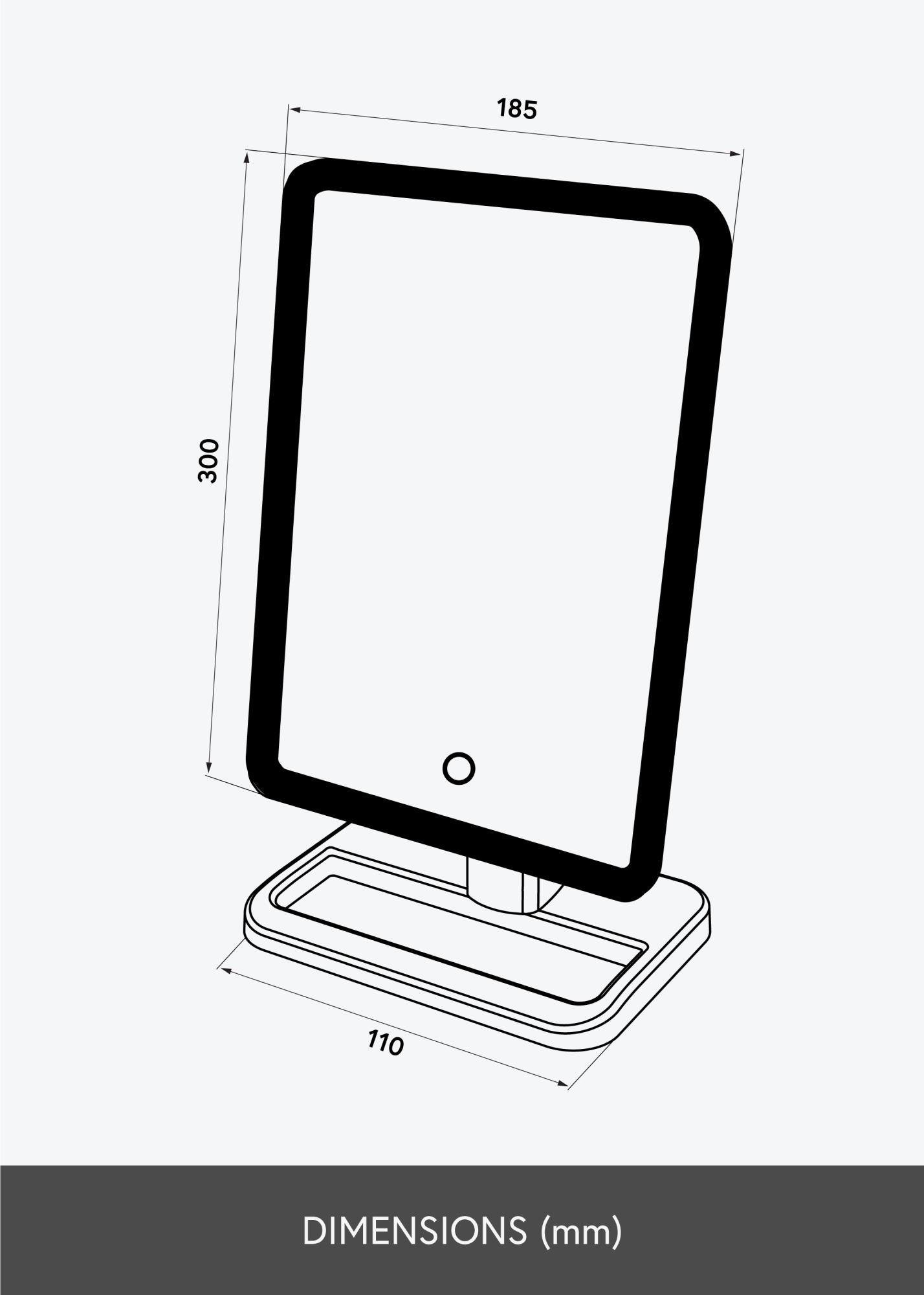 Ο καθρέφτης έχει κομψή εμφάνιση, με ουδέτερο λευκό χρώμα και μία λωρίδα LED που πλαισιώνει την επιφάνεια καθρέφτη των 16,5x25 cm. Μπορείτε να μειώσετε τον φωτισμό κρατώντας πατημένο το κουμπί στην επιφάνεια καθρέφτη για μερικά δευτερόλεπτα. Με αυτόν τον τρόπο μπορείτε να ρυθμίσετε τη φωτεινότητα που σας ταιριάζει καλύτερα. Ο έξυπνος σχεδιασμός του καθρέφτη σας επιτρέπει να περιστρέφετε και να κλίνει την επιφάνεια καθρέφτη όπως επιθυμείτε, και το ελαφρύ βάρος του καθρέφτη τον καθιστά εύκολο στη μετακίνηση. Συνοδεύεται από έναν μικρότερο καθρέφτη με μεγέθυνση 10x. Είναι τέλειο όταν θέλετε να αντικατοπτρίσετε λεπτομερώς ένα μέρος του προσώπου σας. Ο καθρέφτης τροφοδοτείται από μια ενσωματωμένη μπαταρία που φορτίζεται μέσω του παρεχόμενου καλωδίου φόρτισης.