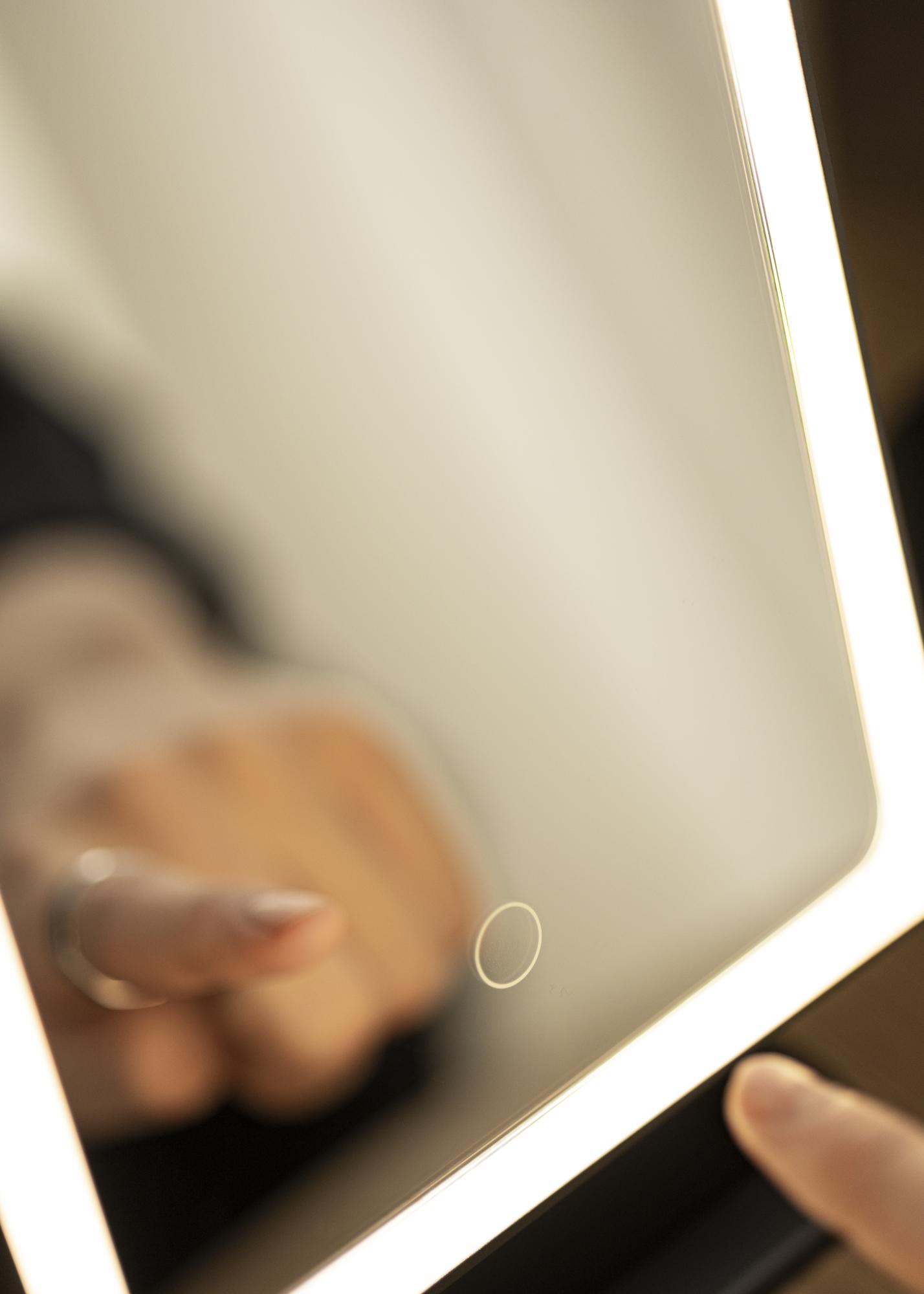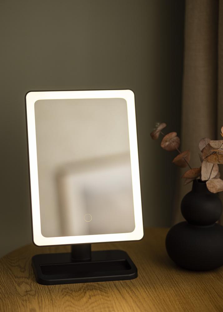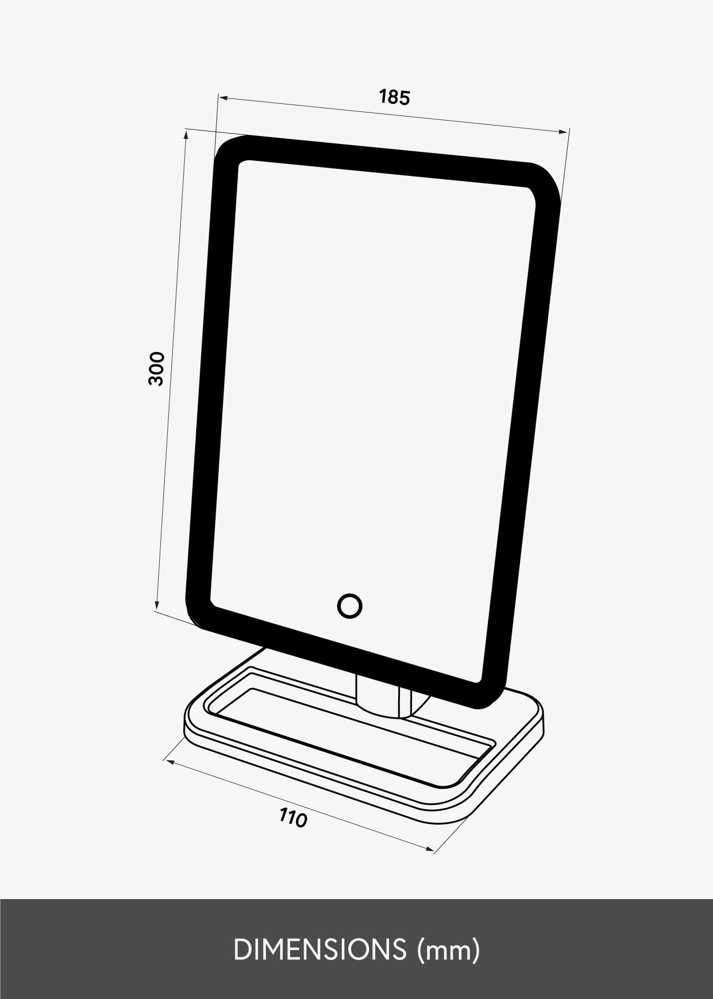 Ο καθρέφτης έχει έναν έξυπνο σχεδιασμό με λεπτομέρειες που διευκολύνουν το μακιγιάζ σας με εξαιρετικό αποτέλεσμα. Η επιφάνεια του καθρέφτη περιβάλλεται από μια λωρίδα LED που φωτίζει το πρόσωπό σας – επιπλέον, μπορεί να περιστραφεί και να κλίνει για να μπορέσετε να ρυθμίσετε μια γωνία που σας ταιριάζει. Μπορείτε να ρυθμίσετε τη φωτεινότητα πιέζοντας το κουμπί στον καθρέφτη. Περιλαμβάνεται επίσης ένας μικρότερος καθρέφτης με ζουμ 10x, ο οποίος είναι τέλειος όταν θέλετε να εστιάσετε σε ένα μικρό μέρος του προσώπου σας. Ο καθρέφτης λειτουργεί με μια ενσωματωμένη μπαταρία που φορτίζεται μέσω του περιλαμβανόμενου καλωδίου USB.