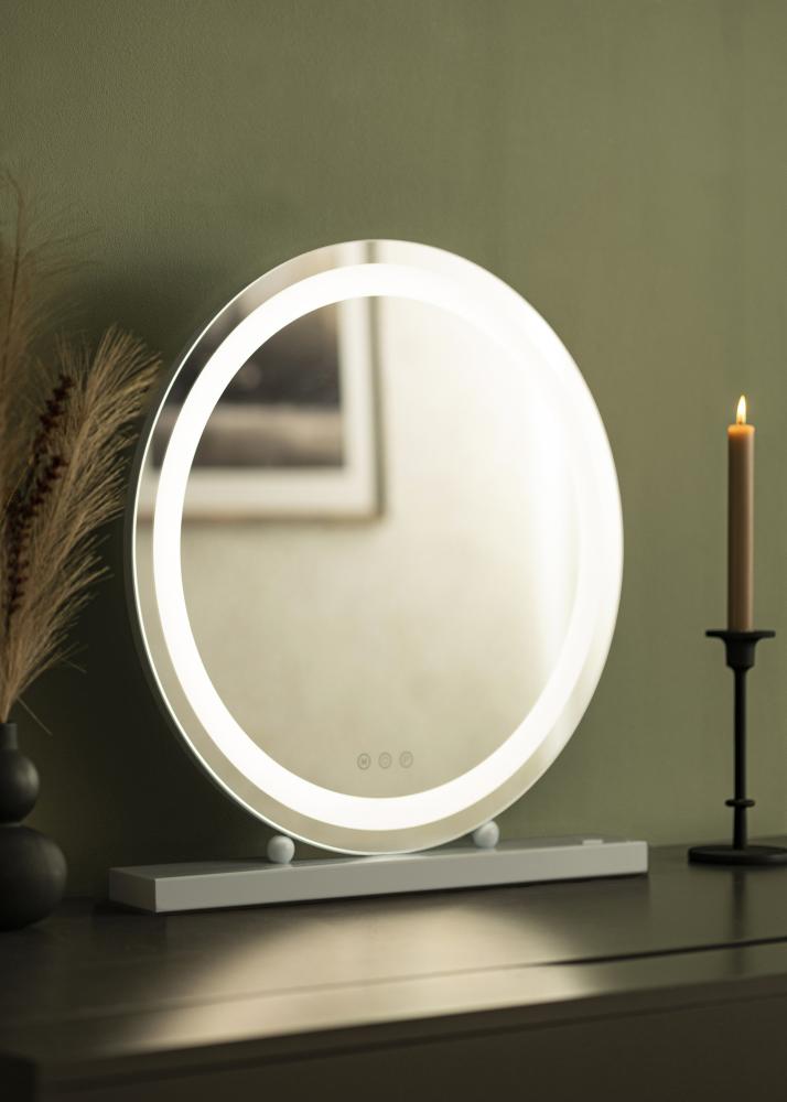 Θέλεις έναν εκλεπτυσμένο καθρέφτη σε όρθιο σχέδιο στο τραπέζι μακιγιάζ, στην κονσόλα του διαδρόμου ή στο μπουφέ του σαλονιού; Αυτός είναι ένας στρογγυλός καθρέφτης με κομψή λευκή βάση και ενσωματωμένο φωτισμό LED, που θα αποτελέσει τόσο ένα όμορφο όσο και πρακτικό συμπλήρωμα για το σπίτι σου. Ο φωτισμός LED του καθρέφτη μακιγιάζ αποτελείται από μια ενσωματωμένη λωρίδα LED που ανάβει και σβήνει μέσω ενός κουμπιού αφής στην επιφάνεια του καθρέφτη. Υπάρχουν επίσης κουμπιά αφής για τη ρύθμιση των ρυθμίσεων φωτισμού του καθρέφτη, ένα κουμπί σημειωμένο με "M" για ρύθμιση της θερμοκρασίας χρώματος και ένα κουμπί σημειωμένο με "P" για διόρθωση της φωτεινότητας.
