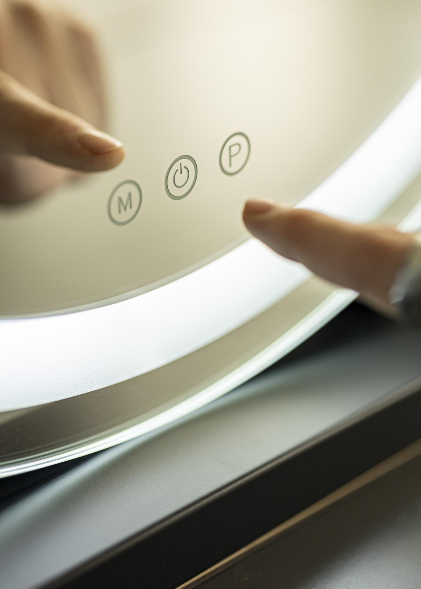 Αυτός είναι ένας καθρέφτης μακιγιάζ σε κάθετο μοντέλο, με μια βάση σε ουδέτερο μαύρο χρώμα που μπορεί εύκολα να ταιριάξει με την υπόλοιπη διακόσμηση. Η επιφάνεια του καθρέφτη έχει μια κλασική στρογγυλή μορφή με διάμετρο 50 εκ., που όμορφα πλαισιώνεται από μια ενσωματωμένη λωρίδα LED. Υπάρχουν τρία κουμπιά αφής στο κάτω άκρο της επιφάνειας του καθρέφτη – ένα κουμπί ενεργοποίησης/απενεργοποίησης που ανάβει και σβήνει τον φωτισμό, ένα κουμπί "M" που ρυθμίζει τη θερμοκρασία χρώματος του φωτός και ένα κουμπί "P" που σας επιτρέπει να χαμηλώσετε την ένταση του φωτισμού όπως επιθυμείτε. Η σύνδεση με το ρεύμα γίνεται με πρίζα.