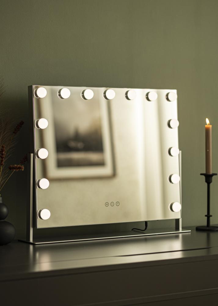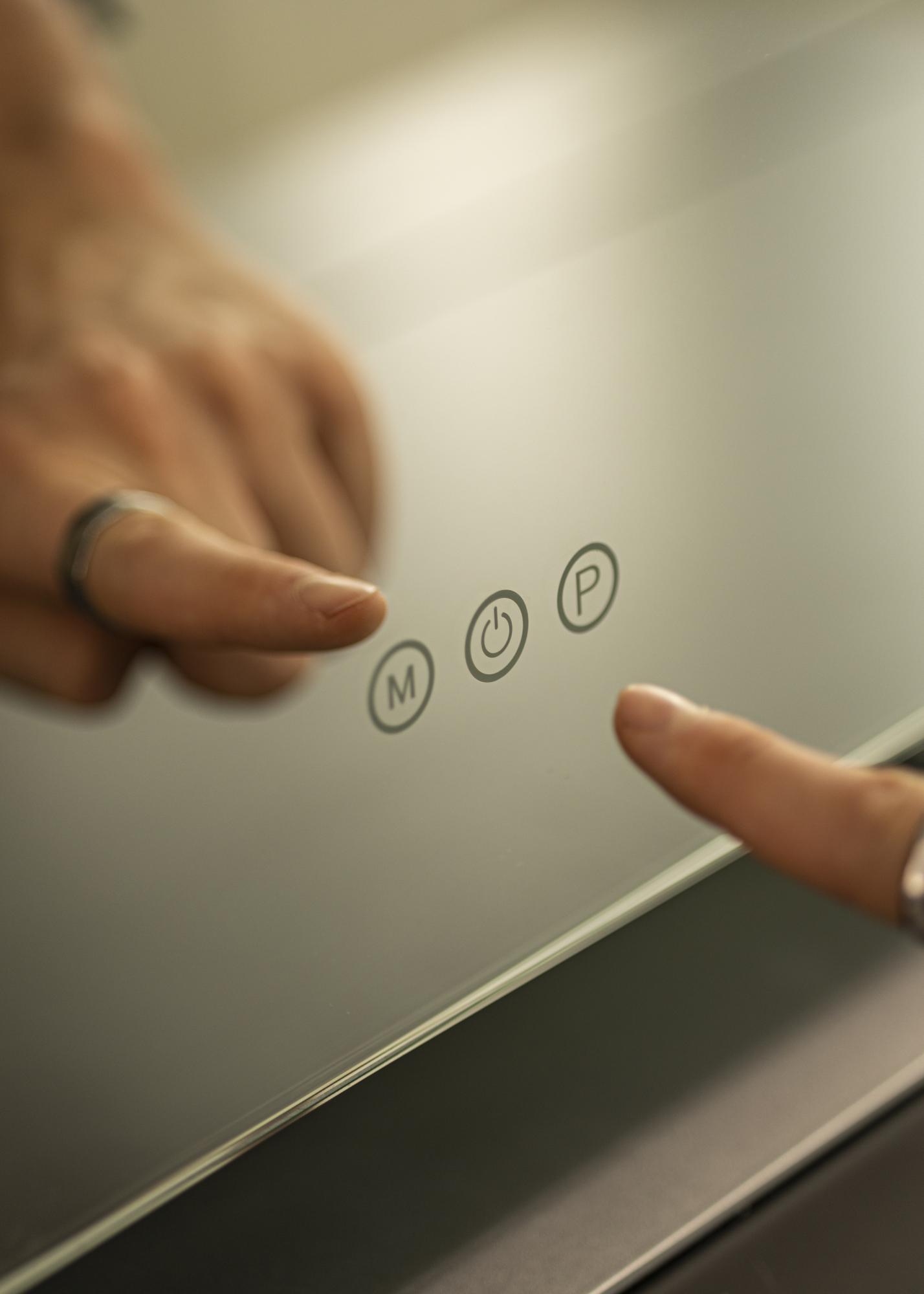Με έναν κομψό καθρέφτη μακιγιάζ μπορείτε να δημιουργήσετε μια πολυτελή ατμόσφαιρα σε κάθε δωμάτιο. Αυτός ο καθρέφτης διαθέτει ενσωματωμένο φωτισμό LED που μπορείτε να προσαρμόσετε ανάλογα με το αν θέλετε ευχάριστο φόντο φωτισμού στο σαλόνι ή έντονο φως για τη γωνία του μακιγιάζ. Για να προσαρμόσετε τον φωτισμό χρησιμοποιείτε τα κουμπιά αφής στη κάτω άκρη του καθρέφτη· το κουμπί "M" ρυθμίζει τη θερμοκρασία χρώματος του φωτός και το κουμπί "P" αλλάζει τη φωτεινότητα. Υπάρχει επίσης ένα κουμπί απενεργοποίησης/ενεργοποίησης για να ανάβετε και να σβήνετε τον φωτισμό του καθρέφτη. Η ηλεκτρική σύνδεση γίνεται με βύσμα.