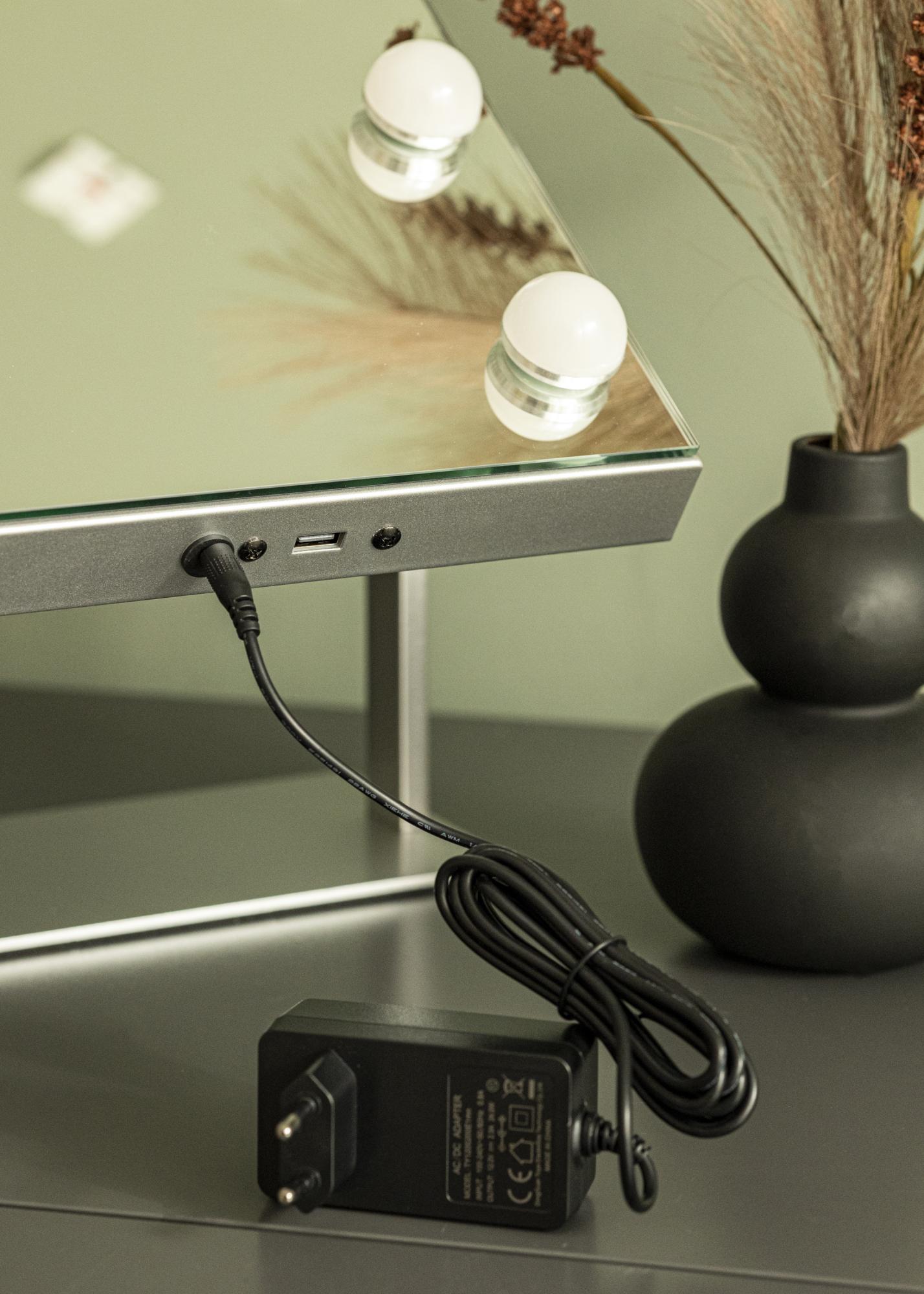 Αυτός ο καθρέφτης έχει μια ασημί βάση που προσδίδει μια κομψή όψη και σας επιτρέπει να κλίνετε την επιφάνεια του καθρέφτη. Στη κάτω άκρη του καθρέφτη υπάρχει μια υποδοχή USB για φόρτιση των έξυπνων συσκευών σας.