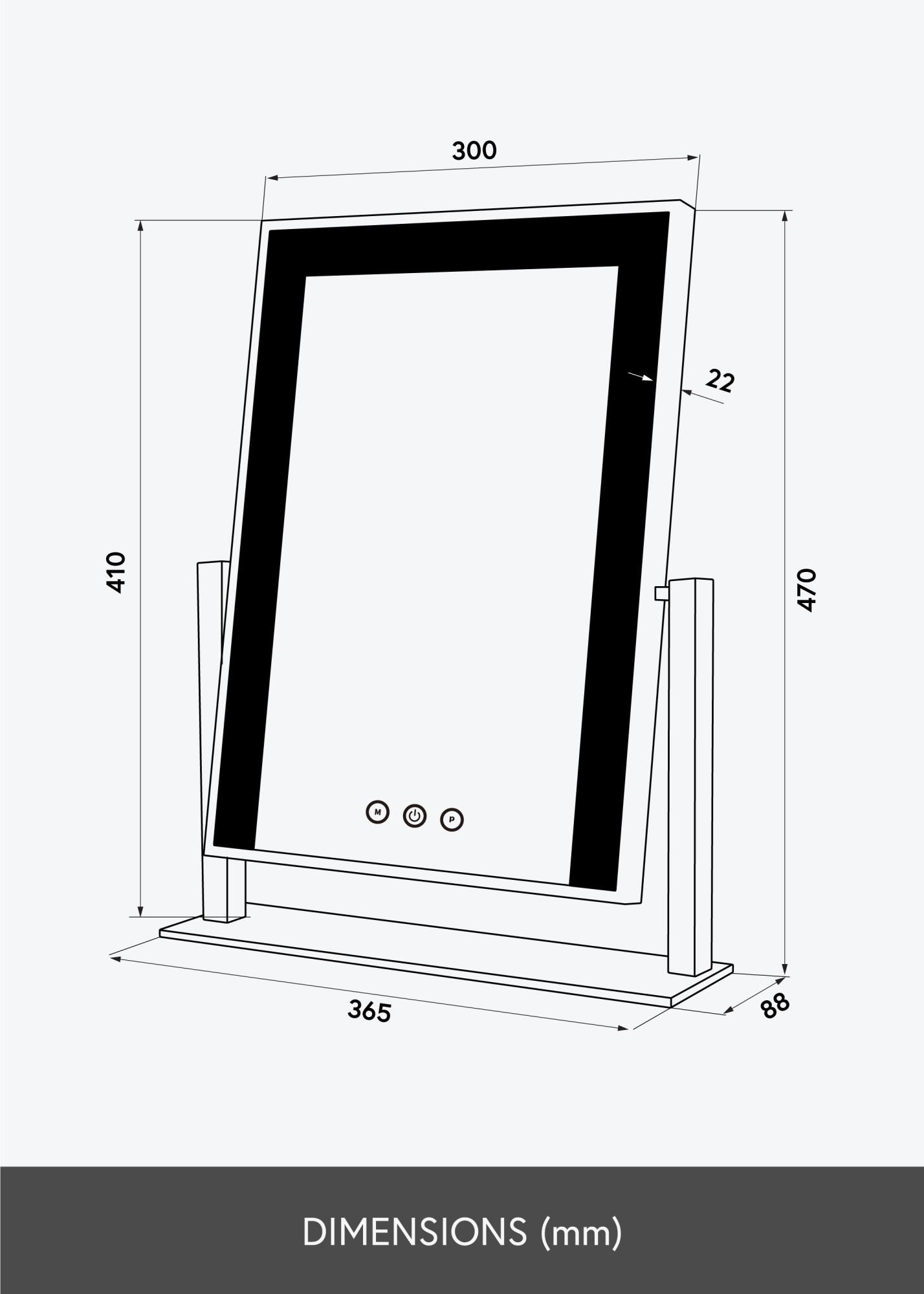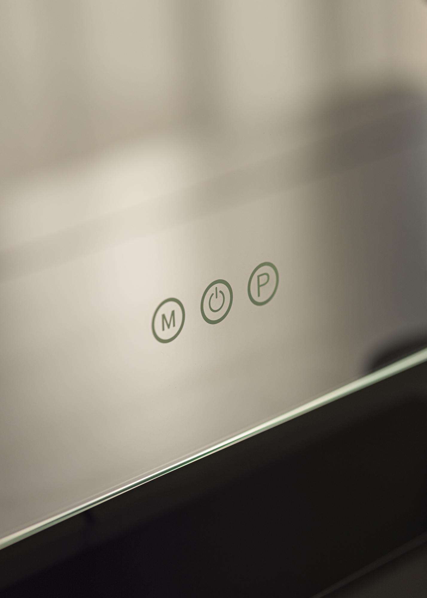 Αυτός ο καθρέφτης διαθέτει ενσωματωμένη λωρίδα LED που πλαισιώνει την επιφάνεια του καθρέφτη. Μπορείτε να μειώσετε τον φωτισμό με τη βοήθεια του κουμπιού αφής που σημειώνεται με "P" και να ρυθμίσετε τη θερμοκρασία χρώματος του φωτός με το κουμπί αφής που σημειώνεται με "M". Με αυτόν τον τρόπο μπορείτε να αλλάξετε τις ρυθμίσεις του φωτισμού του καθρέφτη ανάλογα με την περίσταση, είτε θέλετε έναν απαλό φωτισμό φόντου είτε έναν πιο έντονο φωτισμό που σας βοηθά να εστιάσετε στην αντανάκλασή σας. Υπάρχει επίσης ένα κουμπί ενεργοποίησης/απενεργοποίησης που μπορείτε να χρησιμοποιήσετε για να ανάψετε και να σβήσετε τον φωτισμό του καθρέφτη. Η σύνδεση στο ρεύμα γίνεται με πρίζα.
