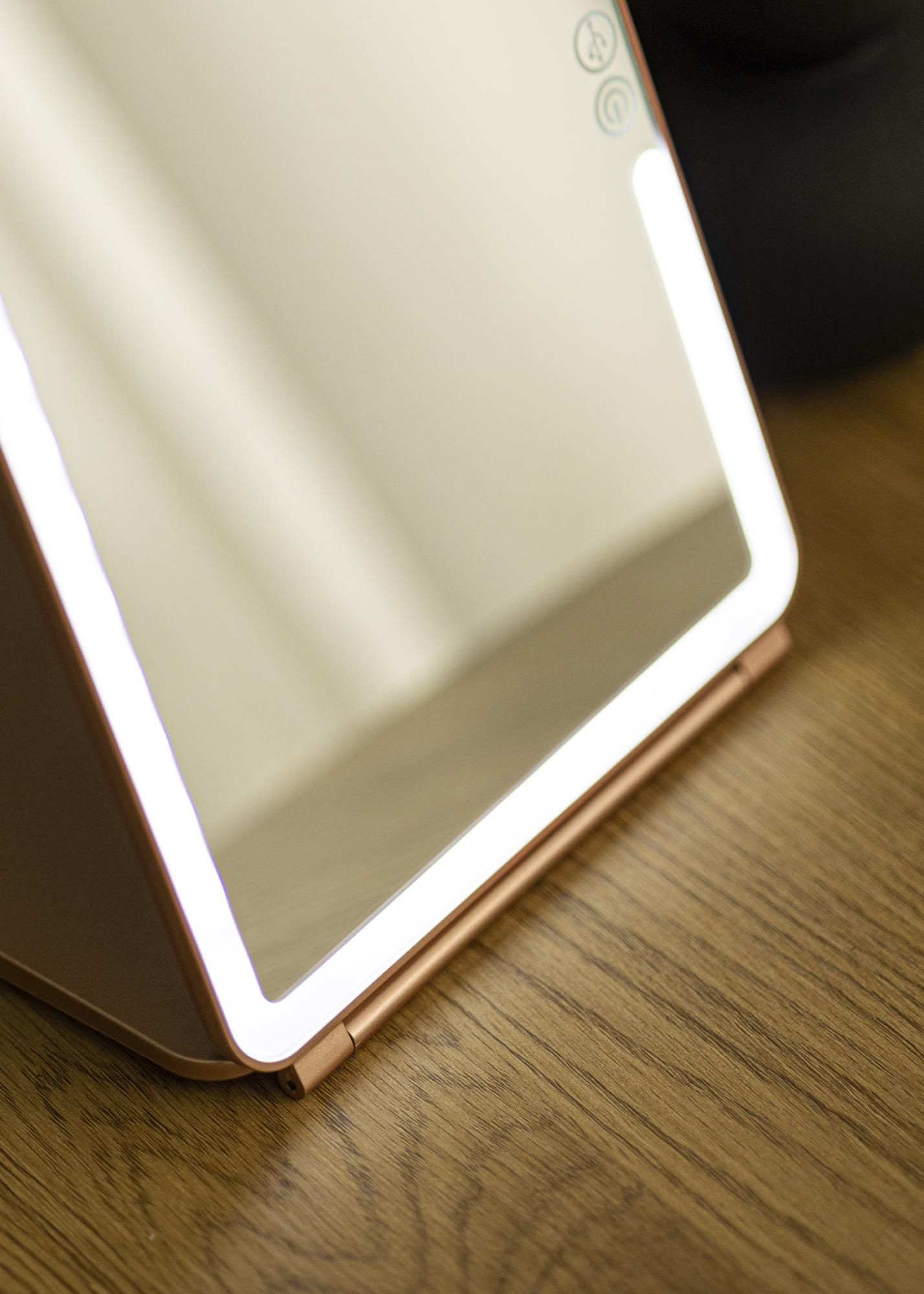 Αυτός είναι ένας καθρέφτης μακιγιάζ που είναι τέλειος για χρήση εν κινήσει, χάρη στο λεπτό μέγεθός του, την αναδιπλούμενη σχεδίαση και τον ενσωματωμένο φωτισμό LED. Έχει επίσης μια μοντέρνα απόχρωση σε ροζ χρυσό. Ο καθρέφτης μακιγιάζ χωράει εύκολα στην τσάντα σας, τόσο για καθημερινή χρήση όσο και όταν ταξιδεύετε. Η αναδιπλούμενη σχεδίαση προστατεύει την επιφάνεια του καθρέφτη από γρατζουνιές και βρωμιά και σας επιτρέπει να γέρνετε τον καθρέφτη στην επιθυμητή θέση. Ο καθρέφτης είναι εξοπλισμένος με απλό γυαλί καθρέφτη και δύο μικρότερες επιφάνειες καθρεφτών· μία με ζουμ 5x και μία με ζουμ 3x.