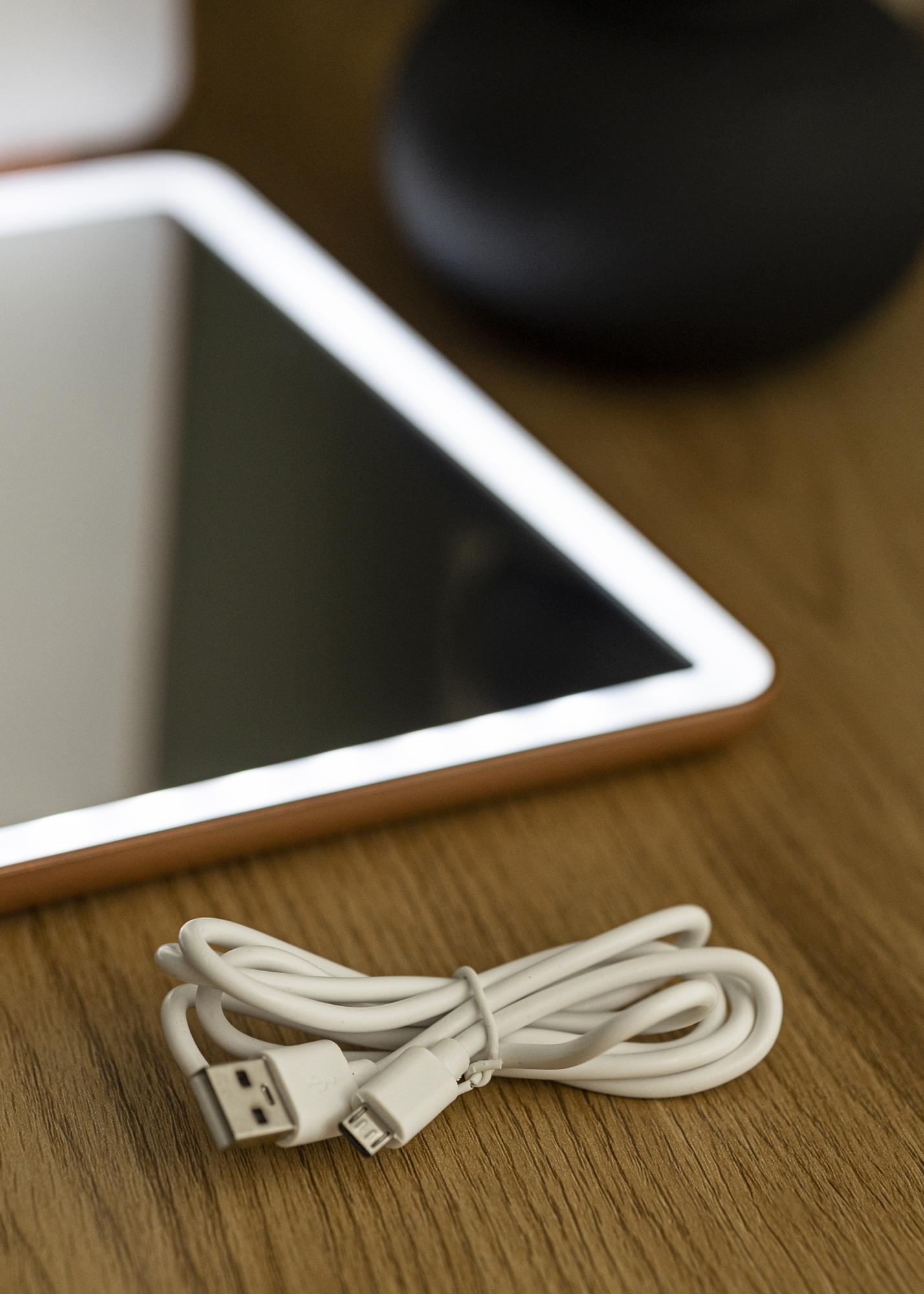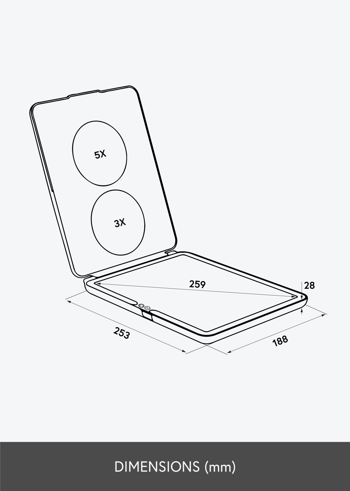 Η ενσωματωμένη λωρίδα LED παρέχει ευχάριστο φως όταν καθρεφτίζεστε. Ο φωτισμός λειτουργεί από μια ενσωματωμένη μπαταρία που φορτίζεται εύκολα μέσω σύνδεσης USB. Ο καθρέφτης είναι εξοπλισμένος με κουμπί αφής που χρησιμοποιείται για την ενεργοποίηση και απενεργοποίηση του φωτισμού καθώς και για τη μείωση της φωτεινότητας. Όταν κλείνετε τον καθρέφτη ενώ είναι αναμμένος, αυτός τίθεται αυτόματα σε λειτουργία εξοικονόμησης ενέργειας και η λυχνία σβήνει μέχρι να ανοίξετε ξανά τον καθρέφτη.