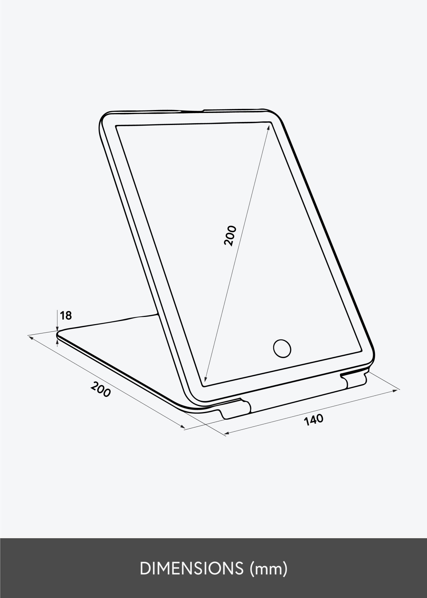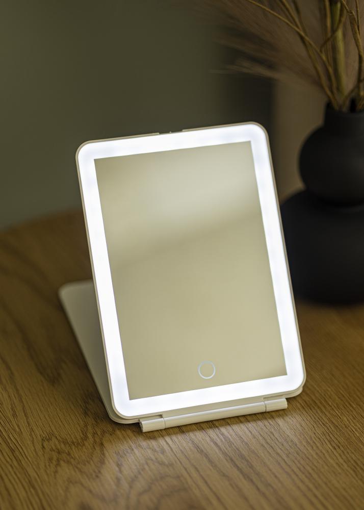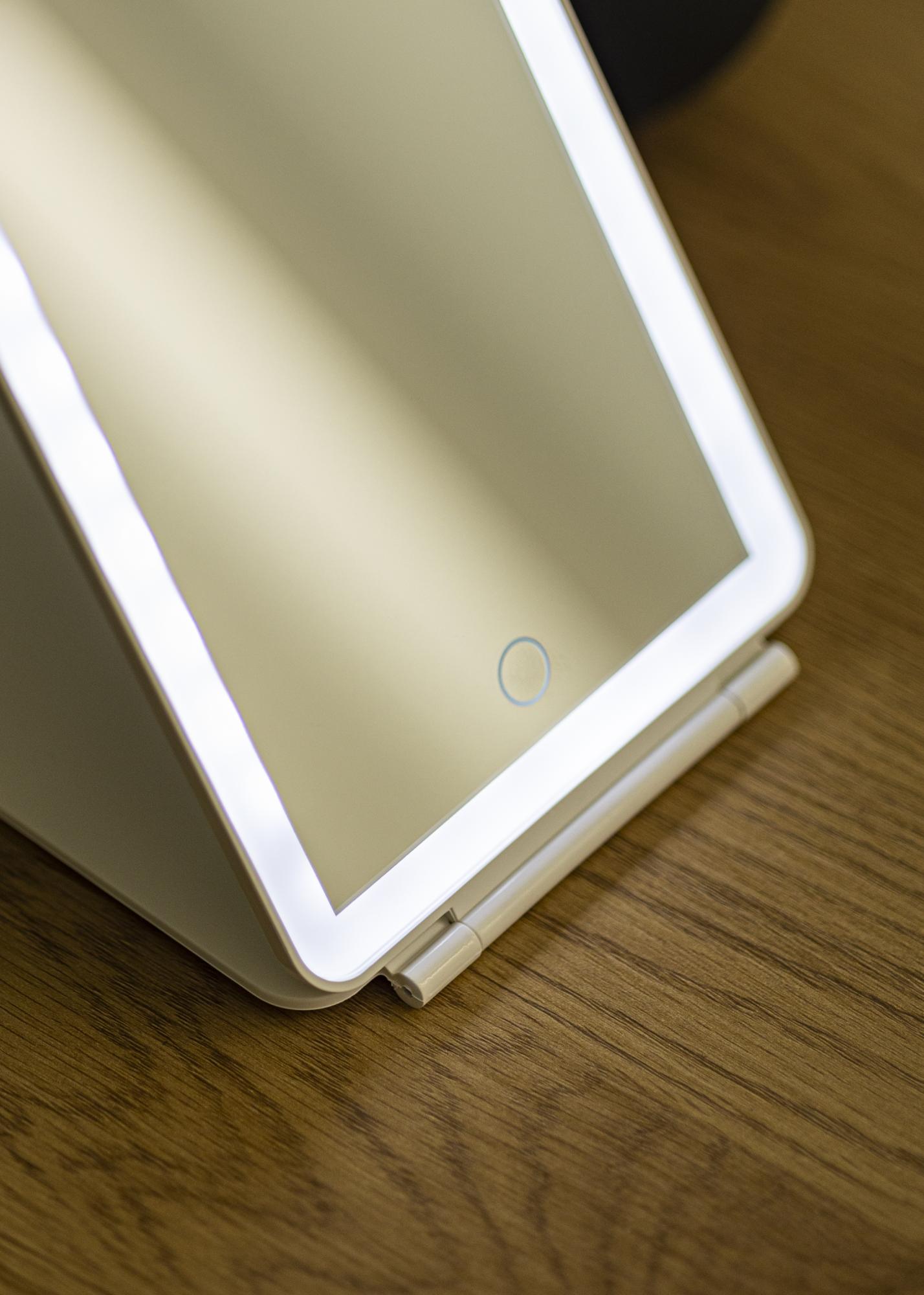 Αυτός είναι ένας λευκός καθρέφτης με ενσωματωμένο φωτισμό LED που παρέχει ευχάριστο φως στο πρόσωπό σας. Είναι με μπαταρία και μπορεί να φορτιστεί εύκολα μέσω USB-σύνδεσης όταν η μπαταρία αρχίζει να εξαντλείται. Περιλαμβάνεται καλώδιο για φόρτιση. Ο καθρέφτης ανάβει μέσω ενός κουμπιού αφής στην επιφάνεια του καθρέφτη, με το οποίο μπορείτε επίσης να ρυθμίσετε τον φωτισμό. Κρατώντας το κουμπί για λίγα δευτερόλεπτα μπορείτε να ρυθμίσετε τόσο την ένταση του φωτός όσο και τη θερμοκρασία του χρώματος.