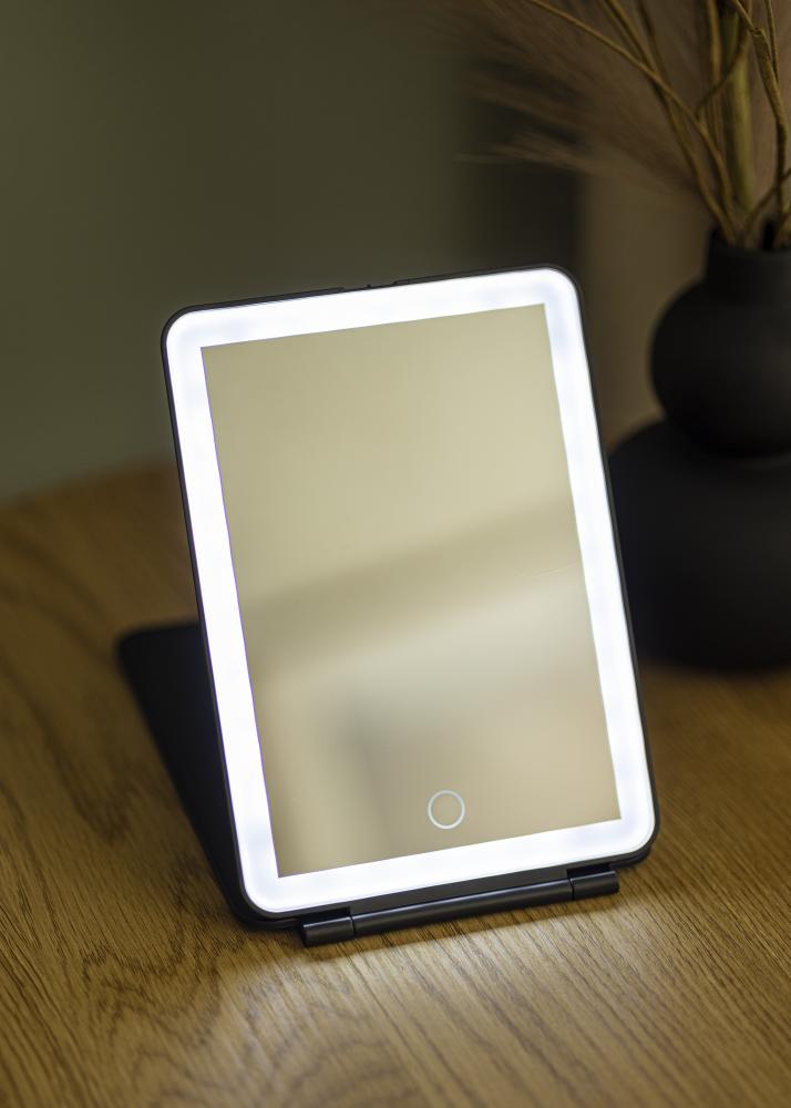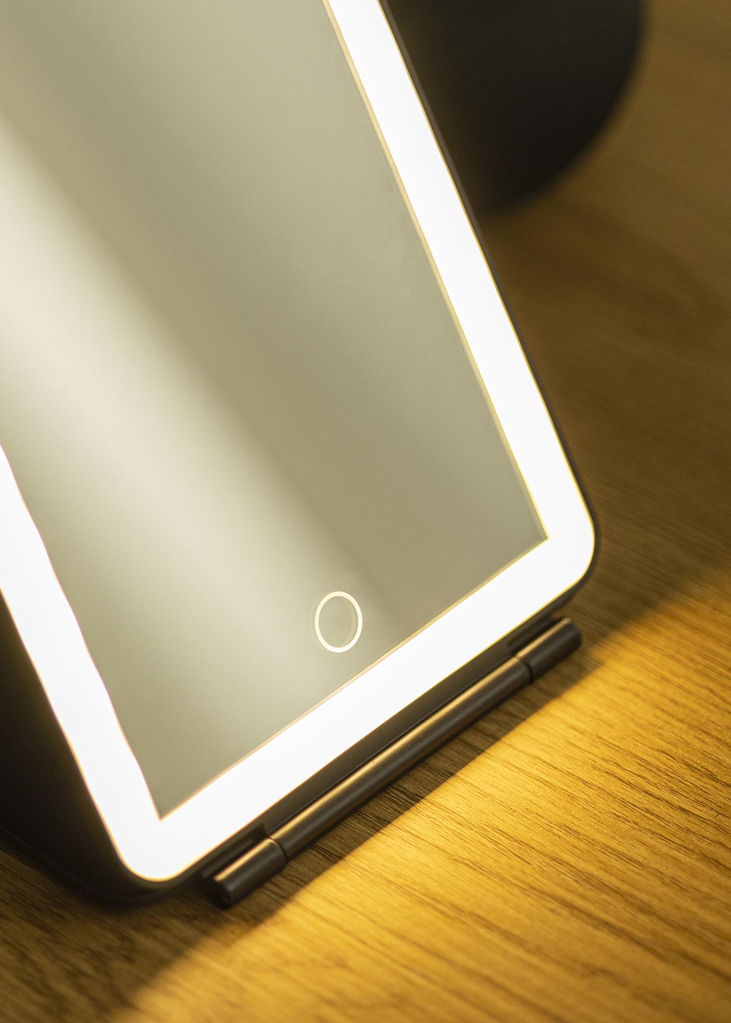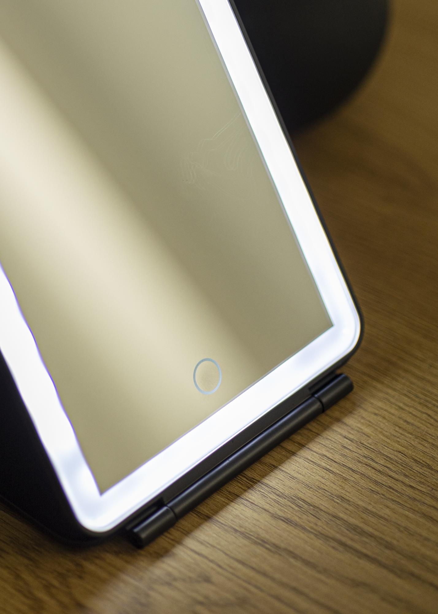 Αυτός ο καθρέφτης έχει έναν κομψό μαύρο χρώμα και είναι πτυσσόμενος, κάτι που εξοικονομεί χώρο και προστατεύει την επιφάνεια του καθρέφτη απ' το να γρατσουνιστεί όταν αποθηκεύεις τον καθρέφτη στην τσάντα σου. Σε ανυψωμένη θέση, μπορείς να κλίνεις τον καθρέφτη. Στην επιφάνεια του καθρέφτη υπάρχει ένα κουμπί αφής που ενεργοποιεί και απενεργοποιεί τον φωτισμό του καθρέφτη. Κρατώντας το κουμπί πατημένο για μερικά δευτερόλεπτα, μπορείς να αλλάξεις τις ρυθμίσεις φωτισμού. Μπορείς τότε να μειώσεις το φως και να ρυθμίσεις τη θερμοκρασία χρώματος.