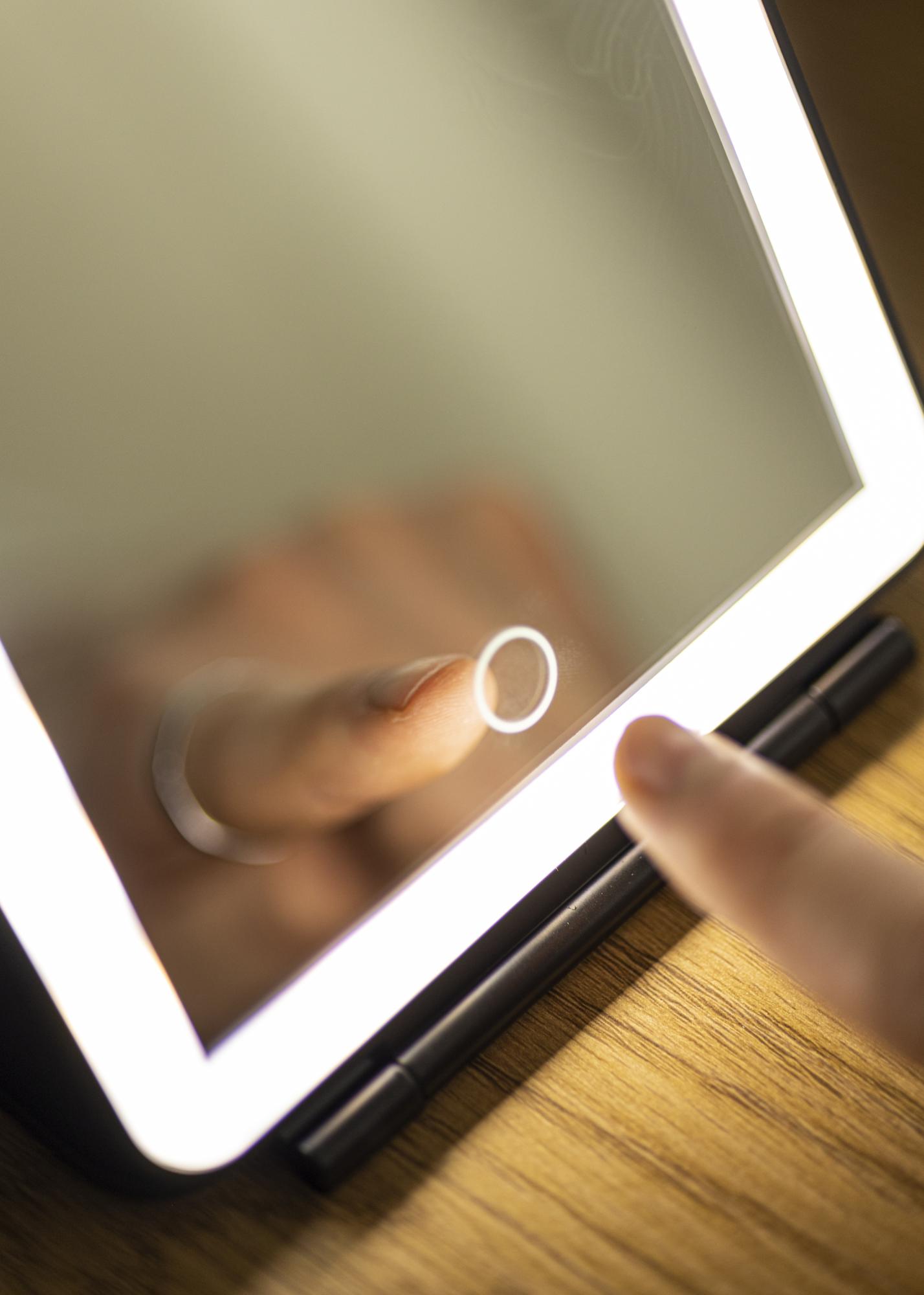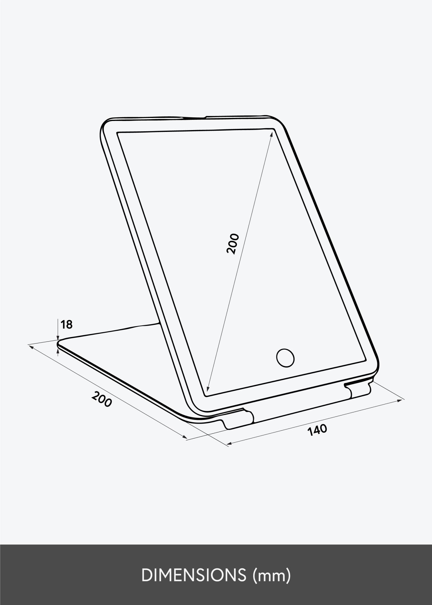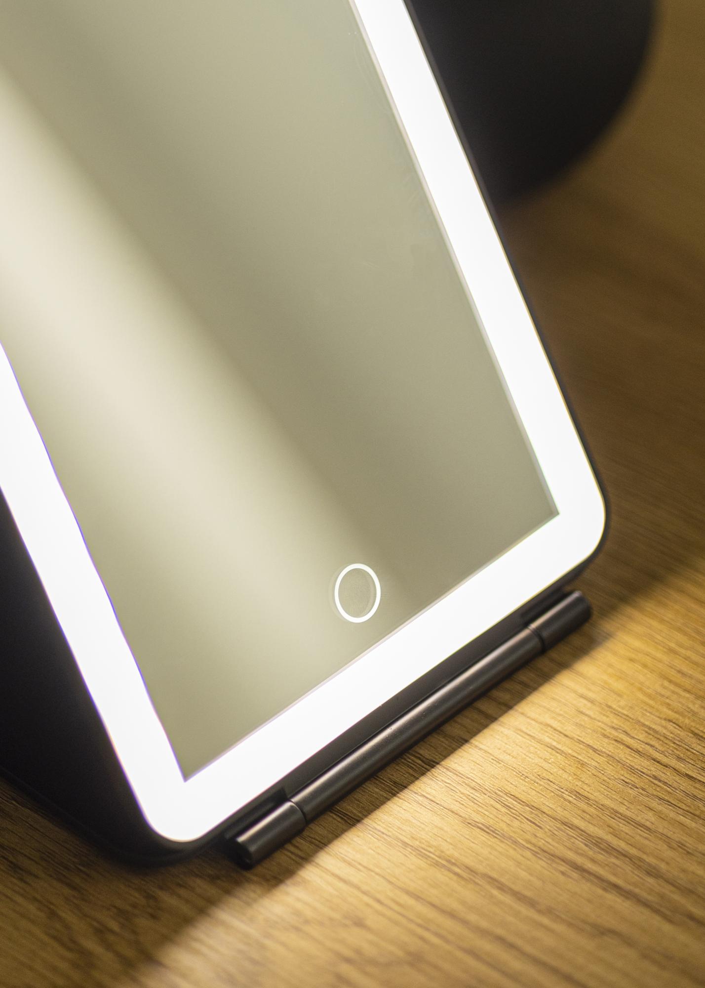 Αυτός ο καθρέφτης έχει έναν κομψό μαύρο χρώμα και είναι πτυσσόμενος, κάτι που εξοικονομεί χώρο και προστατεύει την επιφάνεια του καθρέφτη απ' το να γρατσουνιστεί όταν αποθηκεύεις τον καθρέφτη στην τσάντα σου. Σε ανυψωμένη θέση, μπορείς να κλίνεις τον καθρέφτη. Στην επιφάνεια του καθρέφτη υπάρχει ένα κουμπί αφής που ενεργοποιεί και απενεργοποιεί τον φωτισμό του καθρέφτη. Κρατώντας το κουμπί πατημένο για μερικά δευτερόλεπτα, μπορείς να αλλάξεις τις ρυθμίσεις φωτισμού. Μπορείς τότε να μειώσεις το φως και να ρυθμίσεις τη θερμοκρασία χρώματος.