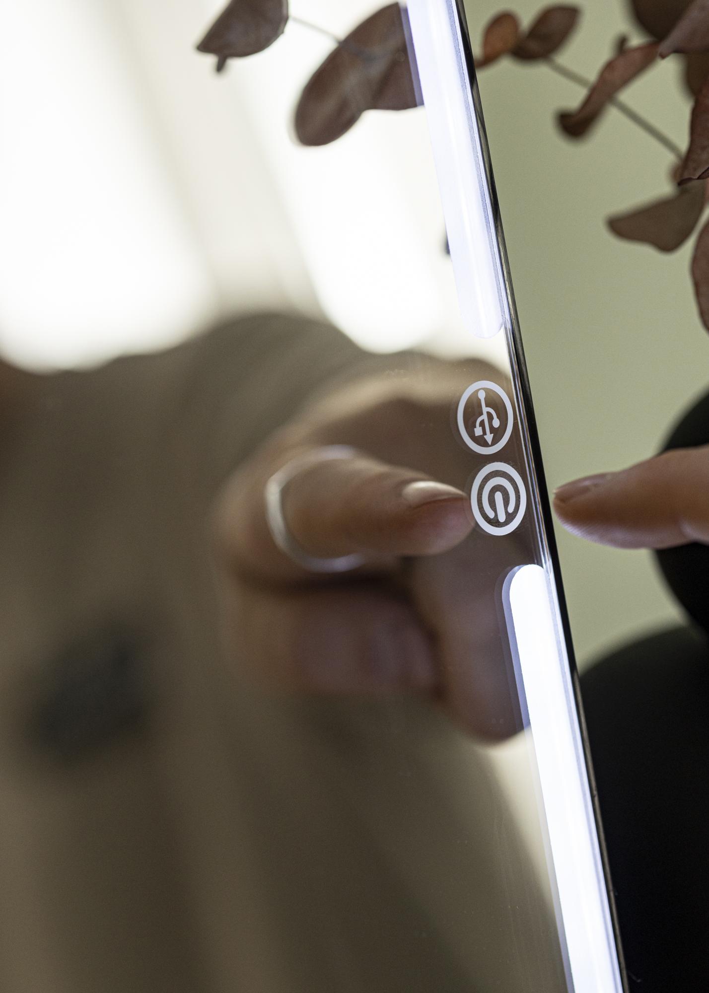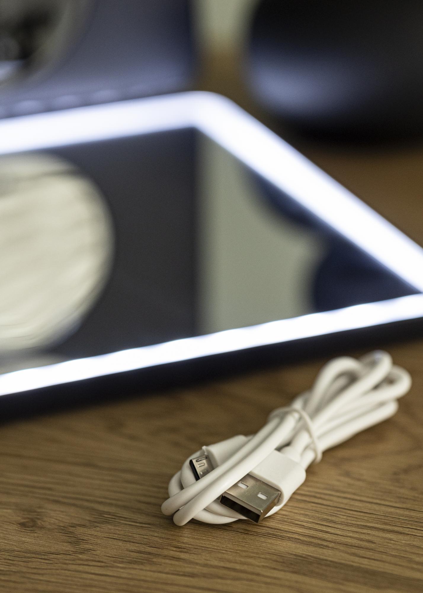 Αυτός ο καθρέφτης μακιγιάζ έχει κομψό μαύρο χρώμα και ενσωματωμένο φωτισμό LED. Ο φωτισμός ρυθμίζεται μέσω κουμπιών αφής στη στεφάνη του καθρέφτη, με τα οποία επίσης ανάβετε και σβήνετε τον καθρέφτη. Όταν κλείνετε τον καθρέφτη σε λειτουργία ενεργοποίησης, μπαίνει αυτόματα σε λειτουργία εξοικονόμησης ενέργειας και όταν τον ανοίγετε ξανά, αρχίζει να φωτίζει ξανά. Ο καθρέφτης λειτουργεί με μπαταρία και φορτίζεται μέσω σύνδεσης USB.