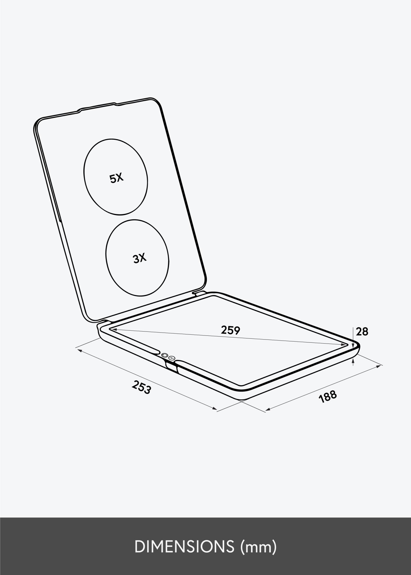 Θέλετε έναν καθρέφτη μακιγιάζ σε μέγεθος ταξιδιού που να χωράει τέλεια στην τσάντα; Τότε αυτός ο συμπαγής καθρέφτης μακιγιάζ είναι μια καλή επιλογή! Ο καθρέφτης έχει επιφάνεια καθρέφτη 18,5x25 cm και αναδιπλούμενο σχεδιασμό που προστατεύει τον καθρέφτη από βρωμιά και σκόνη. Ο αναδιπλούμενος σχεδιασμός σας επιτρέπει επίσης να γείρετε τον καθρέφτη κατά τη χρήση. Εκτός από το κανονικό γυαλί καθρέφτη, ο καθρέφτης διαθέτει ζώνη με 5x ζουμ και ζώνη με 3x ζουμ.