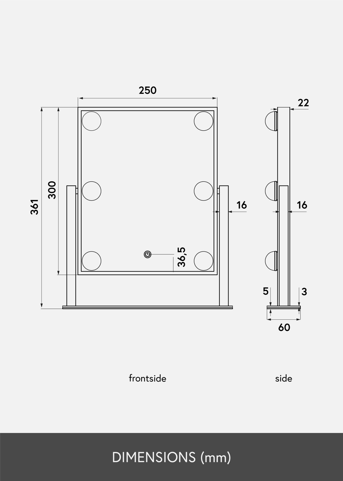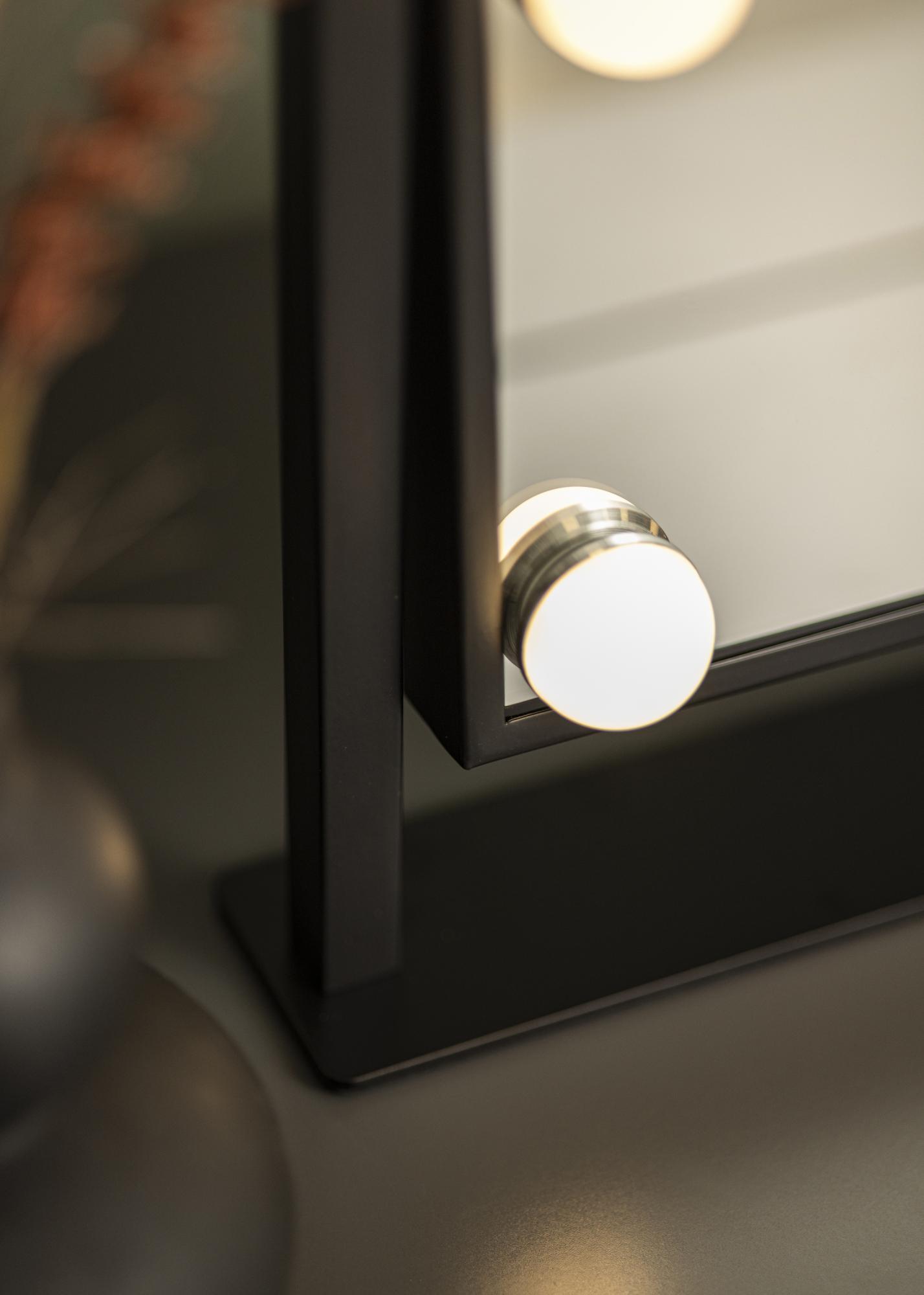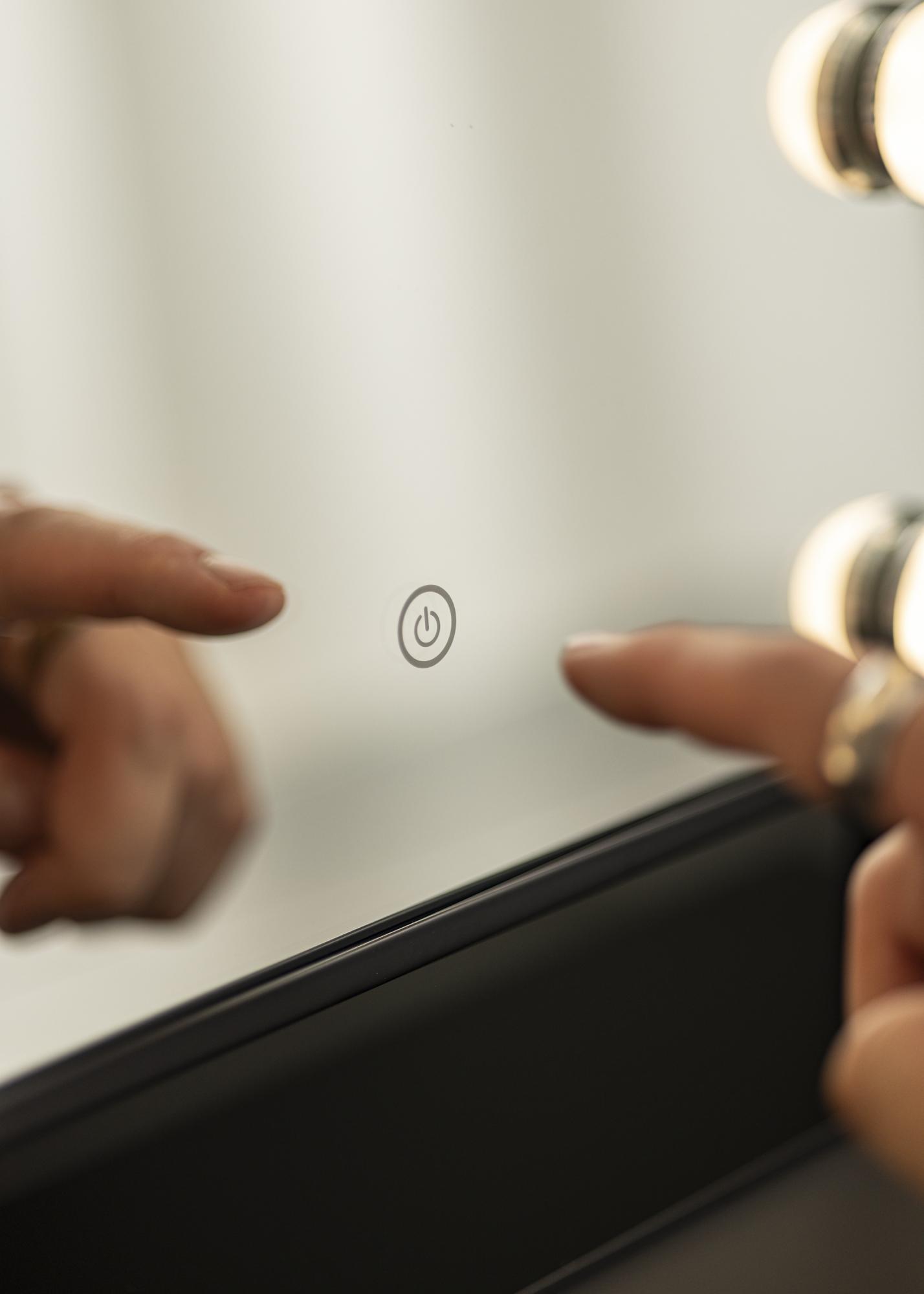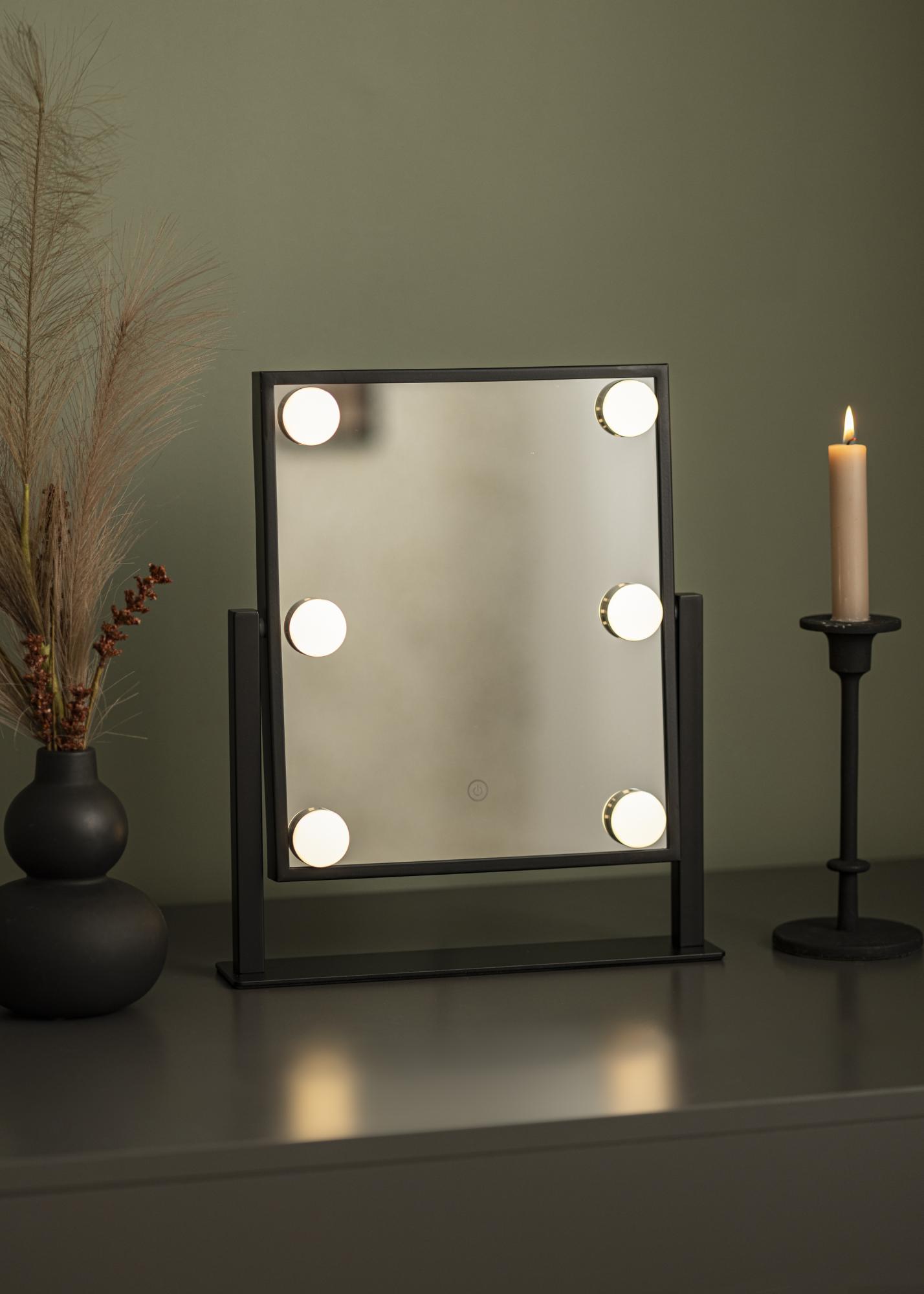 Αυτός είναι ένας πραγματικά πολυτελής καθρέφτης μακιγιάζ με έξι διακοσμητικές και ρυθμιζόμενες LED λάμπες σε μια μοντέρνα μαύρη απόχρωση. Ο φωτισμός προσφέρει ένα ζεστό λευκό φως στις 3000K και ανάβει με το πάτημα του κουμπιού αφής. Ρυθμίστε την ένταση των λαμπτήρων κρατώντας το κουμπί για μερικά δευτερόλεπτα. Η LED είναι μια πηγή φωτός που καταναλώνει λιγότερη ενέργεια, έχει μεγαλύτερη διάρκεια ζωής και παρέχει πιο φυσικό και ομοιόμορφο φως. Ο καθρέφτης μακιγιάζ μπορεί να κλίνει ώστε να εφαρμόζετε το μακιγιάζ σας με μεγαλύτερη ακρίβεια. Εκτός από τις πολλές του λειτουργίες, αυτός ο καθρέφτης μακιγιάζ έχει μία πραγματική αίσθηση Hollywood και γίνεται μία κομψή λεπτομέρεια στο σπίτι!