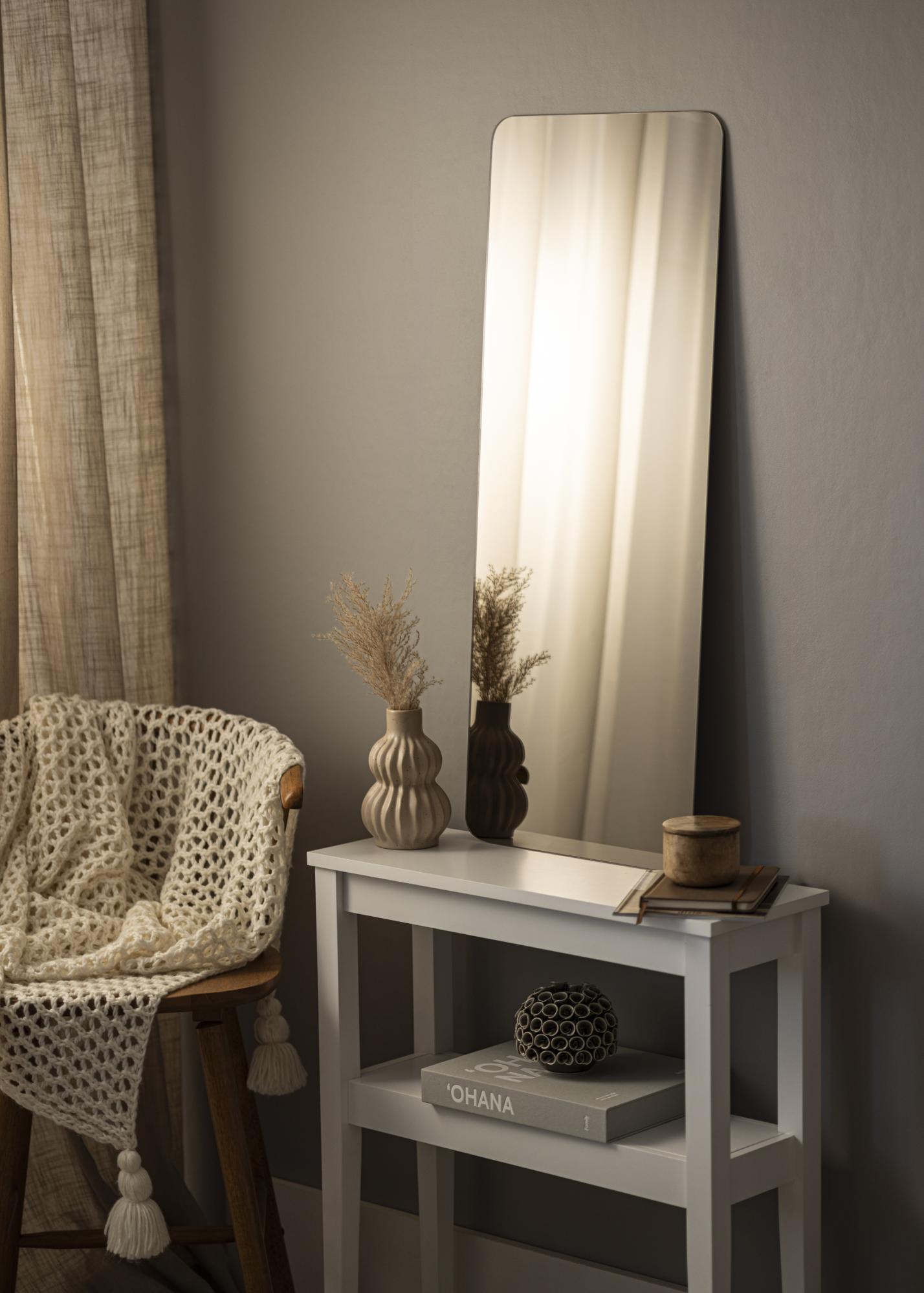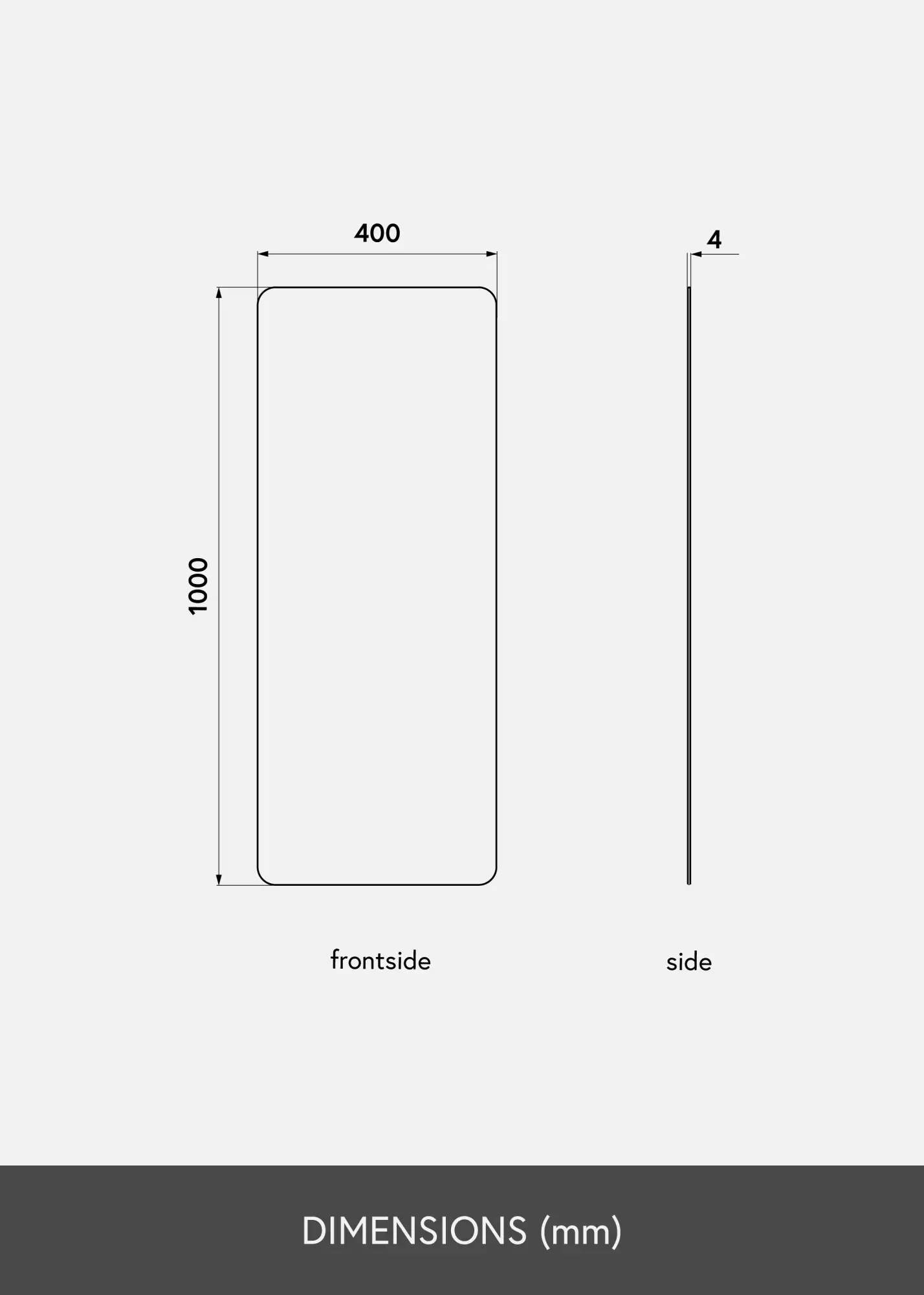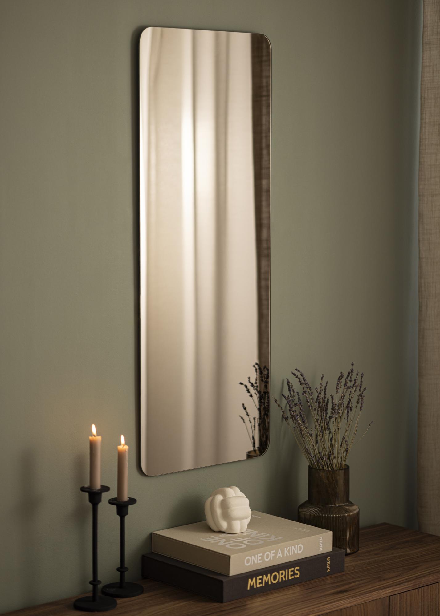 Αυτός είναι ένας ορθογώνιος καθρέφτης με διακοσμητικά στρογγυλεμένες γωνίες που του δίνουν μια απαλή και κομψή εμφάνιση. Το γυαλί του καθρέφτη είναι βαμμένο σε μια κομψή απόχρωση σκούρου μπρούντζου, κάνοντας αυτόν τον καθρέφτη εντυπωσιακή και μοντέρνα διακοσμητική λεπτομέρεια για το σπίτι σας. Ο καθρέφτης είναι επίσης πολύ λεπτός και δεν έχει πλαίσιο, κάτι που συμβάλλει επιπλέον στο λεπτό, κομψό συναίσθημα του.