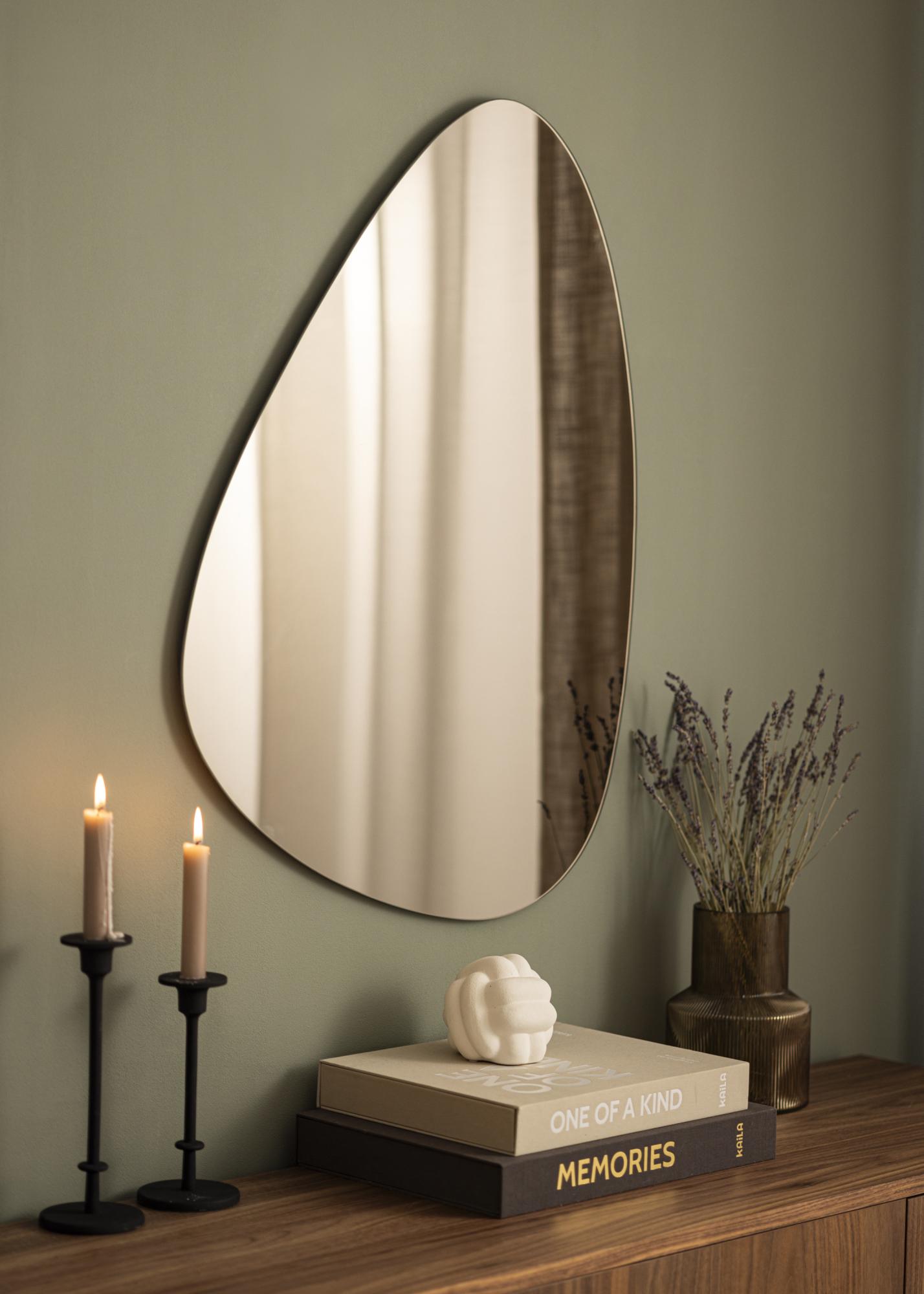 Αυτός ο ασύμμετρος καθρέφτης γίνεται μια πραγματικά κομψή και μοντέρνα λεπτομέρεια διακόσμησης στο σπίτι σας! Εκτός από τον ενδιαφέροντα σχεδιασμό σε σχήμα αυγού, αυτός ο καθρέφτης διαθέτει επίσης ένα κομψό γυαλί καθρέφτη σε τόνο μπρονζέ που ενισχύει περαιτέρω τη μοντέρνα εμφάνιση και που εναρμονίζεται όμορφα με πολλά διαφορετικά χρωματικά σχήματα. Το μαλακό σχήμα σε συνδυασμό με το γεγονός ότι ο καθρέφτης είναι πολύ λεπτός και δεν έχει πλαίσιο, προσδίδει στον καθρέφτη μια ασυνήθιστη κομψή και εκλεπτυσμένη αίσθηση. Ιδανικό ως λειτουργική και μοντέρνα διακόσμηση τοίχου στο σαλόνι, στον προθάλαμο ή στο υπνοδωμάτιο.