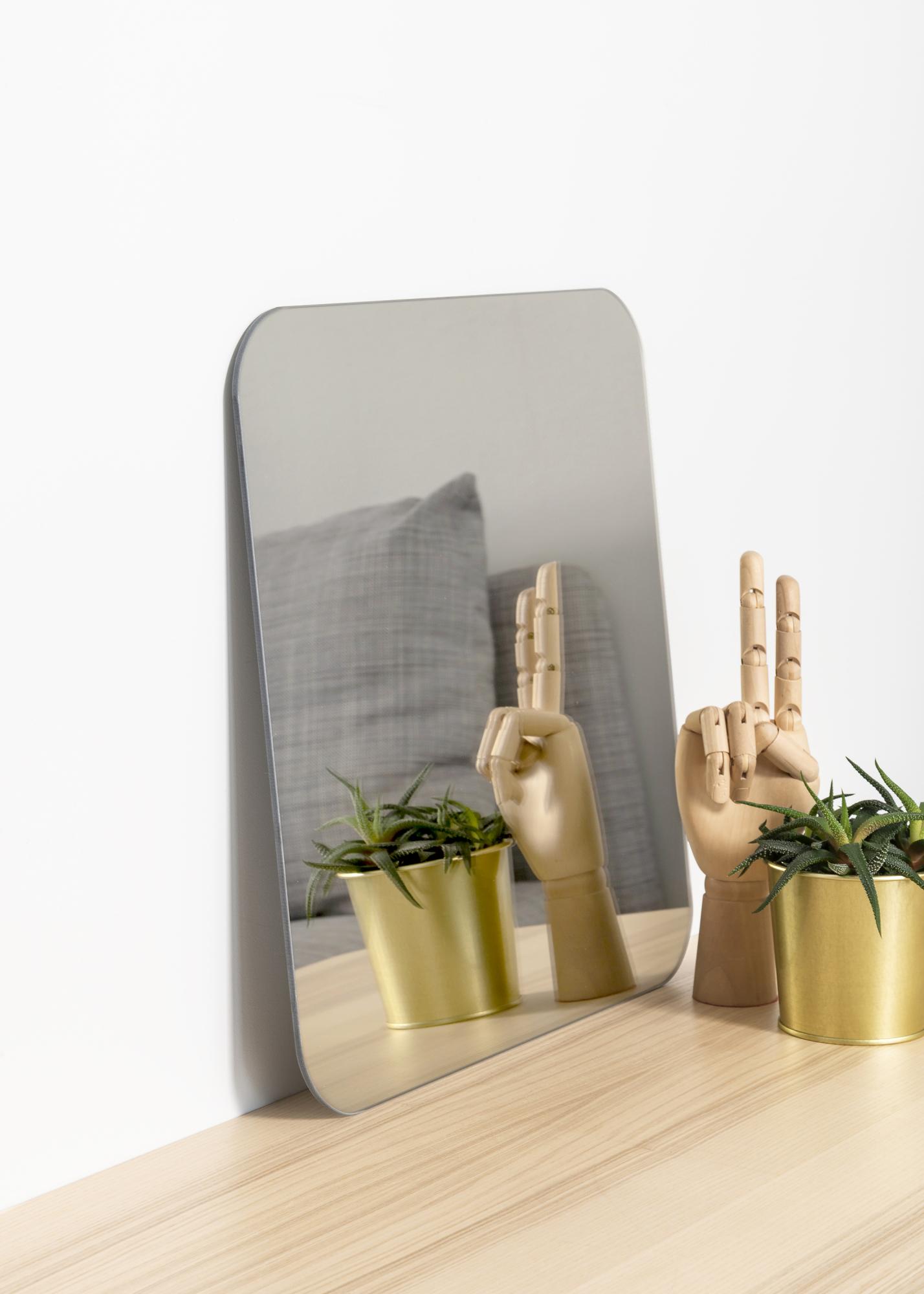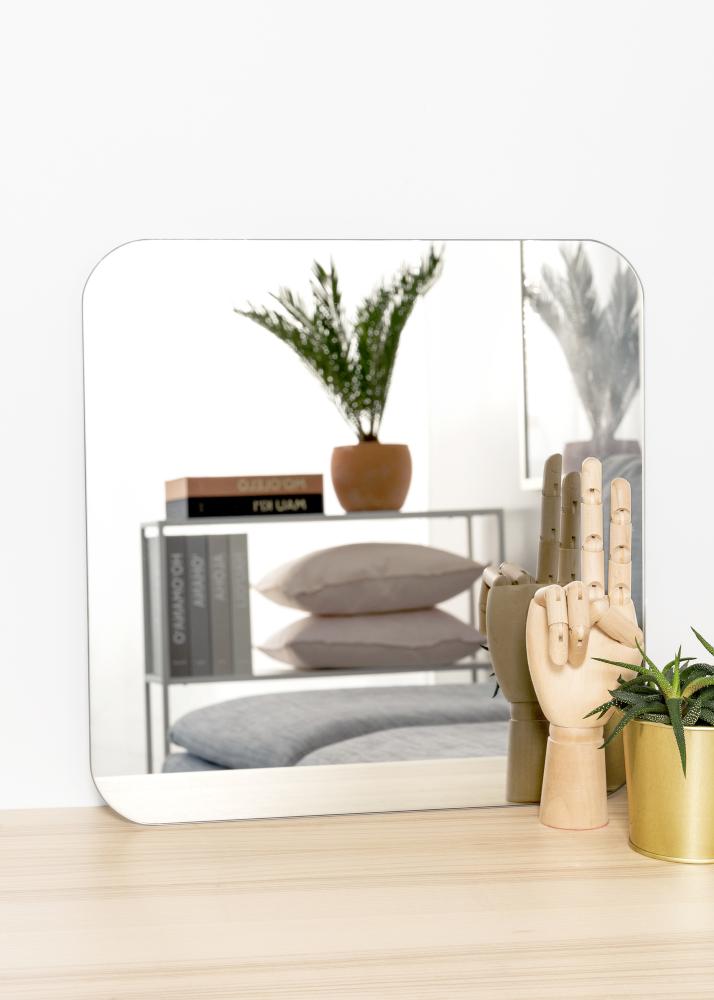 Αυτός είναι ένας τετράγωνος καθρέφτης με στρογγυλεμένες γωνίες που μαλακώνουν την εντύπωση και του προσδίδουν μια κομψή αίσθηση. Ο καθρέφτης είναι επιπλέον μόνο 4 χιλιοστά λεπτός και δεν έχει κορνίζα, κάτι που του δίνει μια μινιμαλιστική εμφάνιση και το κάνει να ταιριάζει εύκολα σε οποιοδήποτε σπίτι.