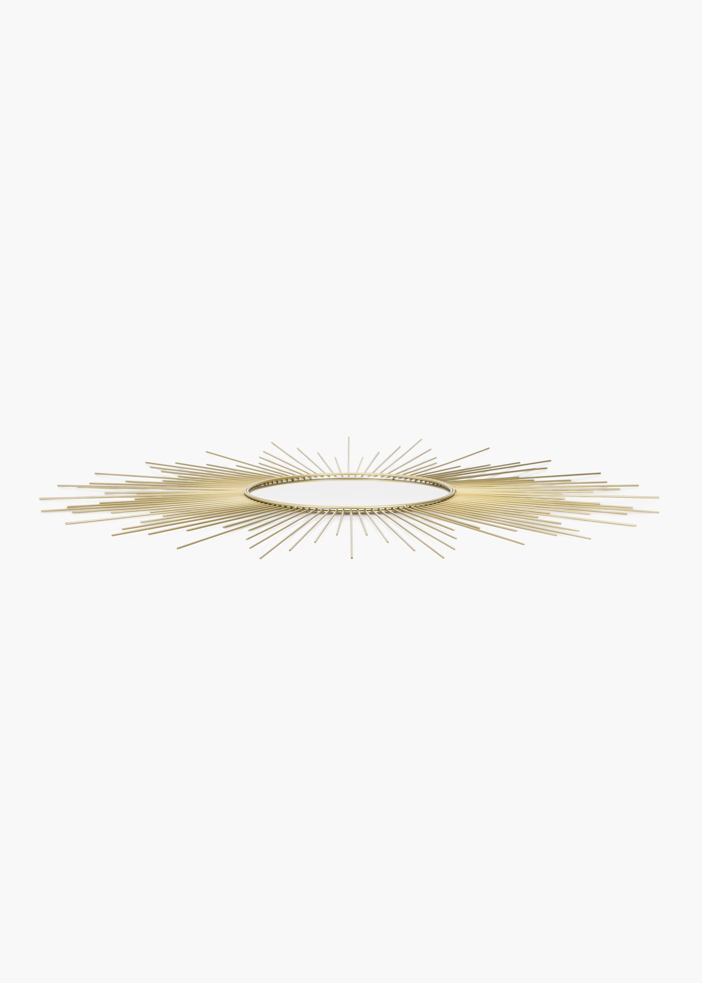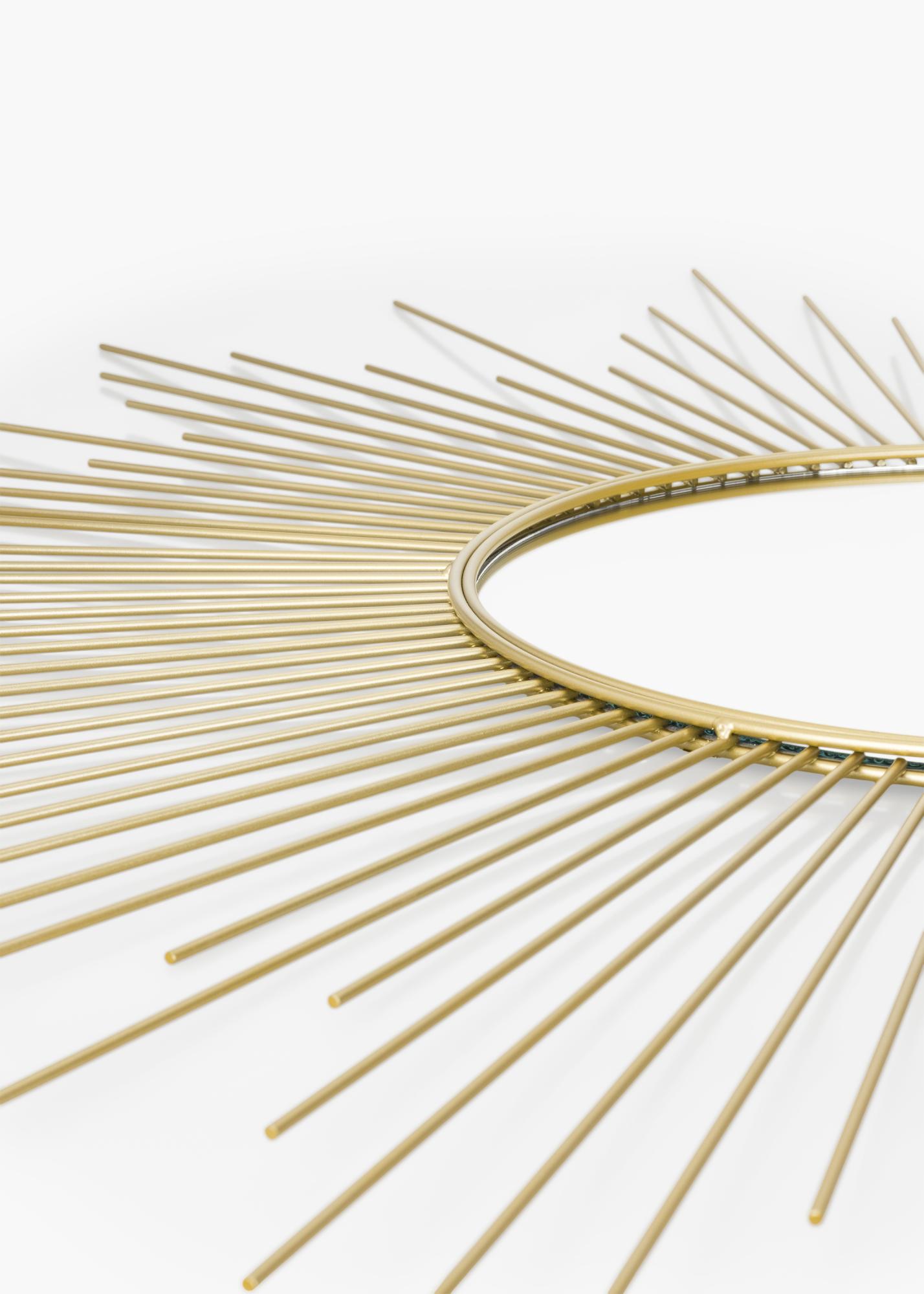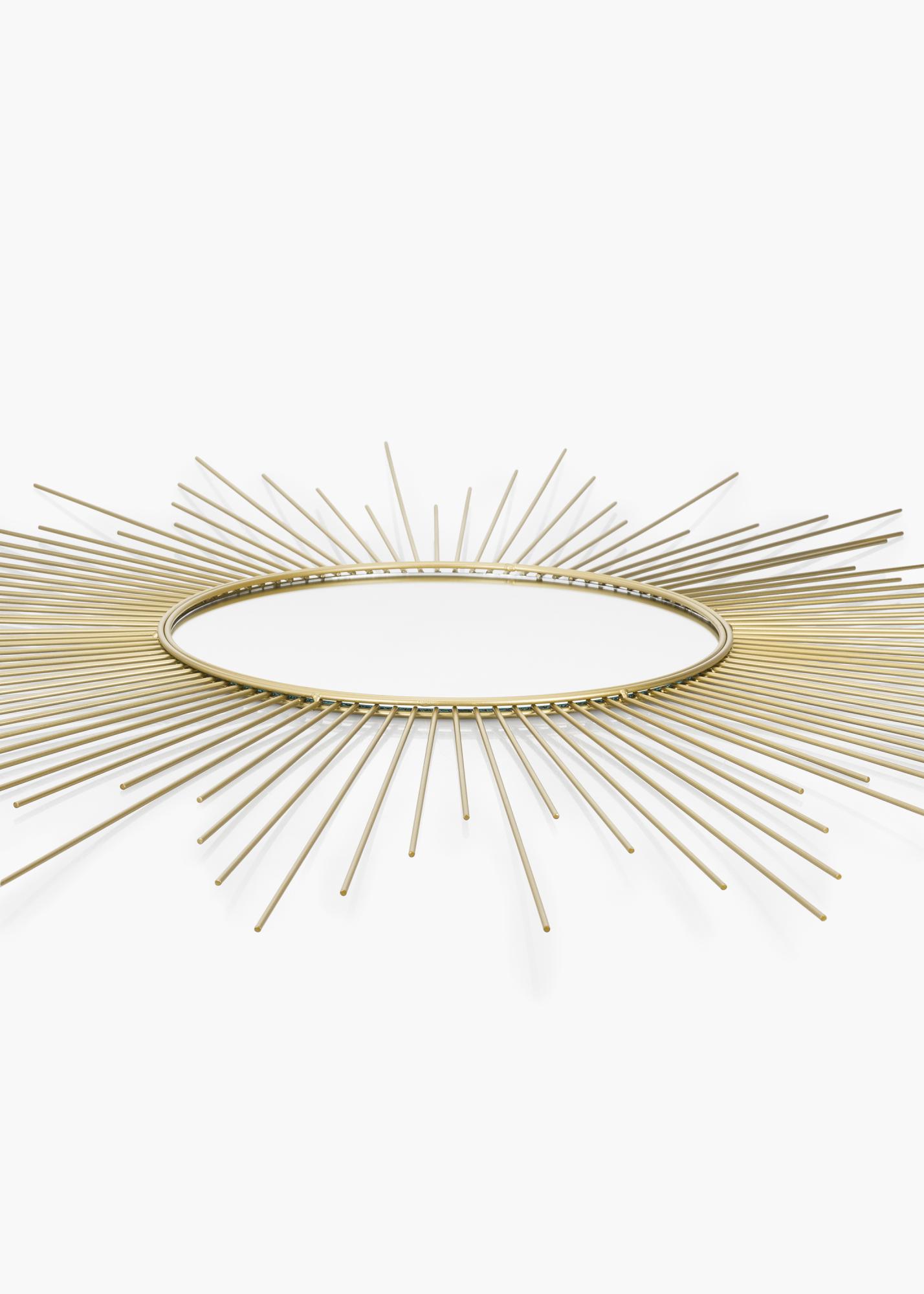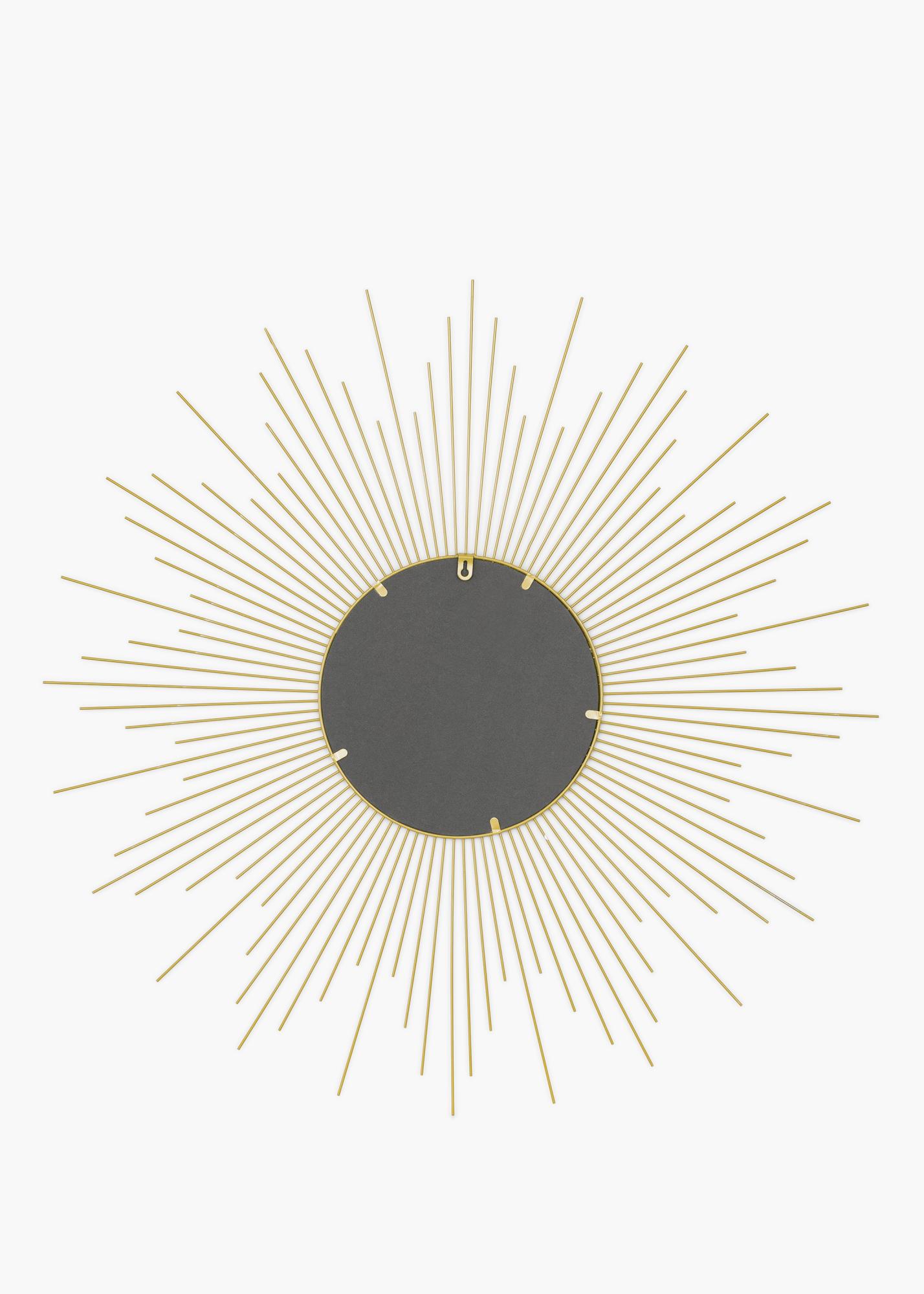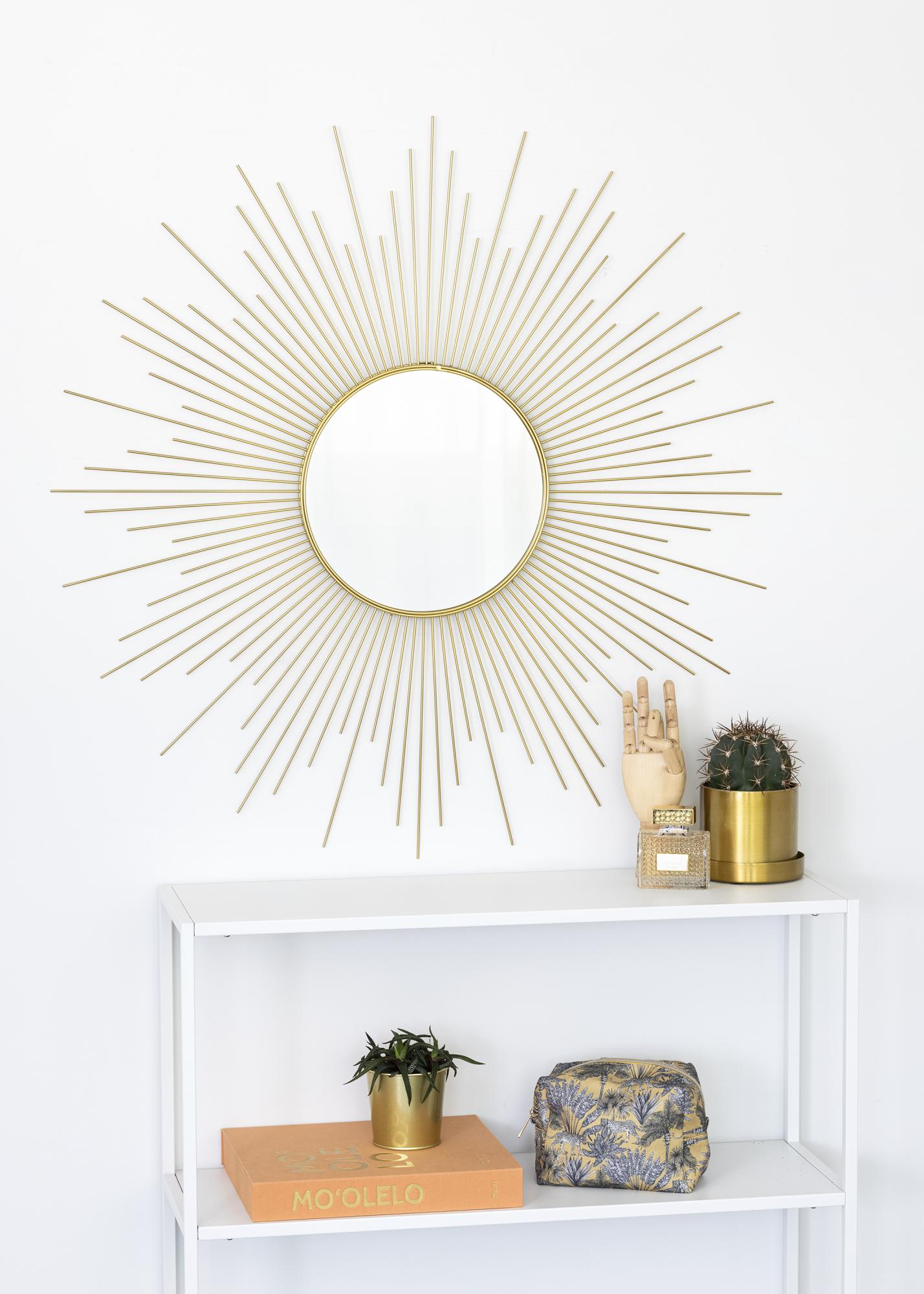 Αυτός είναι ένας στρογγυλός καθρέφτης τοίχου με πολύ διακοσμητικό σχέδιο. Το γυαλί του καθρέφτη περιβάλλεται από ένα μοτίβο που θυμίζει αστέρι και έχει μια ωραία χρυσή απόχρωση. Τοποθετήστε αυτόν τον όμορφο καθρέφτη στο σπίτι σε μια καλά επιλεγμένη θέση, ώστε να αναδείξετε το διακοσμητικό του χαρακτήρα για να δημιουργήσετε μια εντυπωσιακή λεπτομέρεια εσωτερικού χώρου. Ο καθρέφτης μετρά 90x90 cm εξωτερικές διαστάσεις και είναι κατασκευασμένος από μέταλλο.