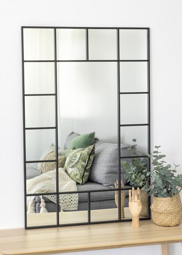 Αυτός ο κομψός καθρέφτης από την KAILA έχει ένα σχέδιο που θυμίζει ένα όμορφο παράθυρο. Στον καθρέφτη υπάρχουν διάφορα διαφορετικά πλαίσια που πλαισιώνουν όμορφα μια μεγαλύτερη επιφάνεια καθρέφτη στο κέντρο. Τα πλαίσια πλαισιώνονται όμορφα από λεπτές μαύρες μεταλλικές γραμμές που δίνουν στον καθρέφτη έναν ελαφρώς βιομηχανικό αλλά ταυτόχρονα κομψό χαρακτήρα. Υπάρχει στήριξη τοίχου για τοποθέτηση στον τοίχο, αλλά ο καθρέφτης μπορεί επίσης να κλίνει όμορφα κατά του τοίχου. Ο καθρέφτης μετράει 80x120 εκ.