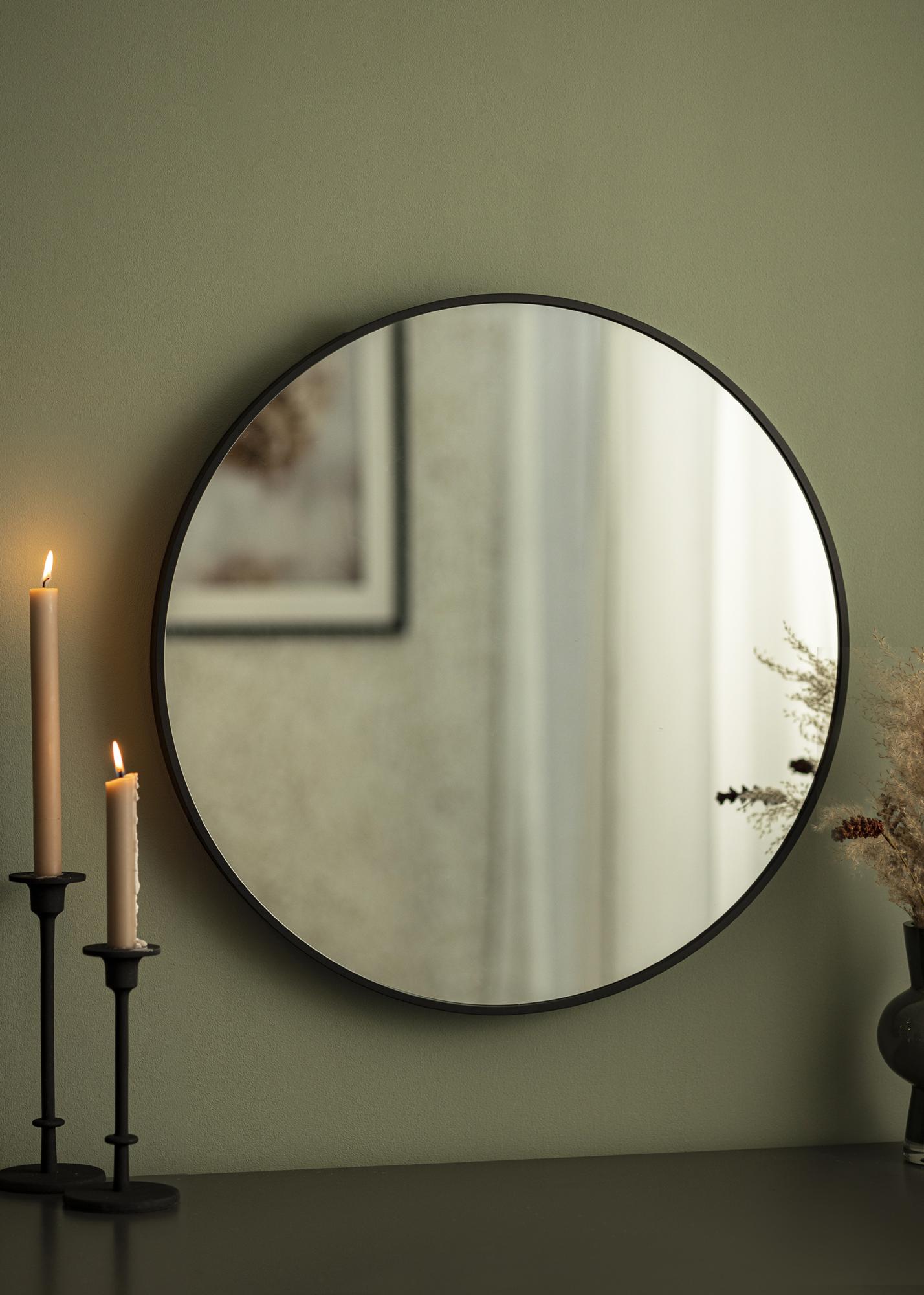 KAILA Στρογγυλός Καθρέπτης Edge Μαύρος είναι ένας στρογγυλός καθρέπτης με ένα κομψό λεπτό μεταλλικό πλαίσιο βαμμένο σε ματ μαύρο, το οποίο του δίνει μια βιομηχανική και μοντέρνα εμφάνιση. Το πλαίσιο έχει – ανάλογα με το μέγεθος – βάθος μεταξύ 30-40 χιλιοστών, που κάνει το γυαλί του καθρέφτη να προεξέχει λίγο από τον τοίχο, δημιουργώντας ένα εντυπωσιακό 3D εφέ. Το βάθος του πλαισίου κάνει επίσης τον καθρέπτη να φαίνεται στιβαρός διατηρώντας παράλληλα την μινιμαλιστική του εμφάνιση. Ένας τέλειος στρογγυλός καθρέπτης για να τοποθετηθεί σε οποιοδήποτε δωμάτιο όπου θέλετε να προσθέσετε λειτουργικότητα και κομψή σουηδική σχεδίαση!