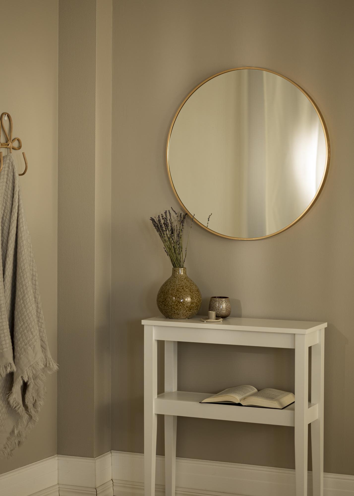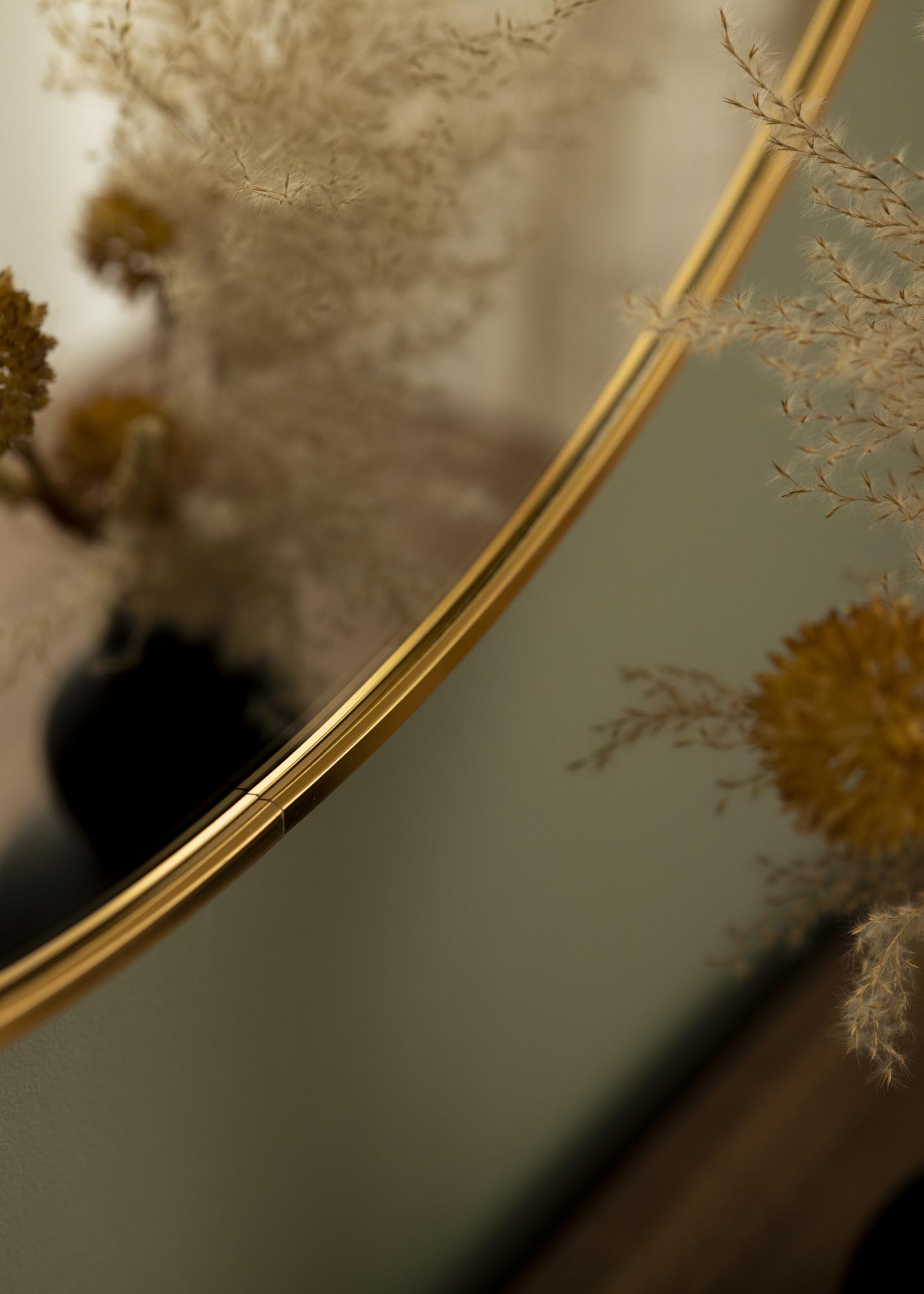 Ένας στρογγυλός καθρέφτης σε κομψό σκανδιναβικό σχέδιο με ένα μεταλλικό πλαίσιο σε όμορφη χρυσαφένια επίστρωση. Το πλαίσιο έχει μια βουρτσισμένη επιφάνεια, που δίνει στο όμορφο χρυσαφί χρώμα μια ελαφρώς ματ εμφάνιση. Το πλαίσιο είναι επίσης μοντέρνα λεπτό, αλλά ταυτόχρονα – ανάλογα με το μέγεθος – έχει βάθος μεταξύ 30-40 mm, το οποίο αναδεικνύει λίγο από τον τοίχο και δημιουργεί ένα εντυπωσιακό 3D εφέ. Το βάθος του πλαισίου κάνει επίσης τον καθρέφτη να φαίνεται στιβαρό και ανθεκτικό, χωρίς να αφαιρεί την μινιμαλιστική αίσθηση του καθρέφτη.