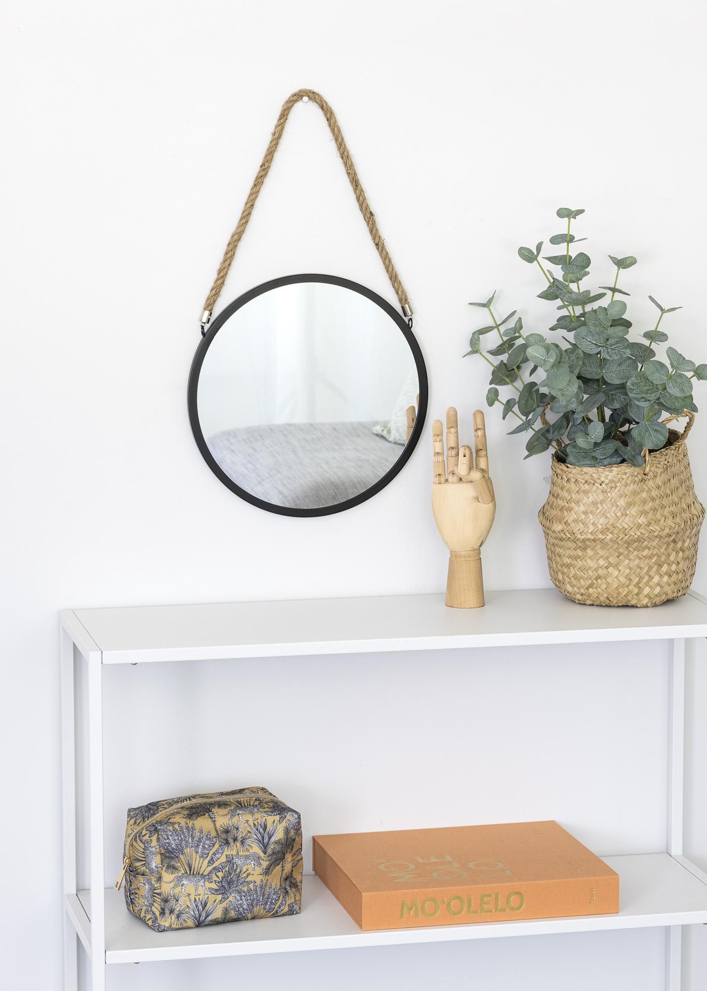 Εδώ είναι ένας στρογγυλός καθρέφτης τοίχου ιδανικός για εσάς που σας ελκύει μια ναυτική εμπνευσμένη διακόσμηση! Ο καθρέφτης είναι κατασκευασμένος από μέταλλο και διαθέτει διακοσμητικό σχοινί από κάνναβη για μια διακοσμητική ανάρτηση. Διατίθεται στήριγμα τοίχου. Το γυαλί του καθρέφτη πλαισιώνεται από μαύρο περίγραμμα που προσδίδει στον καθρέφτη κομψό βάθος. Ο καθρέφτης έχει διάμετρο 30 εκ.